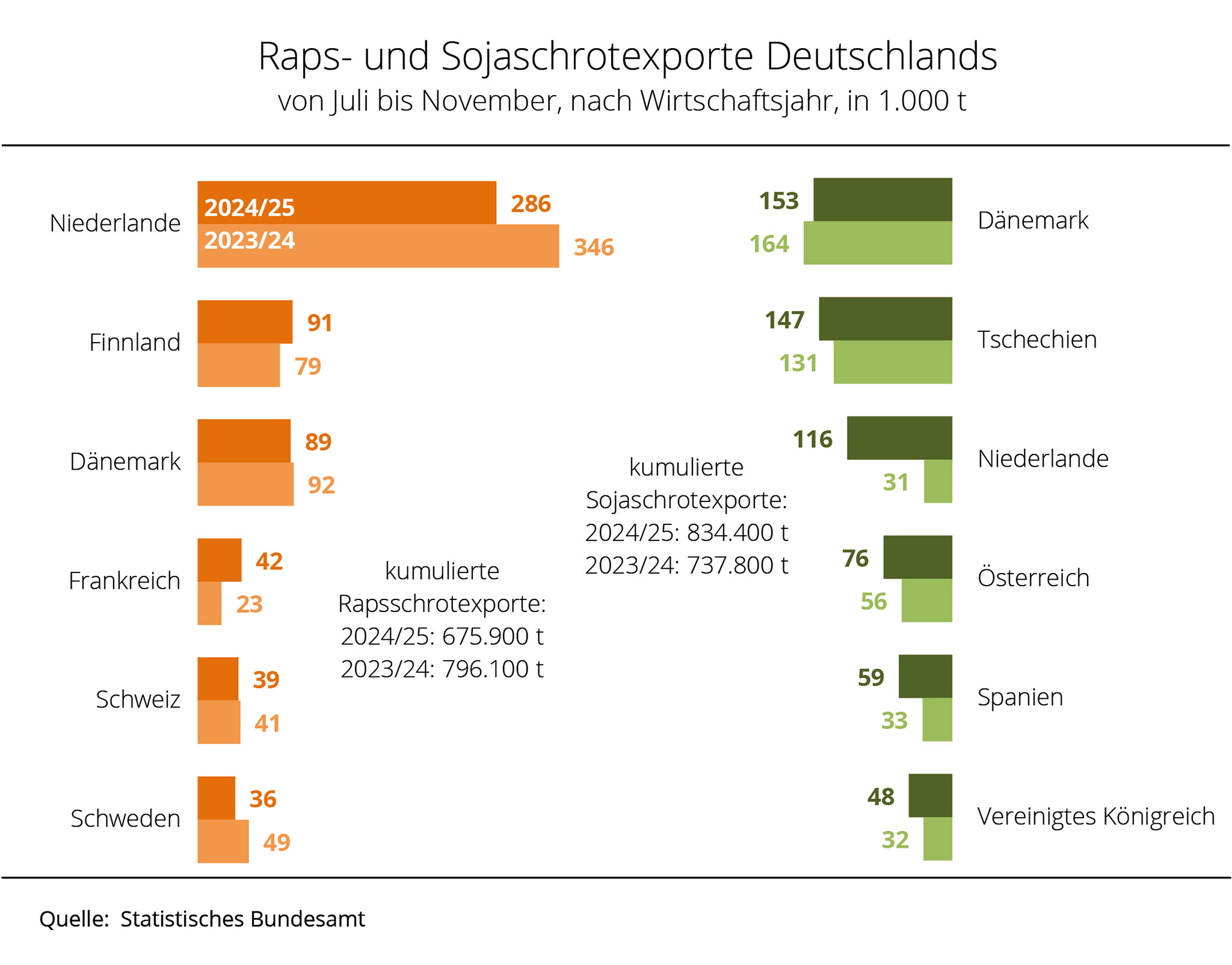 Das in Deutschland produzierte Raps- und Sojaschrot wird nach Recherchen der Agrarmarkt Informations-Gesellschaft (mbh) zum größten Teil in andere EU-Staaten exportiert. Wie in den Vorjahren sind die Häfen in den Niederlanden die Hauptabnehmer für die globale Verschiffung. Von Juli bis November 2025 wurden rund 200.000 t Rapsschrot in das Nachbarland verkauft, 30 % weniger als im Vorjahreszeitraum. Mit rund 87.600 t erhielt Dänemark 2 % weniger, klettert damit aber wieder auf Platz 2 der wichtigsten Abnehmer. Die Rapsschrotexporte in Richtung Schweden, Finnland und in die Schweiz blieben ebenfalls hinter dem Vorjahr zurück. Nach Frankreich lieferte Deutschland mit 42.000 t nur marginal weniger als in den ersten fünf Monaten des Wirtschaftsjahres 2024/25.