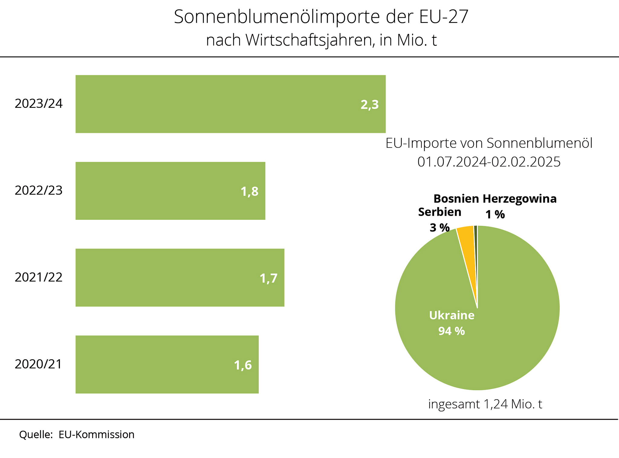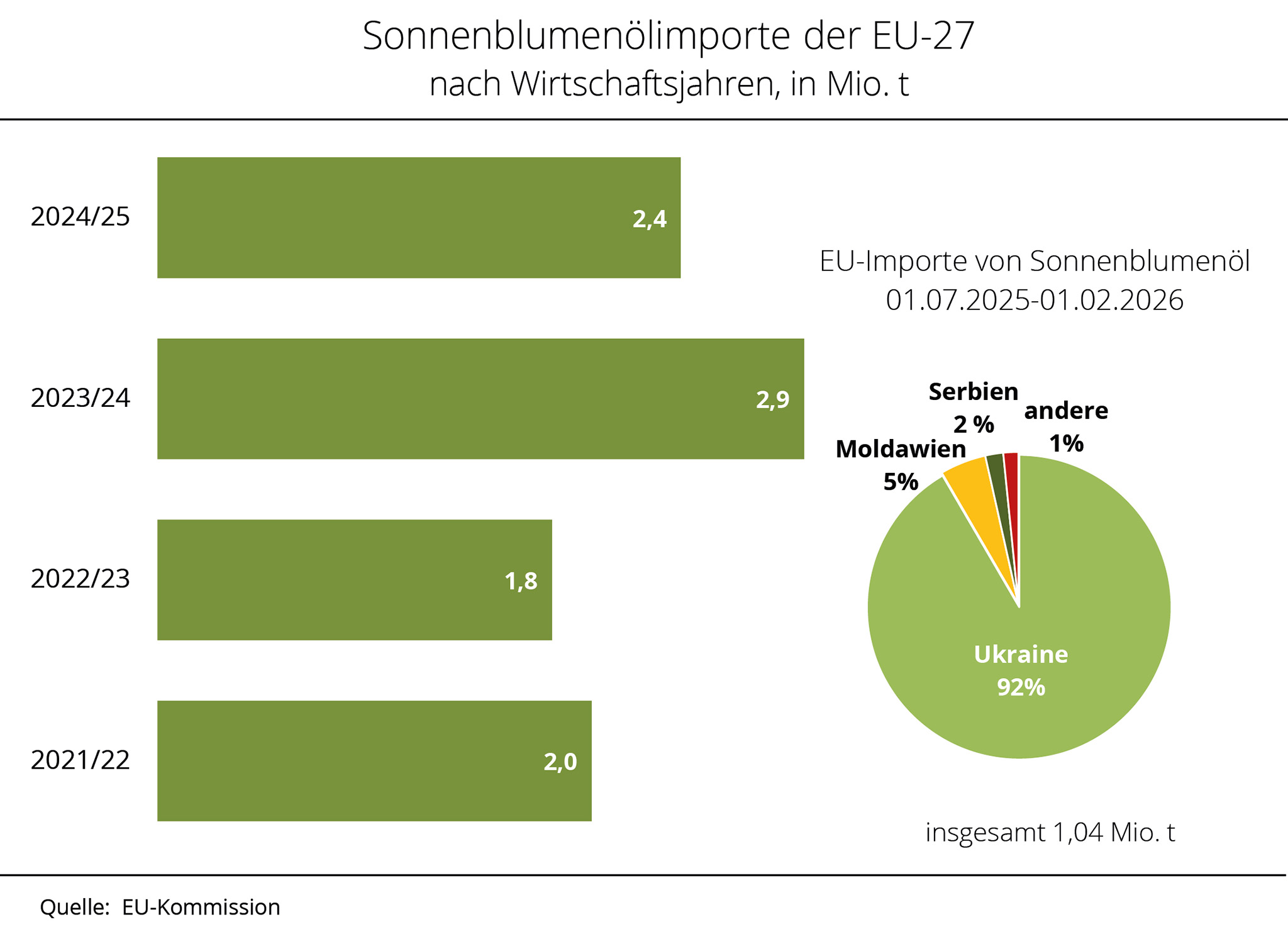 Vom 01.07.2025 bis zum 01.02.2026 importierte die EU-27 knapp 1,04 Mio. t Sonnenblumenöl und damit weniger als die 1,28 Mio. t zum Vorjahreszeitpunkt. Mit großem Abstand steht die Ukraine an der Spitze der Herkunftsländer. Bislang konnte das Land rund 0,95 Mio. t Sonnenblumenöl am EU-Markt platzieren. Nach Recherchen der Agrarmarkt Informations-Gesellschaft (mbH) entspricht das einem Marktanteil von knapp 92 %. Die Vorjahresmenge von 1,2 Mio. t wird aber deutlich verfehlt. Grund hierfür ist ein kleineres Rohstoffangebot.