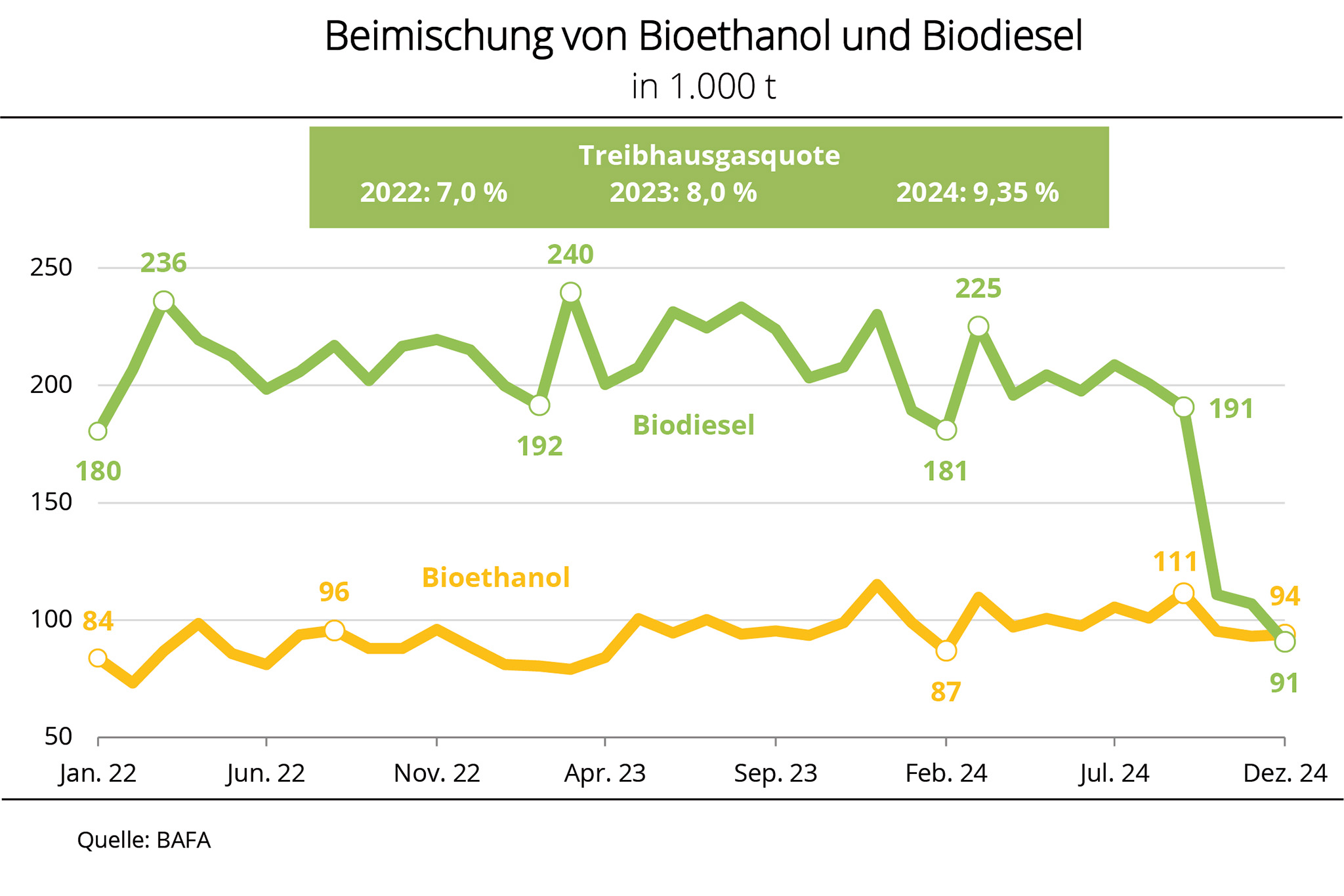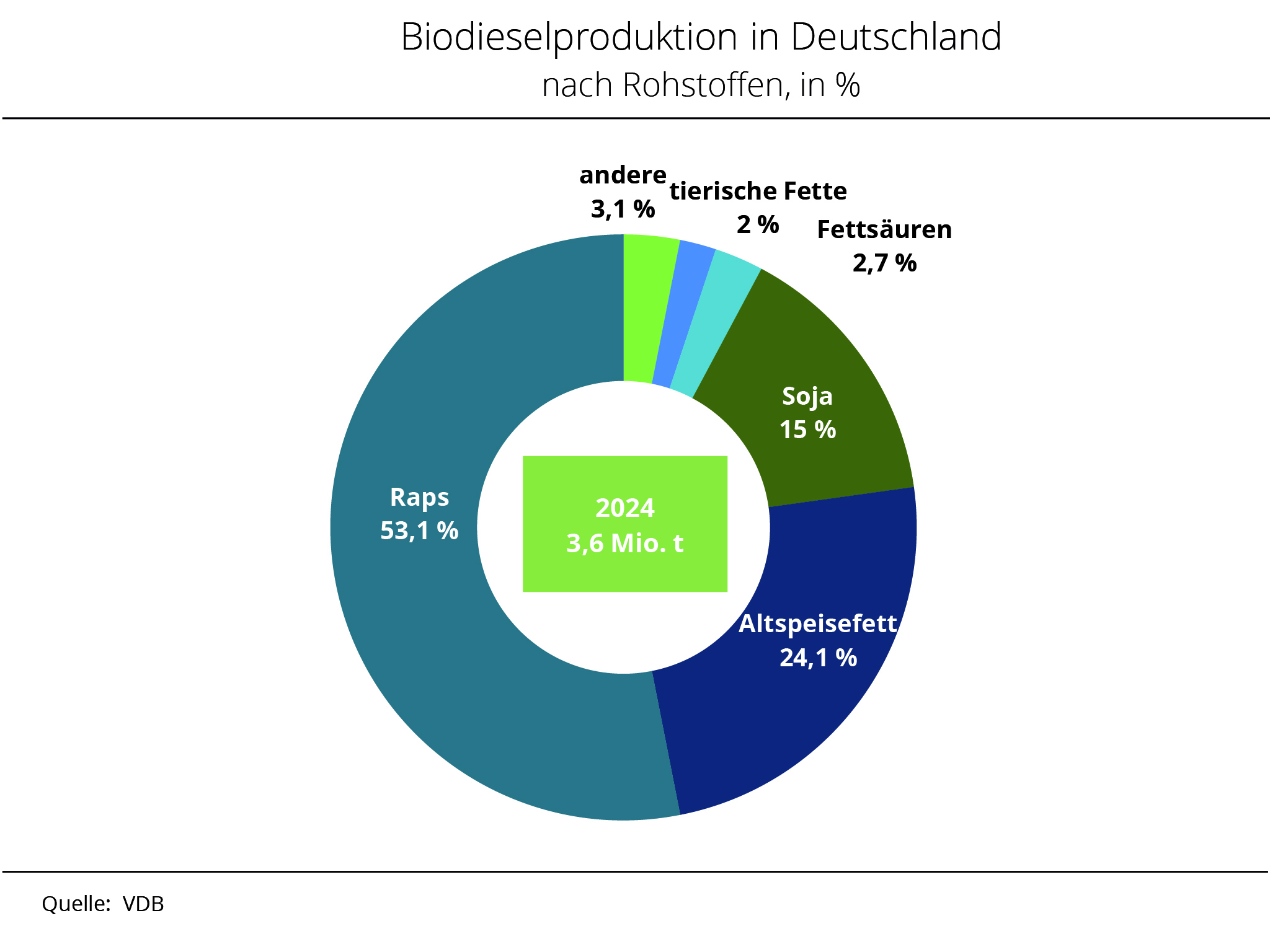 Die Exporte von Biodiesel aus Deutschland sind nach Angaben des Statistischen Bundesamtes 2025 im Vergleich zum Rekordvolumen im Vorjahr (3,22 Mio. t) um rund 11 % auf etwa 2,90 Mio. t gesunken. Der Nettoexport verringerte sich um 0,47 Mio. t auf 1,14 Mio. t. Die Union zur Förderung von UFOP kritisiert, dass damit auch Potenzial zum Klimaschutz im Verkehr exportiert wird und fordert daher Anpassungen im Rahmen des laufenden parlamentarischen Verfahrens zum THG-Quotengesetz.