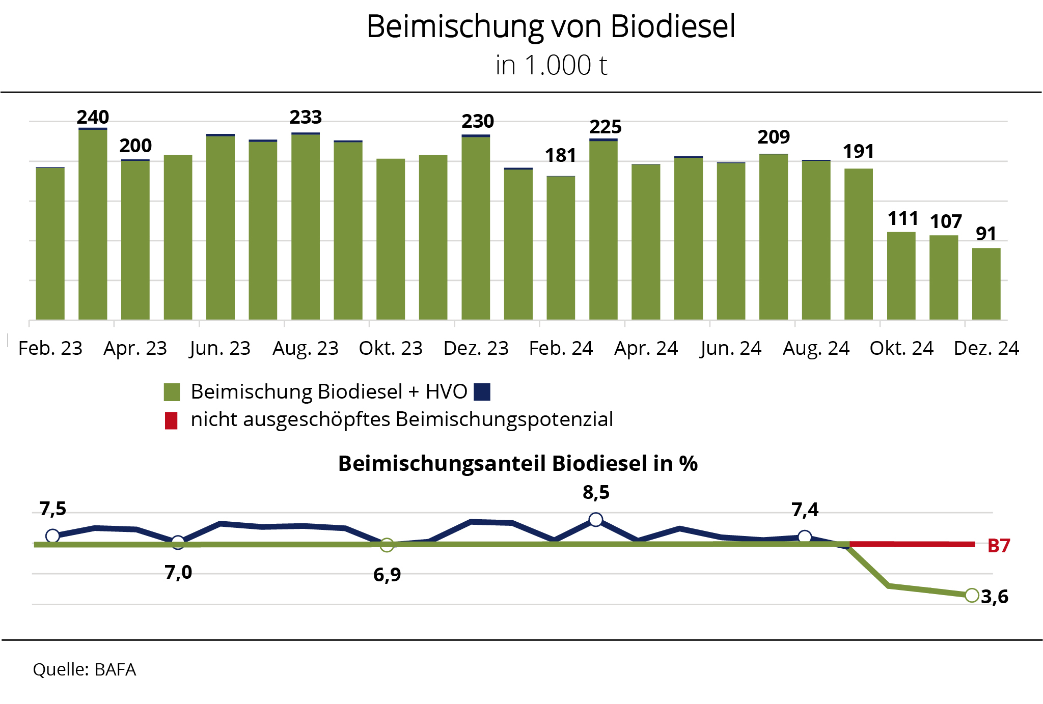 Die Union zur Förderung von Oel- und Proteinpflanzen (UFOP) weist darauf hin, dass die Norm für Dieselkraftstoff, DIN EN 590, den Biodieselanteil auf 7 Volumenprozent begrenzt. Der diese Vorgabe überschreitende Beimischungsanteil ist Hydriertes Pflanzenöl (HVO). Diese Mengen werden vom zuständigen Bundesamt für Wirtschaft und Ausfuhrkontrolle (BAFA) nach wie vor nicht ausgewiesen, kritisiert der Verband.