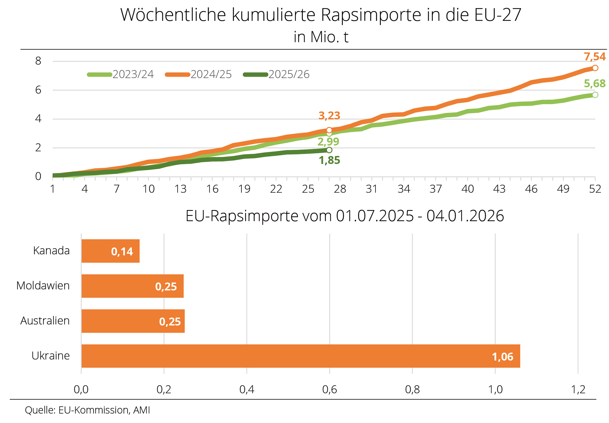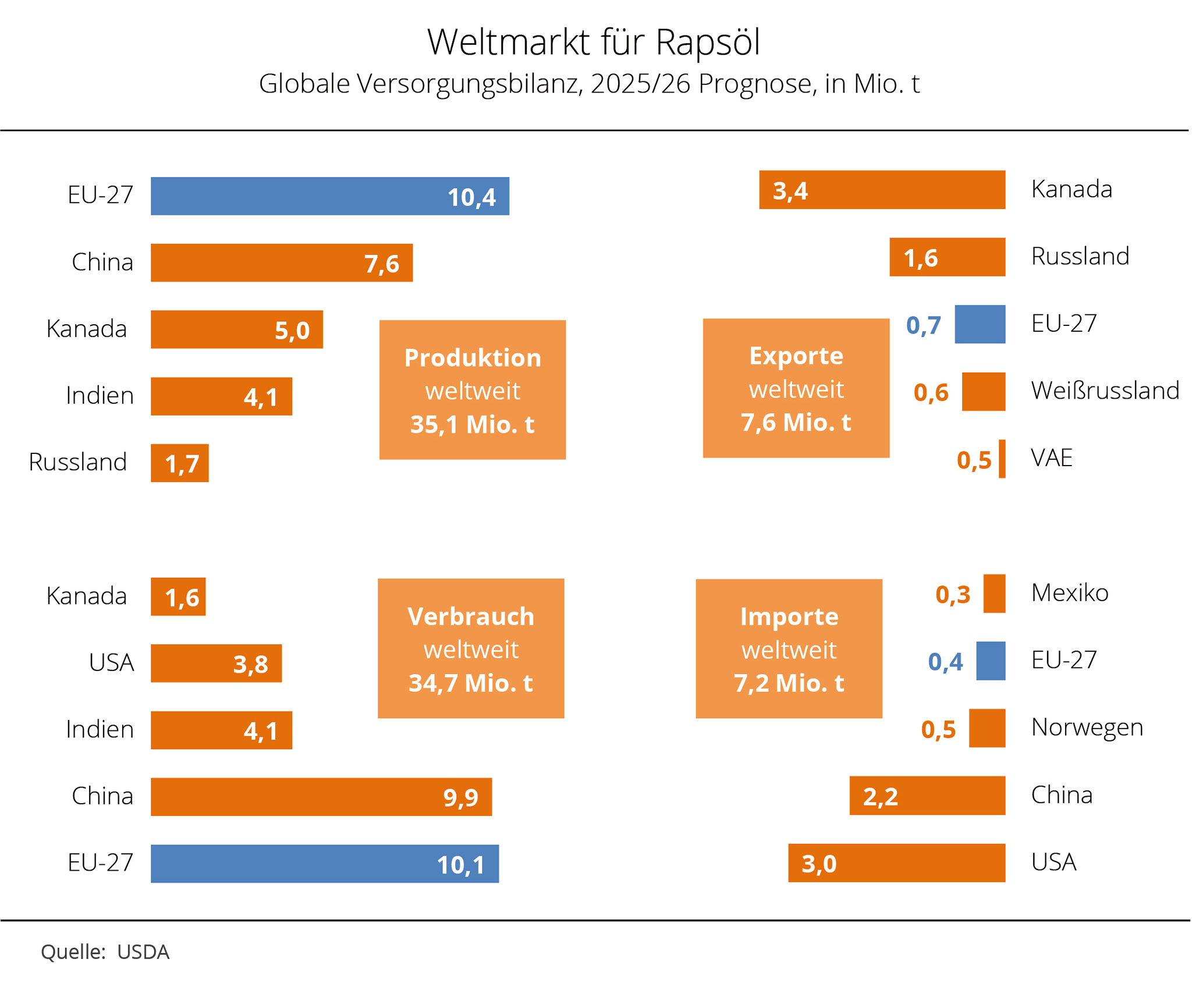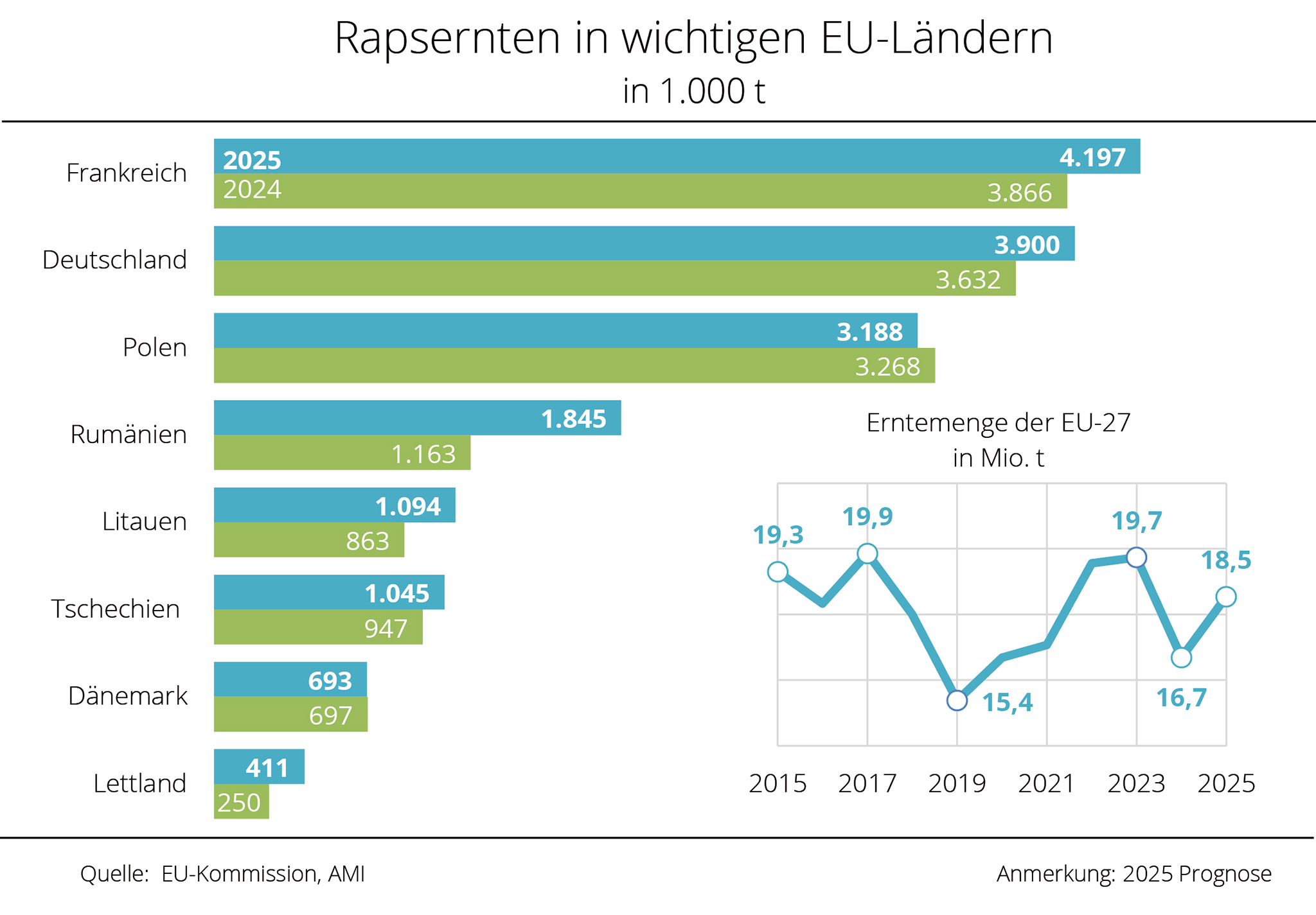 Nach Schätzung der EU-Kommission belief sich die Rapsernte 2025 in der EU-27 auf insgesamt rund 20,16 Mio. t. Gegenüber dem Vorjahr mit unterdurchschnittlichen 16,77 Mio. t bedeutet dies eine deutliche Ausweitung des Angebots. Vor dem Hintergrund einer erwarteten Rapsverarbeitung von rund 24,68 Mio. t ist die EU damit weniger stark auf Importe angewiesen.