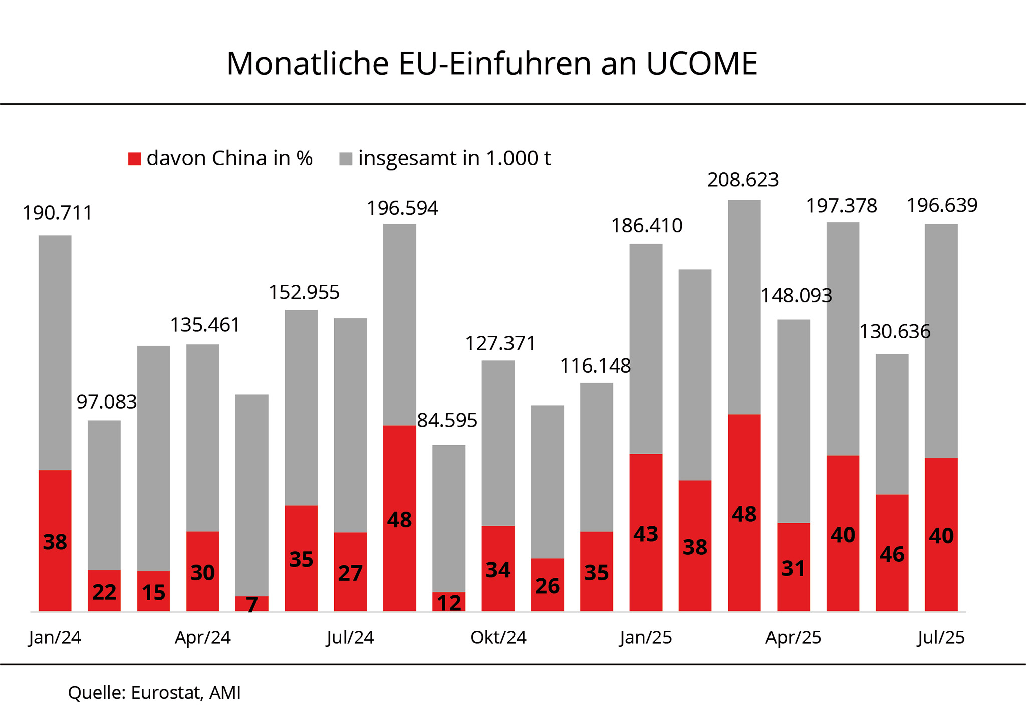 Die EU importierte zwischen Juli 2025 und Anfang März 2026 weniger Palmöl als im Vorjahreszeitraum, was den insgesamt rückläufigen innergemeinschaftlichen Verbrauch widerspiegelt. Die UFOP begründet dies mit dem für 2030 vorgesehenen und von einigen Mitgliedstaaten bereits vollzogenen Ausschluss der Anrechnung von Biokraftstoffen aus Palmöl auf nationale Quotenverpflichtungen. Die UFOP warnt jedoch vor einem Unterlaufen dieser Regelung durch Importe von POME (Palm Oil Effluent).