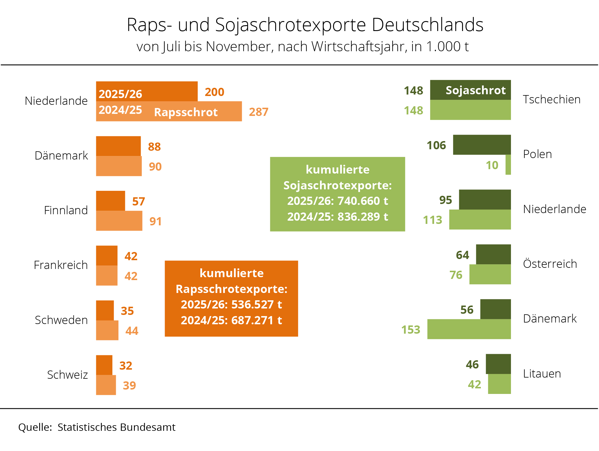 Nach Angaben des Statistischen Bundesamtes lag der Export von Sojaschrot aus deutschen Ölmühlen im Zeitraum Juli bis November 2025 mit 741.000 t um 11 % unter den Ausfuhren im Vergleichszeitraum 2024. Gleichzeitig wurden mit 537.000 t auch 22 % weniger Rapsschrot am Weltmarkt platziert.