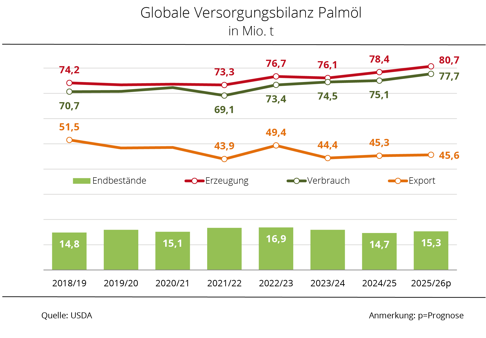 Nach aktuellen Angaben des US-Landwirtschaftsministeriums (USDA) wird die globale Palmölerzeugung 2025/26 auf den Rekordwert von 80,7 Mio. t steigen und das Vorjahresniveau damit um 3 % übertreffen.