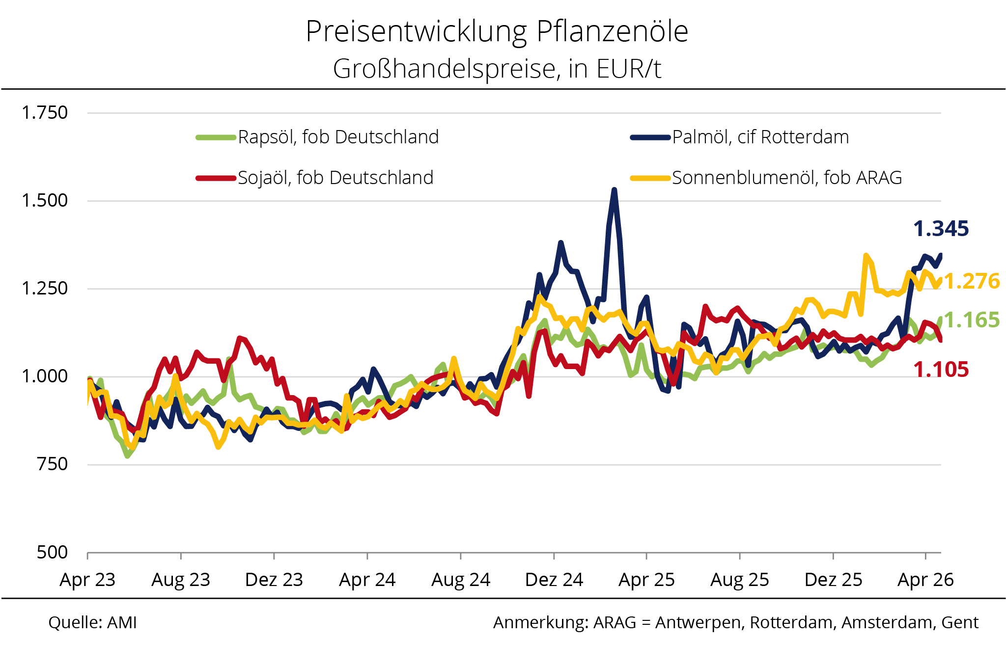 Das Niveau konnte im weiteren Verlauf jedoch nicht gehalten werden, sodass die Preise zuletzt auf rund 1.105 EUR/t gefallen sind. Für Rapsöl wurden am 21.04.2026 rund 1.165 EUR/t genannt, knapp 18 % mehr als zum Vorjahreszeitpunkt. Dabei bleibt die Nachfrage insgesamt verhalten. Marktteilnehmer agieren vorerst zurückhaltend und warten die weiteren Entwicklungen ab. Auch das zunehmend knappe Angebot an Rapsölraffinat vermag derzeit keine zusätzlichen Kaufimpulse zu setzen.