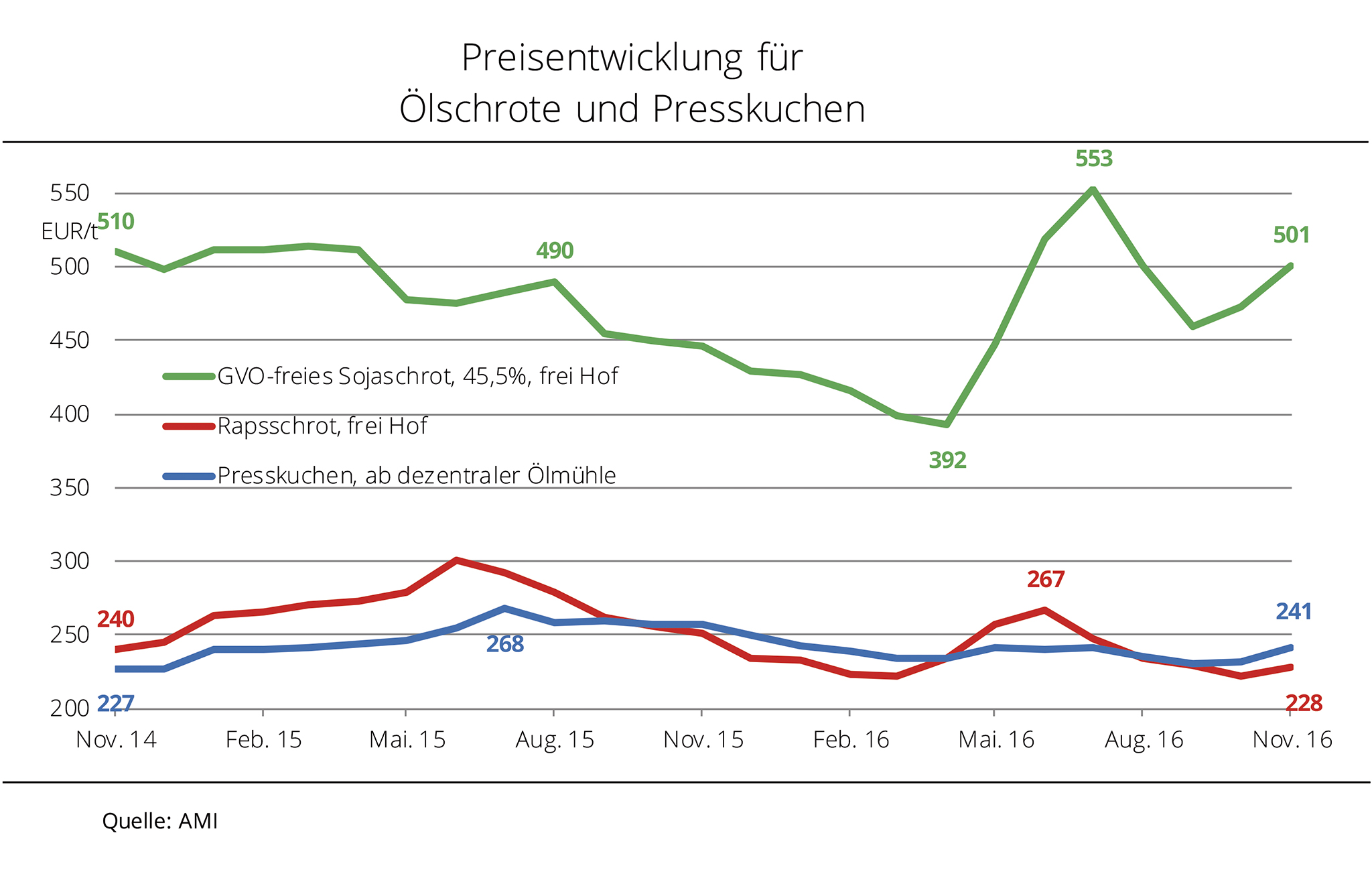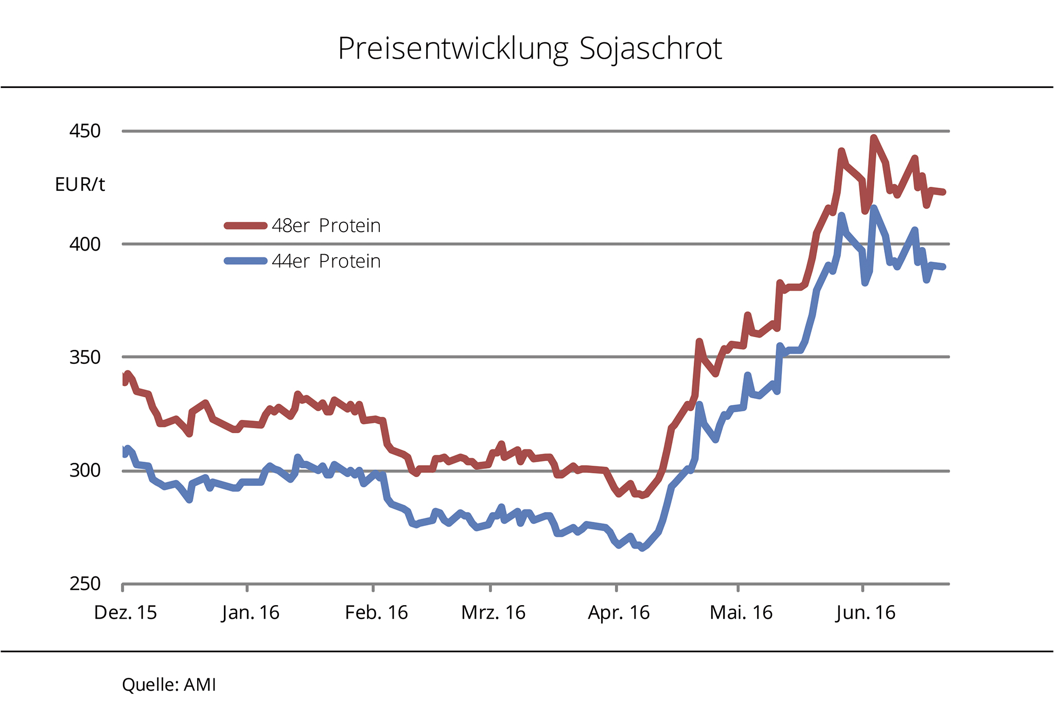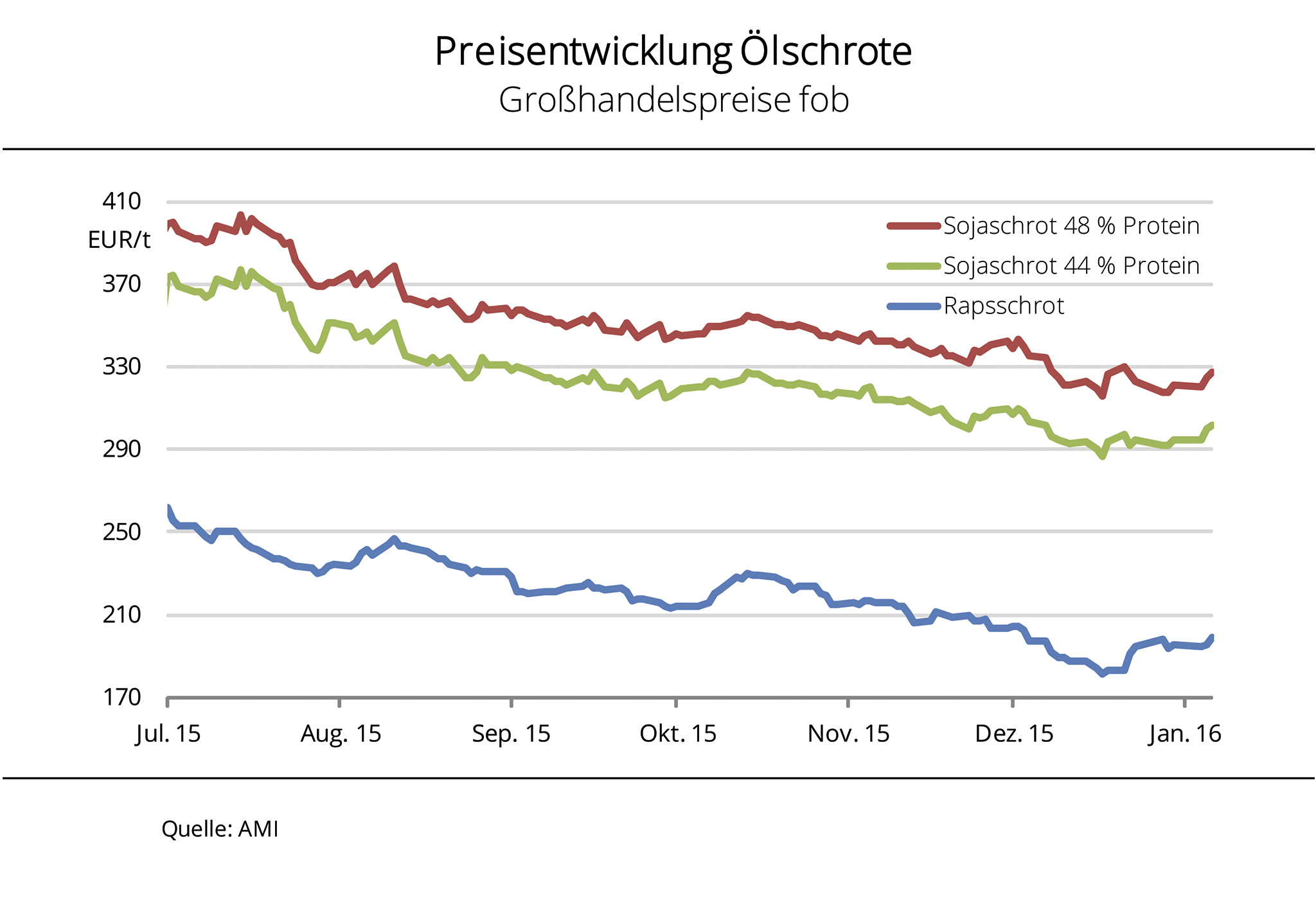 Die Preise für Sojaschrot und Rapsschrot haben sich nach monatelangem Abwärtstrend Ende Dezember 2015 gefangen. Der Druck ist jedoch weiterhin groß. Anfang Dezember 2015 hatten ein überreichliches Angebot und geringe Nachfrage die Ölschrotpreise am Kassamarkt auf ein 4-Jahrestief fallen lassen. Rapsschrot kostete fob Ölmühle zeitweise nur rund 180 EUR/t, Sojaschrot in 44er-Qualität näherte sich der Marke von 290 EUR/t fob Hamburg. Kurz vor Weihnachten wurde der Abwärtstrend im Zuge steigender Rohstoffkurse in Paris und Chicago nach Angaben der Agrarmarkt Informations-Gesellschaft (mbH) gestoppt. Ein zeitweise schwächelnder Euro gab den Preisen für importiertes Sojaschrot zusätzlichen Auftrieb. Die Forderungen stiegen jüngst auf ein 1-Monatshoch. Langfristig ist die Preistendenz im Hinblick auf ein globales Rohstoffangebot in Rekordhöhe aber schwach. Rapsschrot näherte sich zuletzt, trotz weiterhin auf vordere Termine beschränkter Nachfrage, der Marke von 200 EUR/t.