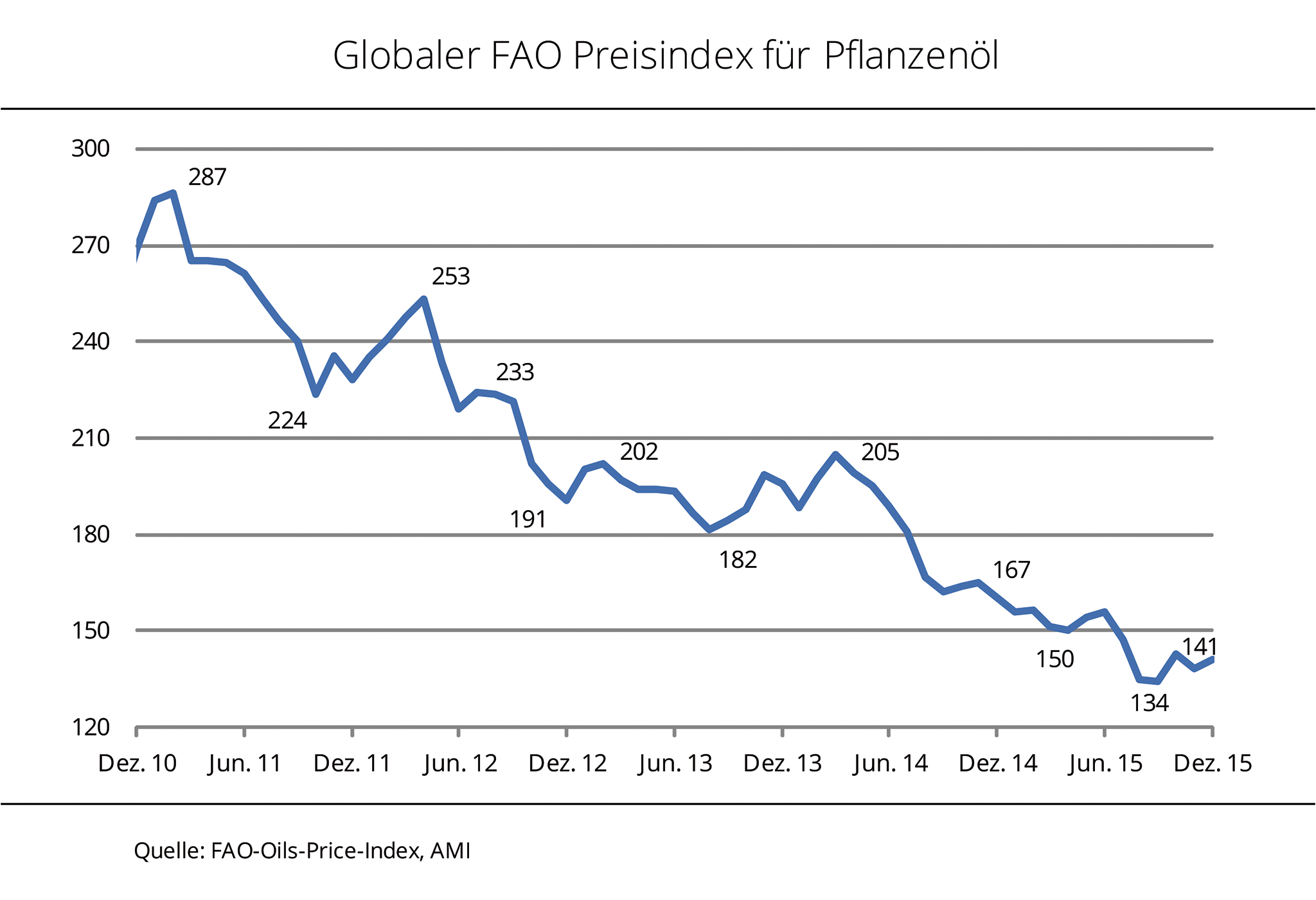 Der Pflanzenölpreisindex der Ernährungs- und Landwirtschaftsorganisation der Vereinten Nationen (FAO) ist im Dezember 2015 zwar um 2 % gestiegen, bleibt aber auf 9-Jahrestief. Und dies trotz gestiegener Biodieselproduktion. Im Dezember 2015 war dem Abwärtstrend vorerst Einhalt geboten. Für Auftrieb sorgten höhere Sojaölkurse, die im Hinblick auf ein kleineres globales Rohstoffangebot und anziehender Nachfrage ein 6-Monatshoch erreichten. Gleichzeitig haben sich die Kurse für Palmöl, dem wichtigsten Pflanzenöl, stabil entwickelt. Anhaltende Befürchtungen um witterungsbedingte Produktionseinbußen in Südostasien hatten nach Angaben der Agrarmarkt Informations-Gesellschaft mbH (AMI) die schwache Nachfrage ausgeglichen. Mit 141 Punkten lag der Index im Dezember dennoch ein Fünftel unter Vorjahresniveau. Der FAO Preisindex stellt die Preisentwicklung für 10 verschiedene Pflanzenöle am Weltmarkt dar, gewichtet nach ihrem Anteil am Welthandel.