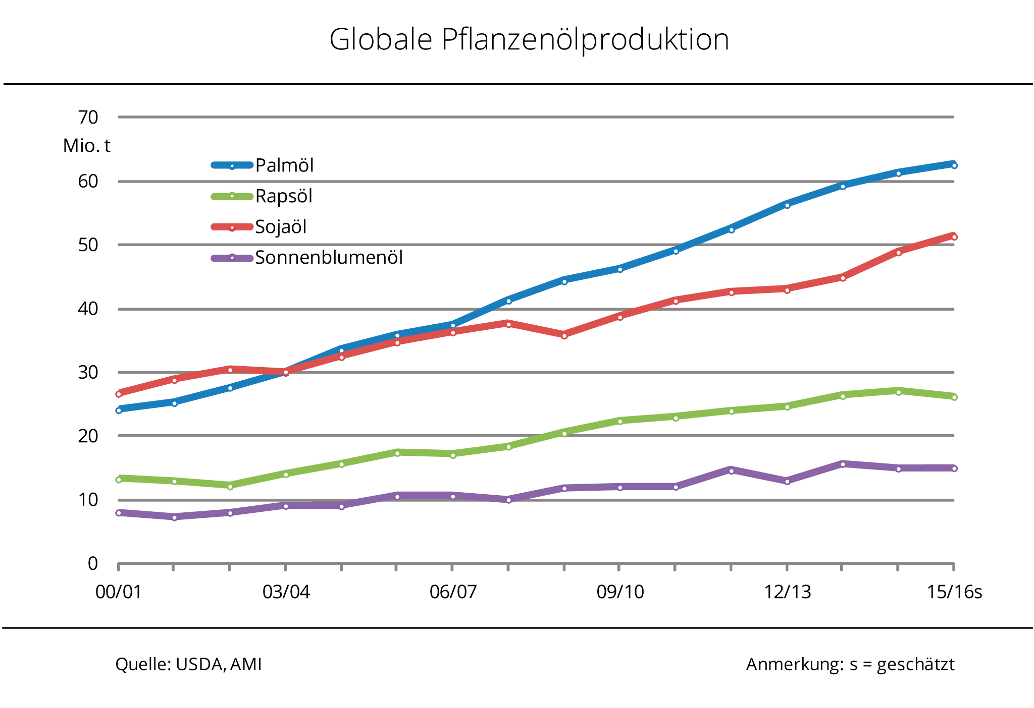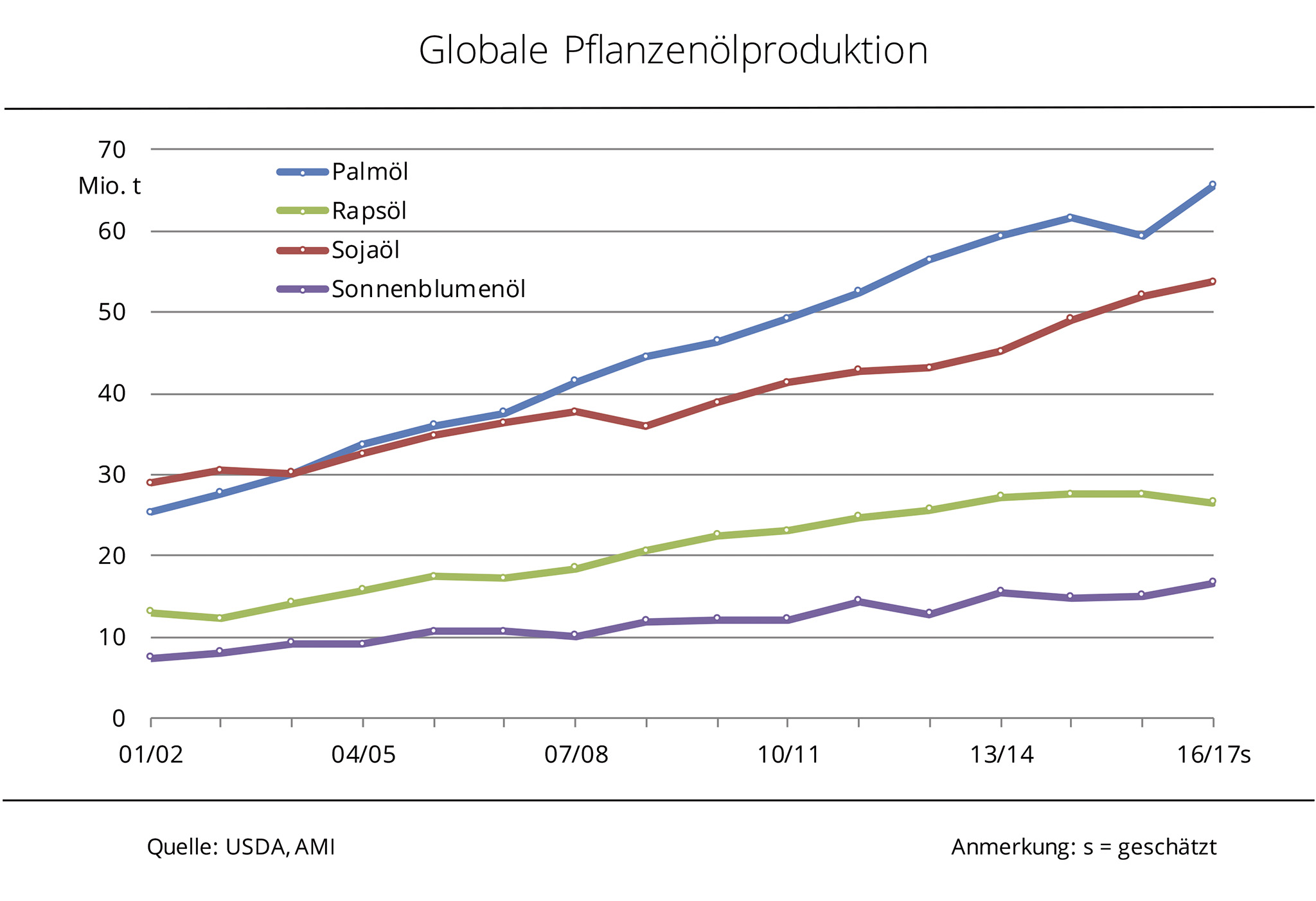 Rund 87 % davon entfallen auf Palm-, Soja-, Raps- und Sonnenblumenöl, der Rest setzt sich unter anderem aus Kokosnuss-, Oliven- und Erdnussöl zusammen. Den deutlichsten Produktionsanstieg verzeichnen 2016/17 Palm- und Sonnenblumenöl, mit einem Plus von etwa 10 % zum Vorjahr. Die Palmölerzeugung erholt sich damit nach dem deutlichen Einbruch 2015/16, ausgelöst durch das Klimaphänomen El Niño, und strebt einen Rekord an. Sojaöl wird schätzungsweise 3 % mehr als im Vorjahr produziert und erreicht damit ebenfalls Rekordniveau. Rückläufig ist mit geschätzten 26,6 Mio. t nur die Herstellung von Rapsöl. Grund dafür ist nach Angaben der Agrarmarkt Informations-Gesellschaft mbH ein global deutlich knapperes Rohstoffangebot als im Vorjahr.