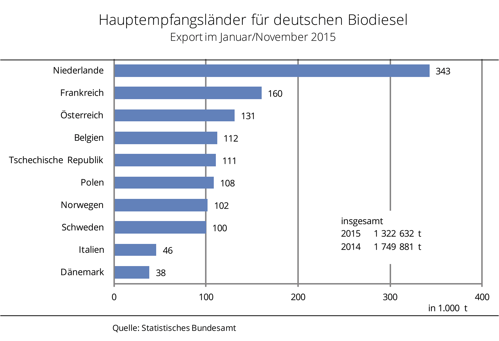 In den ersten 11 Monaten 2015 exportierte Deutschland fast ein Viertel weniger Biodiesel als im Vorjahreszeitraum. Dies belegen die Außenhandelszahlen des Statistischen Bundesamtes. Gut 90 % der Menge gingen in EU-Mitgliedsstaaten.