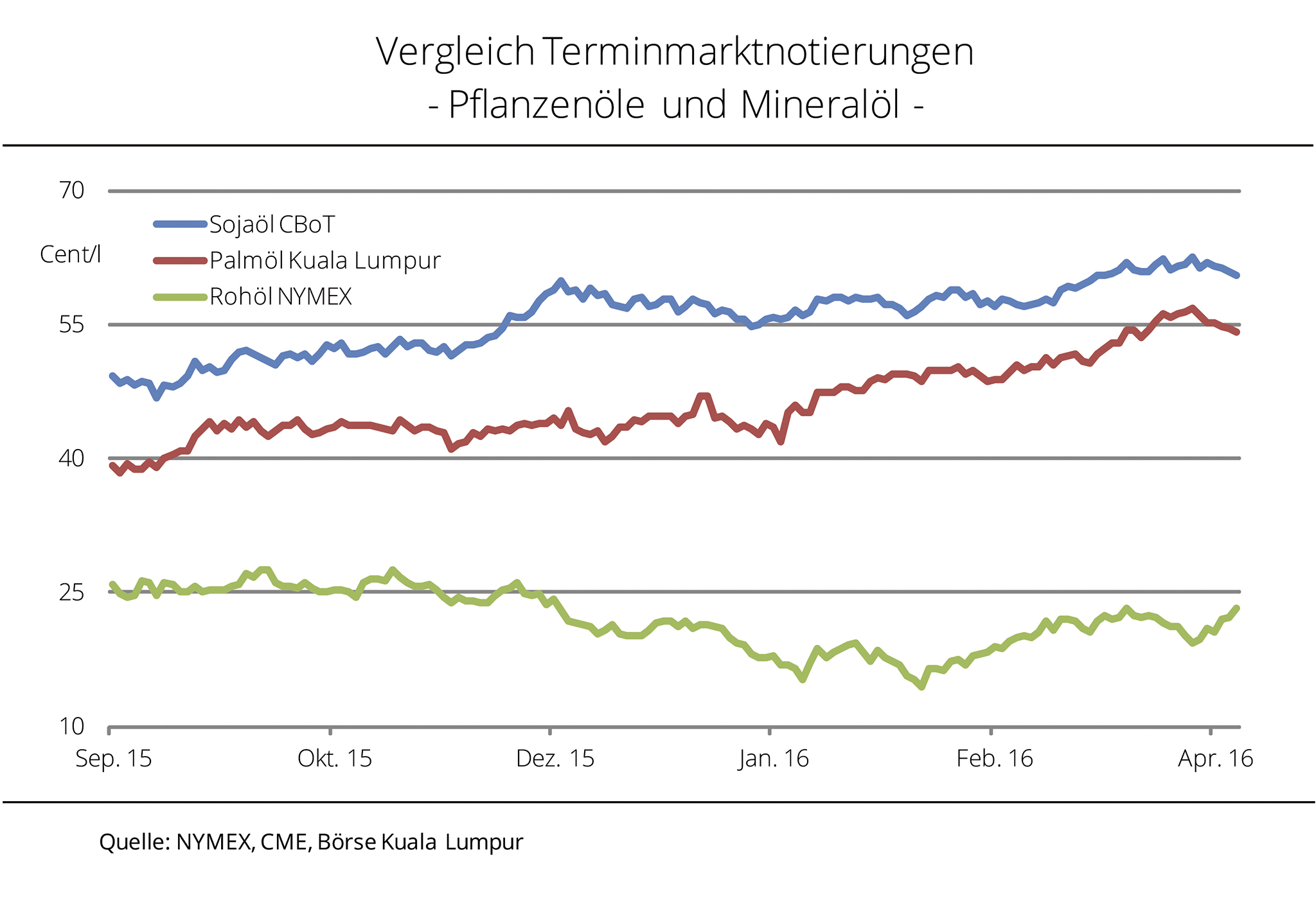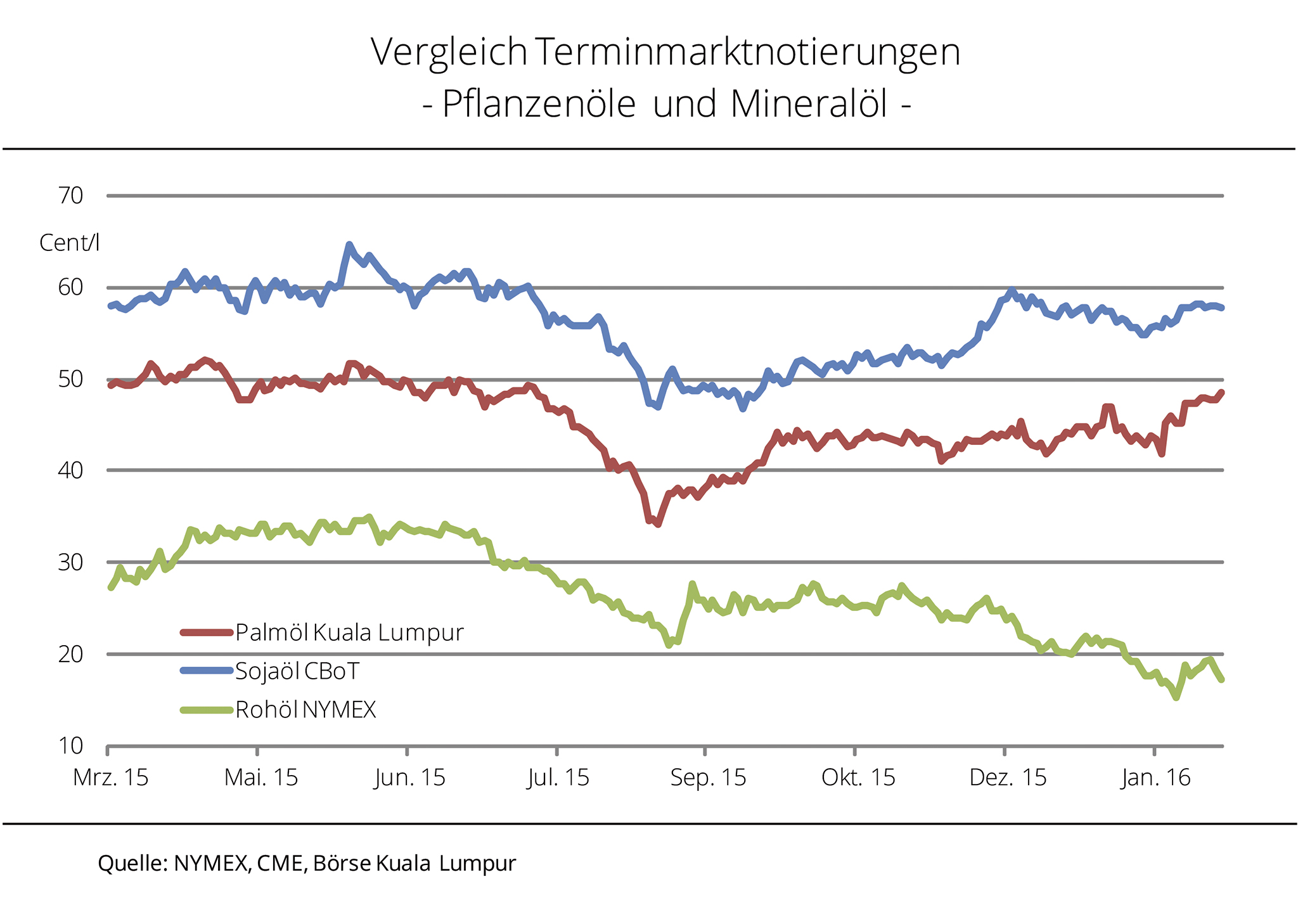 Das globale Überangebot setzt die Rohölkurse am Terminmarkt unter starken Druck. Kurstreibende Impulse wirken meist nur kurzfristig. Ende Januar 2016 kletterten die Notierungen an der NYMEX zwar zeitweise wieder über der Marke von 30 USD je Barrel, bleiben aber auf dem niedrigsten Niveau seit 12 Jahren. Die Palmölkurse profitieren nach Angaben der Agrarmarkt Informations-Gesellschaft mbH (AMI) weiterhin von den Befürchtungen um Produktionseinbußen in Südostasien aufgrund des Witterungsphänomens El Niño. Die Sojaölnotierungen in Chicago konnten bei festen Rohstoffkursen ebenfalls Gewinne verzeichnen.