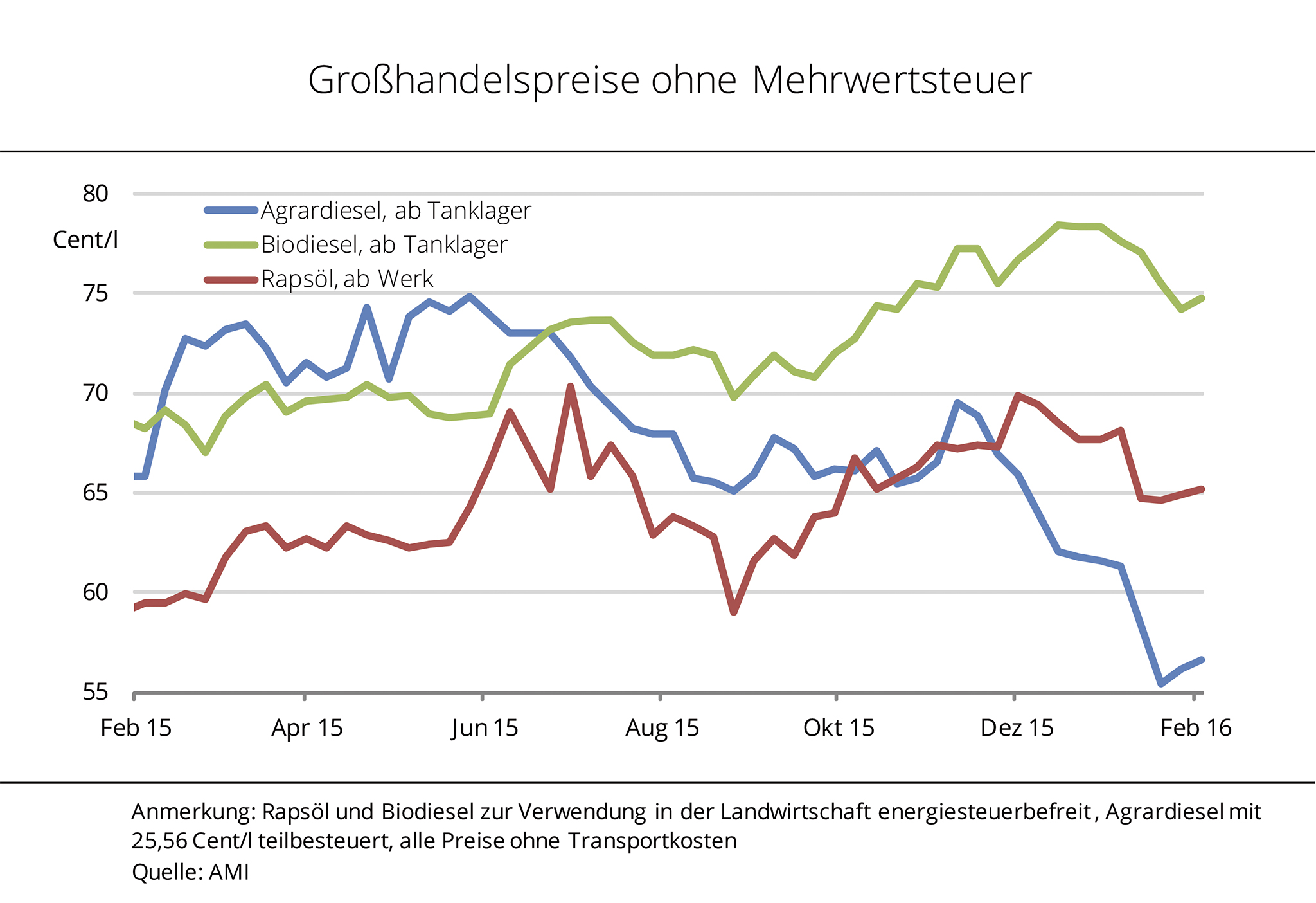 Schwache Rohölkurse halten die Preise für mineralischen und demzufolge auch für Agrardiesel auf niedrigem Niveau. Die Biodieselpreise zogen bei steigenden Rohstoffkosten derweil gegenüber Vorjahr an. Anfang Februar 2016 kostet mineralischer Diesel im Großhandel ohne Energiesteuer rund 31 Cent/l. Das sind nach Angaben der Agrarmarkt Informations-Gesellschaft mbH (AMI) fast 10 Cent/l weniger als im Februar 2015 und entspricht einem 11-Jahrestief. Unter Berücksichtigung der für die Landwirtschaft geltenden Rückerstattung kostet Agrardiesel aktuell rund 57 Cent/l und damit 18 Cent/l weniger als steuerbegünstigter Biodiesel.