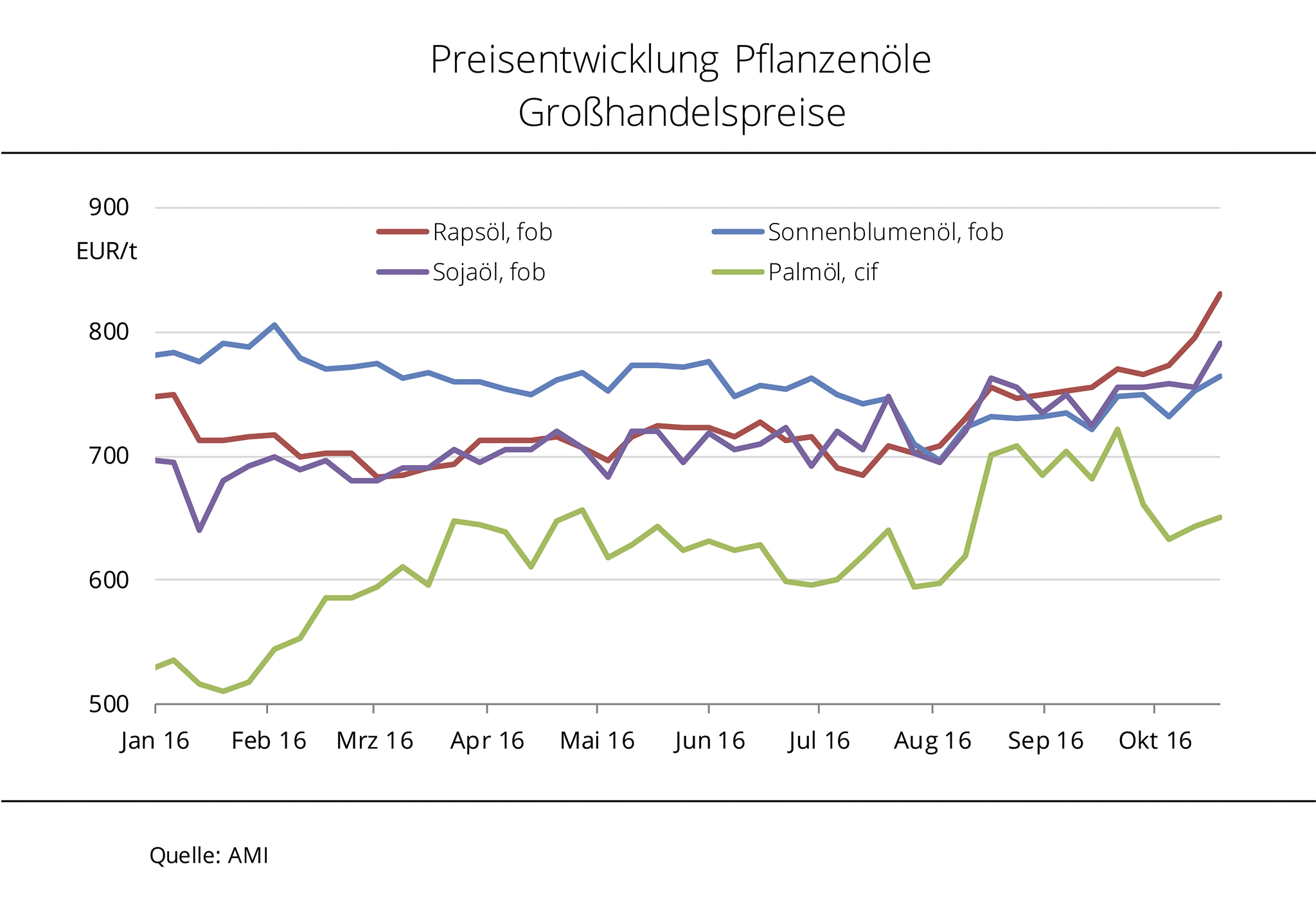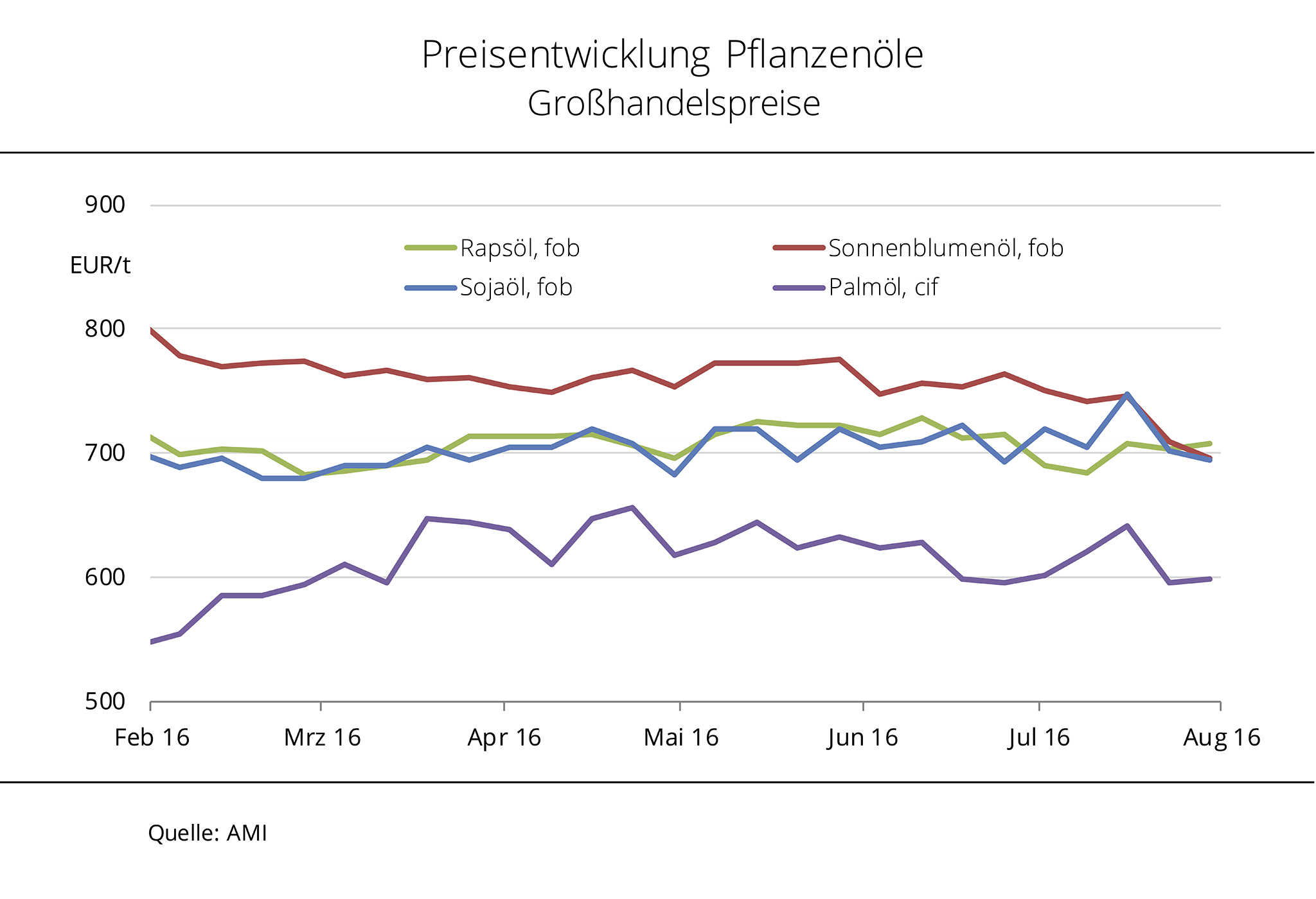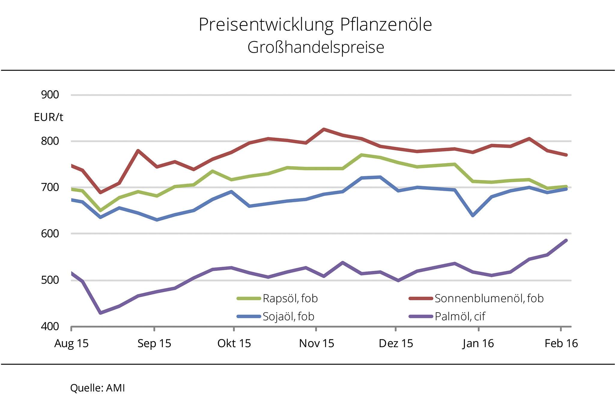 Die Preise für Raps- und Sojaöl nähern sich wieder an. Palmöl ist weiterhin preisgünstig, aufgrund des kräftigen Preisanstiegs in den vergangenen Wochen hat sich der Abstand gegenüber den anderen Pflanzenölen aber deutlich verringert. Weil die Sojaölpreise am europäischen Pflanzenölmarkt mit der Befestigung der Rohstoffkurse in Chicago Mitte Februar 2016 gestiegen sind, liegen sie fast wieder gleichauf mit den Rapsölpreisen. Mit 702,50 EUR/t kostete Rapsöl zur vorderen Lieferung fob Hamburg zuletzt noch 6,50 EUR/t mehr. Deutlich angenähert haben sich auch die Palmölpreise, nachdem sie in den vergangenen Wochen um fast 10 % zugelegt haben. Mit 116 EUR/t war die Differenz zu Rapsöl zuletzt halb so groß wie zu Jahresanfang. Ausgelöst wurde die Palmölpreisrallye von den Aussichten auf ein begrenztes Angebot der Haupterzeugungsländer 2016 aufgrund ungünstiger Vegetationsbedingungen durch El Niño. Das trieb die Palmölkurse in Kuala Lumpur zeitweise auf ein 21-Monatshoch.