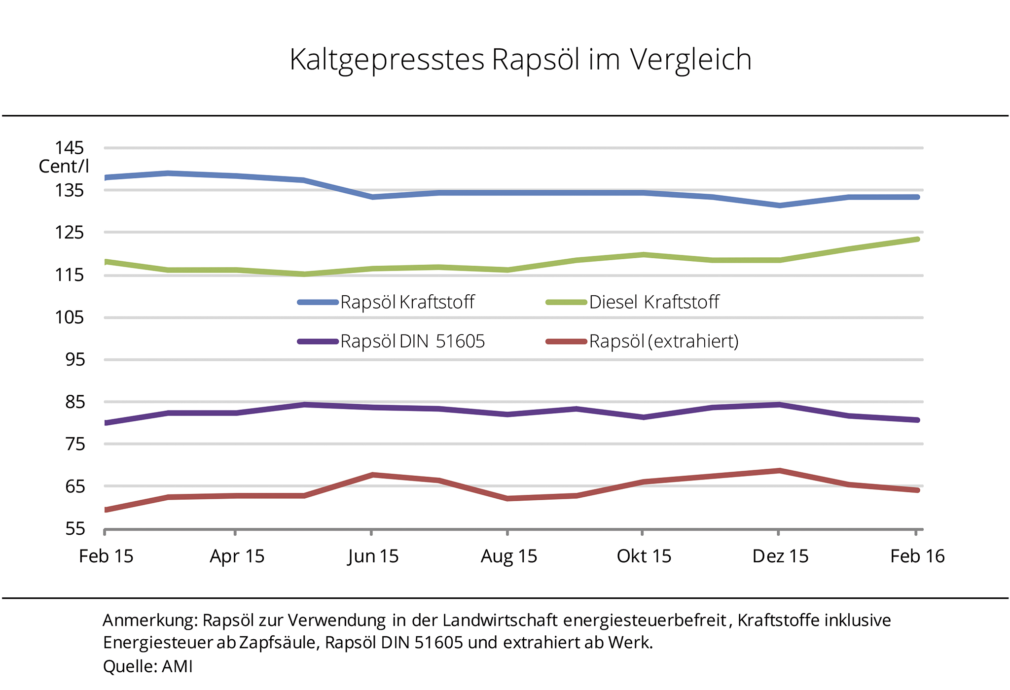 Kaltgepresstes Rapsöl als reiner Kraftstoff ist bei den stark gesunkenen Dieselpreisen kaum noch konkurrenzfähig. Mit der Verteuerung von Palmöl wurde aber wieder mehr für die Strom- bzw. Wärmeerzeugung nachgefragt. Im Februar 2016 wurden wieder Rapsöl-Partien an Blockheizkraftwerke (BHKW) verkauft, nachdem die Preise für konkurrierendes Palmöl kräftig gestiegen waren. Die Abgabepreise der dezentralen Ölmühlen für kaltgepresstes Rapsöl wurden nach Angaben der Agrarmarkt Informations-Gesellschaft (mbH) im Februar 2016 erneut leicht reduziert. Mit durchschnittlich 79,90 Cent/l netto kostete kaltgepresstes Rapsöl ab dezentraler Mühle etwas weniger als im Vormonat. Damit hat sich die Konkurrenzfähigkeit gegenüber mineralischem Diesel etwas verbessert. Dieser legte im Februar immerhin um knapp 2 % zu. Der schwindende Absatz von Rapsöl als Kraftstoff wird auch von den Verbrauchszahlen der BAFA dokumentiert, die für 2015 rund 2.000 t auswiesen. Das ist nicht einmal mehr die Hälfte des Vorjahresvolumens.