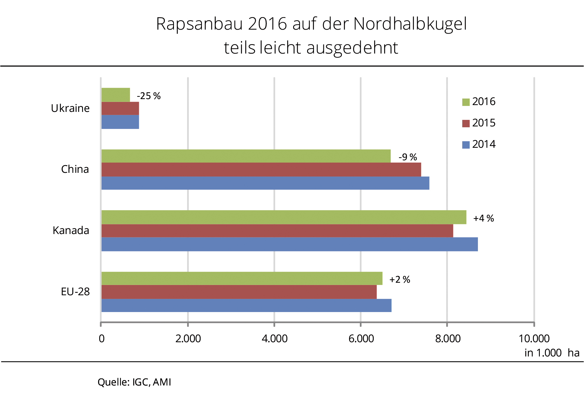 Auf der Nordhalbkugel ist Winterraps seit Monaten im Boden und zeigt nun, wie er den Winter überstanden hat. Dabei waren die Schäden in diesem Jahr nur in einigen Regionen stärker als üblich. In einigen Ländern stand bereits die Aussaat unter keinem guten Stern. So wird vor allem in der Ukraine zur Ernte 2016 eine deutlich geringere Rapsfläche prognostiziert. Trockenheit hatte die Aussaat empfindlich beeinträchtigt und auch für einen überdurchschnittlichen Ausfall über den Winter gesorgt. Dort könnte nach Angaben der Agrarmarkt Informations-Gesellschaft (mbH) möglicherweise ein Viertel weniger Raps angebaut worden sein als im Vorjahr. Zwar wird ein Teil der Ausfälle mit Sommerraps nachgesät, aber dessen Erträge kommen nicht an Winterraps heran. In Polen hat der kalte Winter für überdurchschnittliche Auswinterungsschäden gesorgt, in Großbritannien litten die Feldbestände unter zu viel Wasser. Dennoch wird EU-weit eine Ausdehnung der Winterrapsfläche prognostiziert. In China wird die Rapsfläche wohl wegen der geringen Wettbewerbsfähigkeit gegenüber andern Kulturen zurückgehen. Aus genau dem gegenteiligen Grund wird in Kanada eine größere Sommerrapsfläche avisiert.