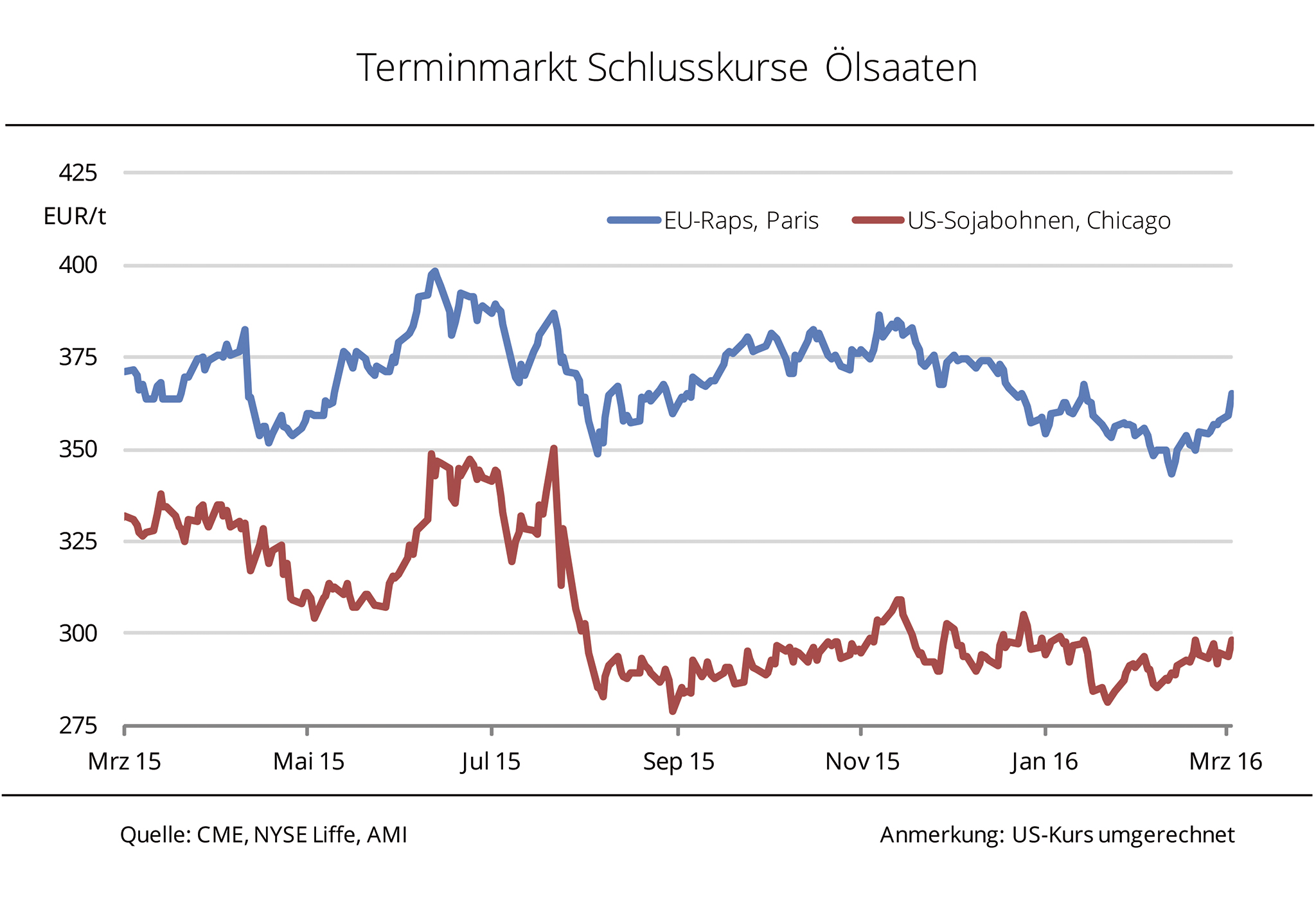 Nachdem die Rapsnotierungen in Paris aufgrund schwacher Rohölkurse und in einem ansonsten impulslosen Markt zu Jahresbeginn kräftige Verluste einstecken mussten, zeichnet sich derzeit eine Aufwärtstendenz ab. Feste Sojabohnen- und Pflanzenölkurse geben Auftrieb. Witterungsbedingte Ernteverzögerungen in Südamerika sowie eine lebhafte Nachfrage nach US-Ware haben den Sojabohnen in Chicago im März 2016 deutliche Gewinne beschert. Der Fronttermin legte im Laufe des Monats gut 7 % zu und durchbrach das erste Mal seit Dezember 2015 die Marke von 9 USD je Bushel, umgerechnet 295 EUR/t. Von dem Aufwind der Sojabohnenkurse profitierte auch Raps in Paris und notierte sowohl für den Kontrakt der vergangenen Ernte 2015 als auch den für die kommende Ernte auf einem 6-Wochenhoch. Selbst ein fester Eurokurs konnte dem nach Angaben der Agrarmarkt Informations-Gesellschaft (mbH) nicht entgegenwirken. Zusätzliche Impulse erhalten die Rapskurse von einer zunehmenden Konkurrenzfähigkeit von Rapsöl bei insgesamt steigenden Pflanzenöl- sowie Rohölpreisen.