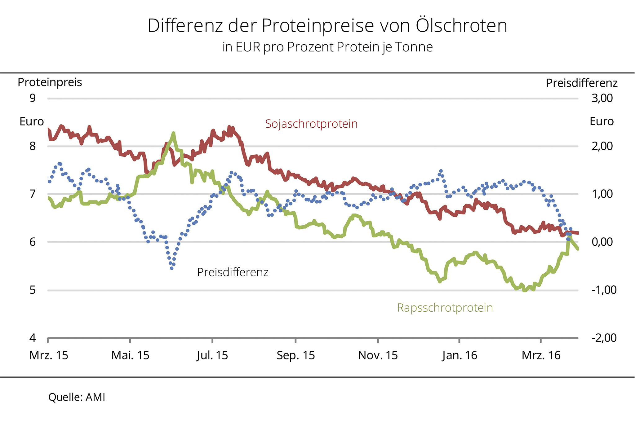 Das zeitweise sehr rege Kaufinteresse auf den vorderen Lieferterminen und feste Rohstoffkurse in Paris haben Ende März 2016 den Preisen für Rapsschrot kräftigen Auftrieb gegeben. Derweil tendieren die Preise für Sojaschrot anhaltend schwach. Auf fast 6,20 Euro für ein Prozent Protein pro Tonne Rapsschrot kletterten in der letzten Woche die Preise. Rapsschrot erreichte infolge dieses 5-Monatshochs zugleich das Preisniveau von Sojaschrotprotein. Vor allem die gestiegene Nachfrage vor den Feiertagen ließ die Preise für vordere Liefertermine anziehen. Geordert wurden allerdings meistens nur Kleinstmengen. Der kräftige Preisanstieg bremste dann auch schnell das Kaufinteresse, so dass das Preisniveau nach Angaben der Agrarmarkt Informations-Gesellschaft (mbH) nicht gehalten werden konnte. Denn an Angebot mangelt es derweil nicht. Durch anstehende Verarbeitungspausen sowie der Schließung einer großen Ölmühle könnte es aber bald spürbar schwinden.