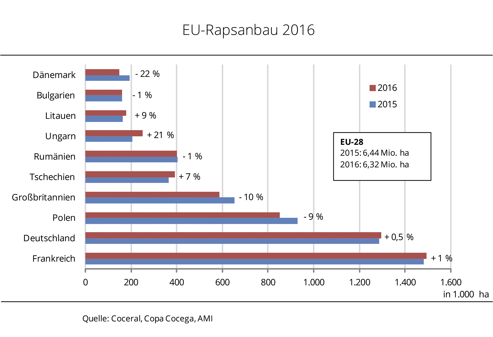 In der EU-28 stehen zur Ernte 2016 auf schätzungsweise 6,32 Mio. ha Winterraps. Das sind knapp 120.000 ha weniger als im Vorjahr. Bei Durchschnittserträgen könnte die Gesamterzeugungsmenge leicht sinken. In den Mitgliedsländern ist die Flächenentwicklung nach Angaben der Agrarmarkt Informations-Gesellschaft (mbH) sehr unterschiedlich. Während in den Haupterzeugungsländern Frankreich und Deutschland im Herbst etwas mehr als im Vorjahr gedrillt wurde, schrumpfte die Fläche in anderen Ländern deutlich. In Polen sind vor allem Aussaatschwierigkeiten und umfangreiche Flächenverluste durch Auswinterungen für den Rückgang verantwortlich. In Großbritannien hatten die Erzeuger bereits zur Aussat eine gringere Fläche geplant. Nach Einschätzung des agrarmeteorologischen Prognosedienstes der EU-Kommission befinden sich jetzt im Frühjar in nahezu allen Regionen die Anbauflächen in gutem Zustand. Aufgrund des milden Winters sind die Bestände Pflanzen regional schon weit entwickelt.