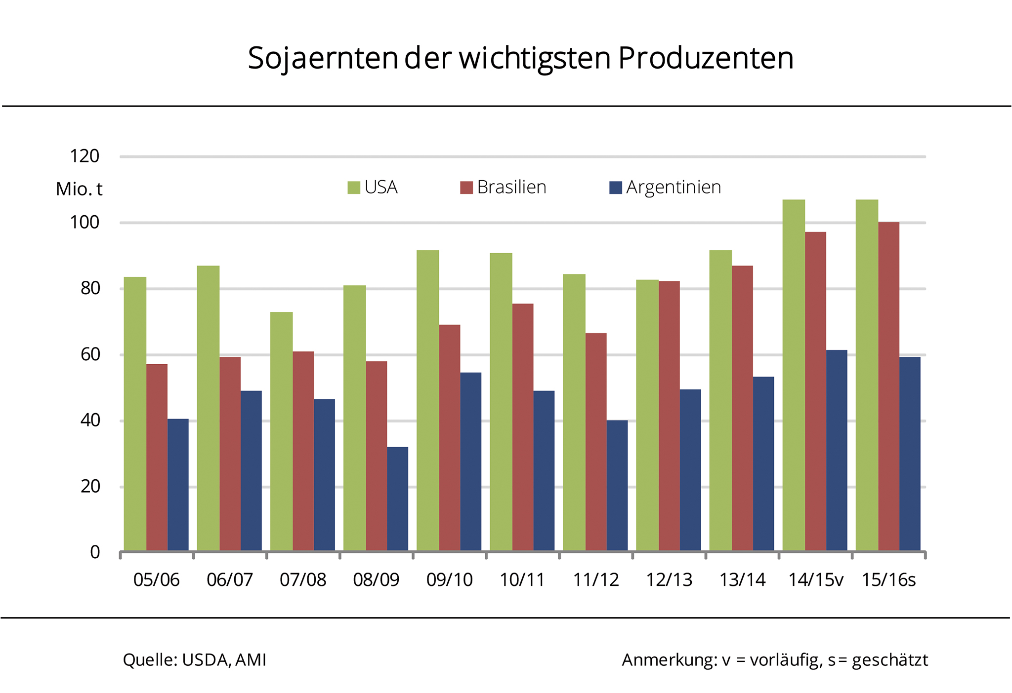 Die südamerikanische Sojaerzeugung 2015/16 könnte aufgrund witterungsbedingter Ernteeinbußen in Argentinien deutlich kleiner ausfallen als lange Zeit erwartet. In Brasilien, wo sich die Ernte in den letzten Zügen befindet, liegt die Erntemenge in etwa auf Höhe der Prognosen. Tagelange kräftige Niederschläge führen in Argentinien womöglich zu Ernteeinbußen von bis zu 3 Mio. t und schmälern zudem die Qualität der Sojabohnen. Bis dato prognostiziert das US-Landwirtschaftsministerium eine argentinische Erzeugung 2015/16 von 59 Mio. t, etwa 2 Mio. t weniger als 2014/15. Für Brasilien wird weiter ein Rekordernte von 100 Mio. t erwartet, nachdem fast 90 % der Flächen gedroschen wurden. Damit schrumpft der Abstand gegenüber den USA, wo im Herbst 2015 – wenn auch knapp – eine Rekordmenge von 107 Mio. t eingefahren wurde. Für das kommende Jahr 2016/17 lassen erste Schätzungen nach Angaben der Agrarmarkt Informations-Gesellschaft (mbH) erneut eine umfangreiche Sojaerzeugung erwarten. So wird in den USA die Rekordanbaufläche des Vorjahres zur Ernte 2016 nach aktuellem Stand nur knapp verfehlt.