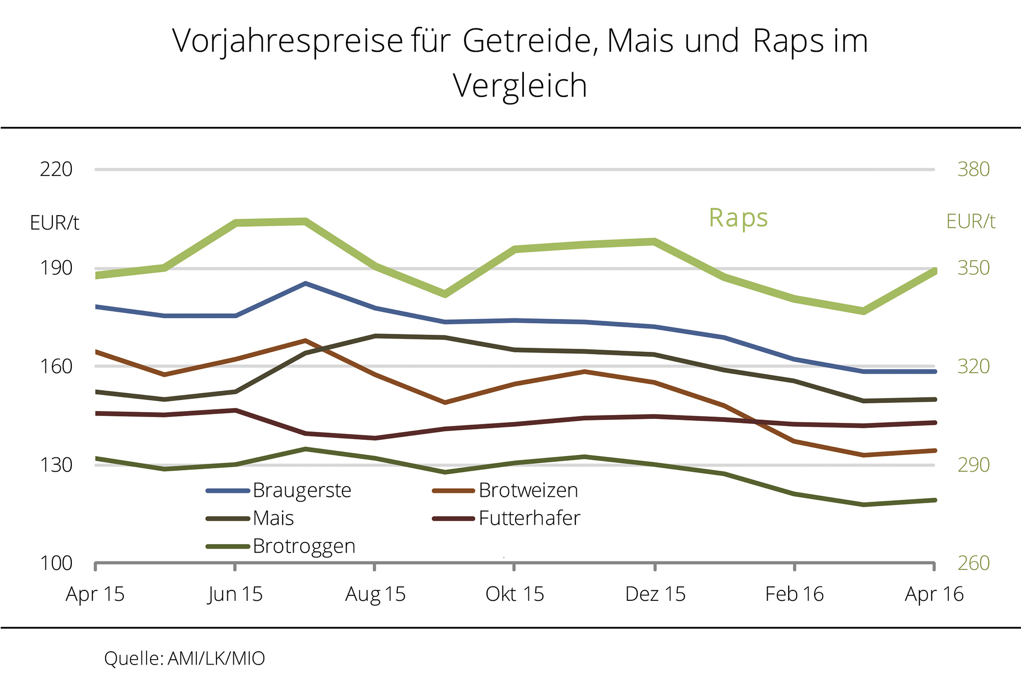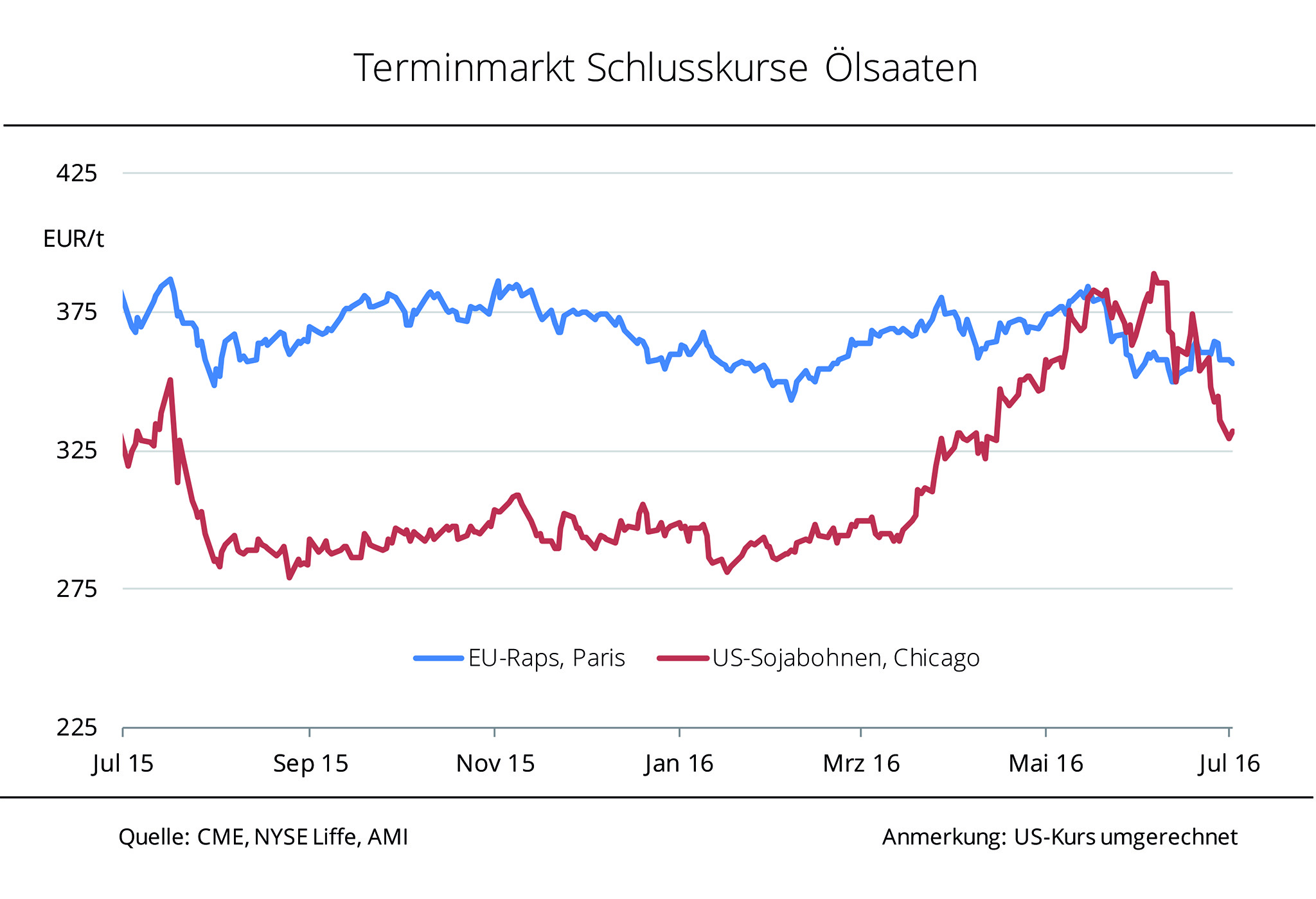 Die Rapspreise am Kassamarkt können den Preisabstand zum Vorjahr noch knapp halten. Hinsichtlich der kommenden Ernte wird aktuell sogar weniger gezahlt. Unter dem Einfluss kräftig sinkender Rohölnotierungen und eines zeitweise festen Euro sanken die Rapskurse in Paris Anfang Februar 2016 auf das niedrigste Niveau seit 5 Monaten. Das hat auch die Kassapreise unter kräftigen Druck gesetzt, zumal Verarbeiter mit ihren, auf die Börsennotierungen gezahlten Prämien, keine Anreize schaffen, um dem entgegenzuwirken. Gleichzeitig hoffen Erzeuger auf deutlich steigende Preise zum Ende der Saison und bieten daher kaum Partien an. Auch die Ernte 2016 wird wenig besprochen. Auf Erzeugerebene konnten Mitte Februar nach Angaben der Agrarmarkt Informations-Gesellschaft mbH (AMI) für prompte Ware 340 EUR/t frei Lager erzielt werden, 4 EUR/t weniger als in der Vorwoche und damit 8 EUR/t mehr als ein Jahr zuvor. Für Raps ex Ernte wurden zuletzt 323 EUR/t bewilligt und damit 4 EUR/t weniger als zum Vorjahreszeitpunkt.