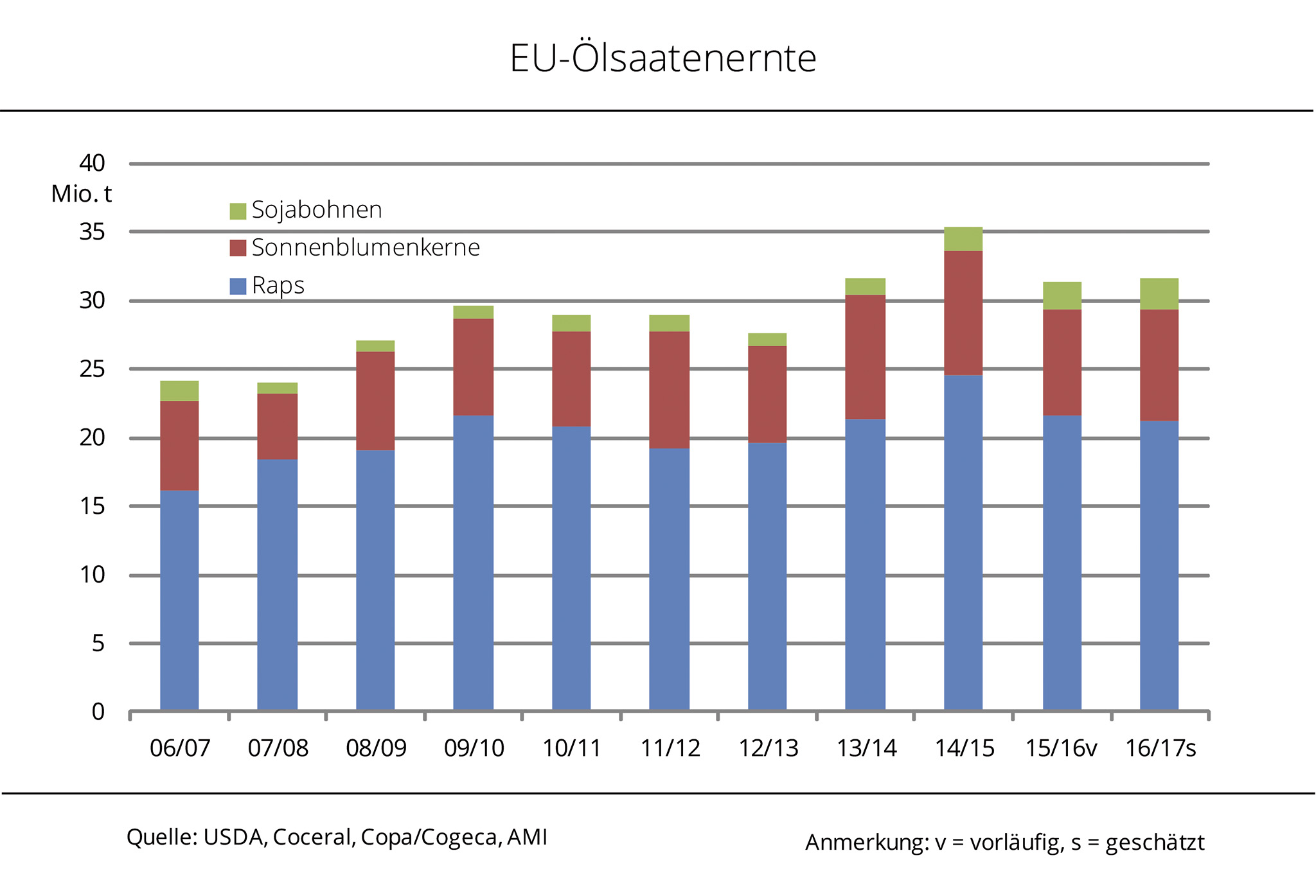 Positive Ernteaussichten in den USA setzen die Sojakurse kräftig unter Druck. Raps in Paris wird davon bis dato kaum berührt. Auch ein Ernteknick zeichnet sich nicht ab. Ein erwarteter Angebotsrückgang 2016/17 in der EU und schleppender Fortschritt der Ernte geben tendenziell Auftrieb. Der Fronttermin für Soja in Chicago rutschte diese Woche erstmals seit April 2016 unter die Linie von 10 USD je Bushel, umgerechnet 334 EUR/t. Die Befürchtungen um trockenheitsbedingte Ernteeinbußen in den USA durch das Klimaphänomen La Niña werden immer geringer. So entwickeln sich die US-Feldbestände sehr gut und bei günstiger Witterung, wie sie für die kommenden Wochen vorhergesagt wird, könnten die Erträge mindestens Vorjahresniveau erreichen. Nach Angaben der Agrarmarkt Informations-Gesellschaft mbH (AMI) können sich die Rapskurse in Paris dem Druck aus Übersee nicht ganz entziehen. Aktuell setzt sich aber zunehmend eine feste Tendenz durch. Stützend wirken eine schleppend laufende EU-Ernte sowie die Aussichten auf eine insgesamt knappere Versorgung in der EU 2016/17.