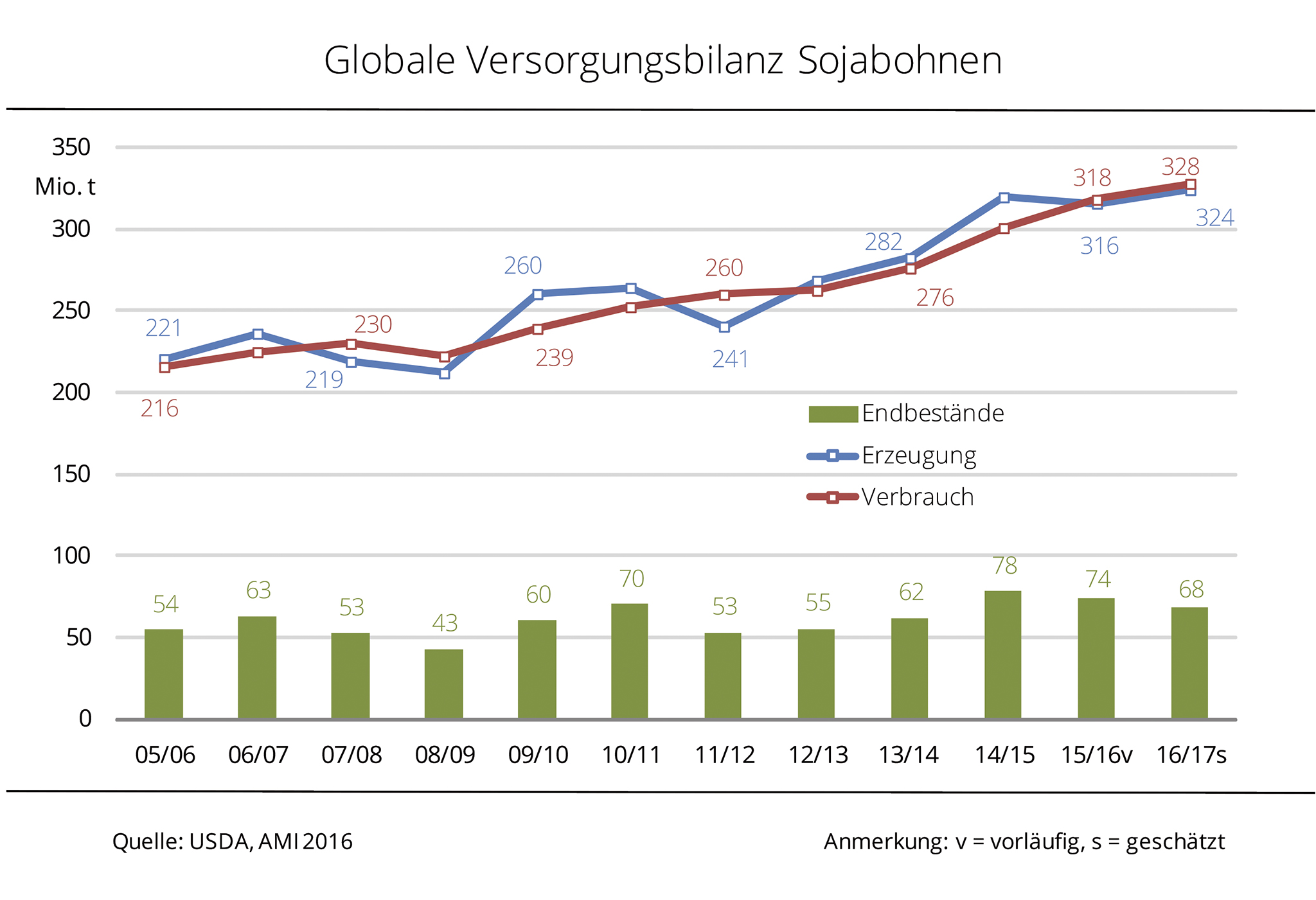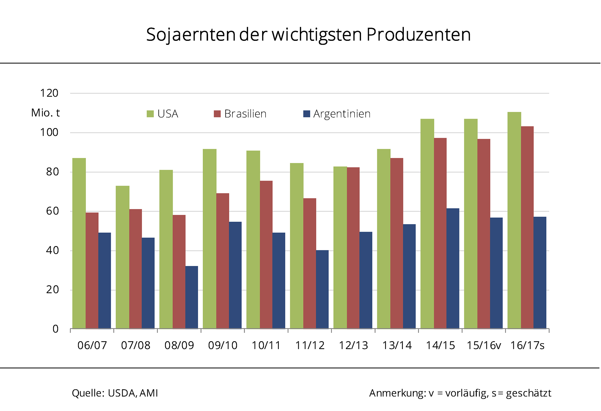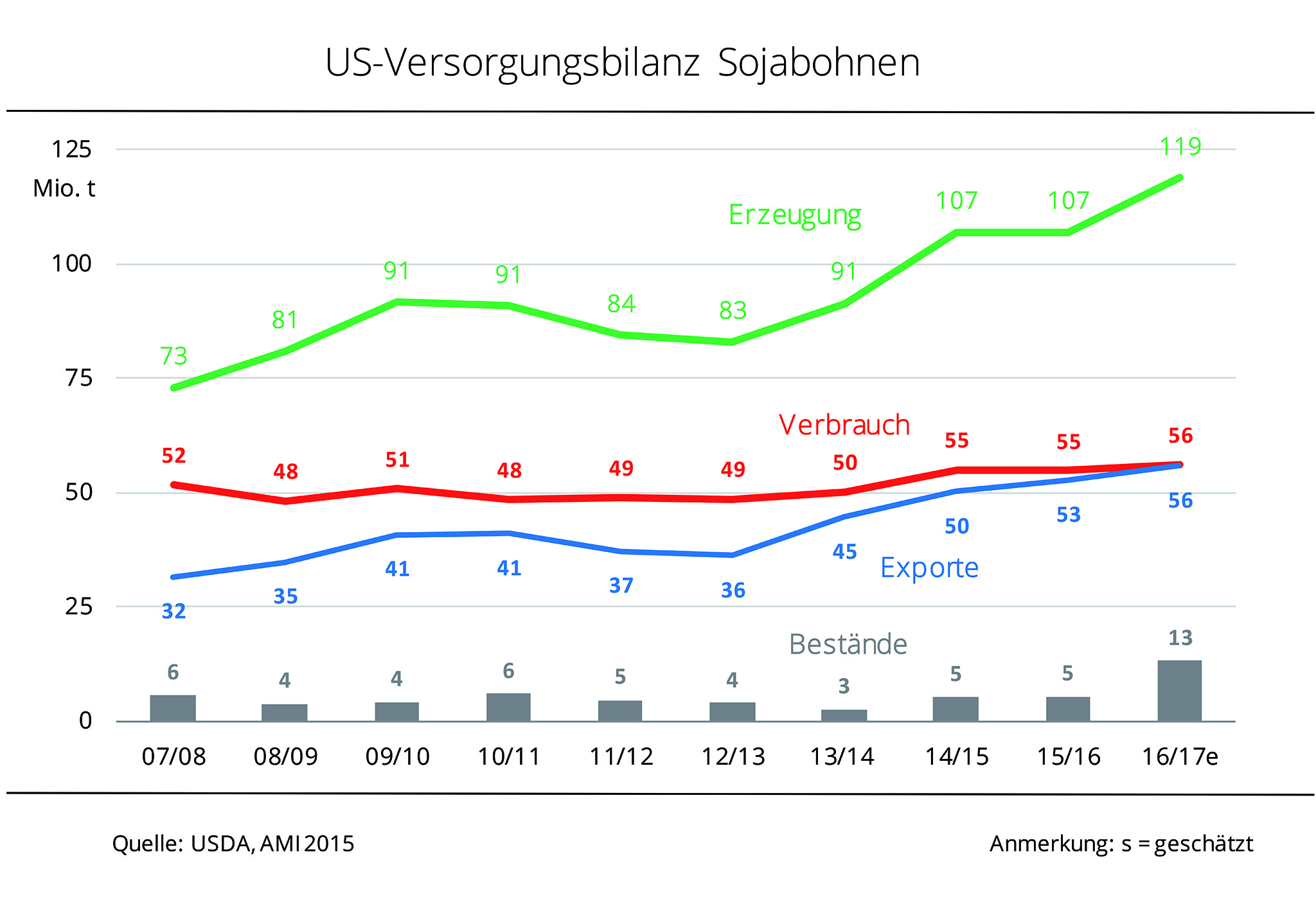Im kommenden Wirtschaftsjahr übersteigt die Sojanachfrage die Erzeugung um etwa 4 Mio. t. Zu diesem Ergebnis kommt die erste Schätzung des US-Landwirtschaftsministeriums. Dennoch ist die Marktversorgung mehr als ausreichend gesichert, denn die Bestände sinken von 74 Mio. t auf 68 Mio. t. Laut dieser ersten offiziellen Prognose wäre dies dann immer noch der vierthöchste Bestand seit Aufzeichnungsbeginn. Grund für den Abbau ist der um rund 10 Mio. t auf das historisch höchste Niveau steigende Verbrauch von knapp 328 Mio. t. Zugleich steigt die Produktion um 8 Mio. t auf 324 Mio. t. Auch dies ist historisch gesehen die höchste Sojaernte. Nach Angaben der Agrarmarkt Informations-Gesellschaft (mbH) fußt dies vor allem auf einer gegenüber dem Vorjahr höheren Ernteerwartung für Brasilien und Indien. Treiber der steigenden Nachfrage sind, wie in den vergangenen Jahren, vor allem China und Indien.