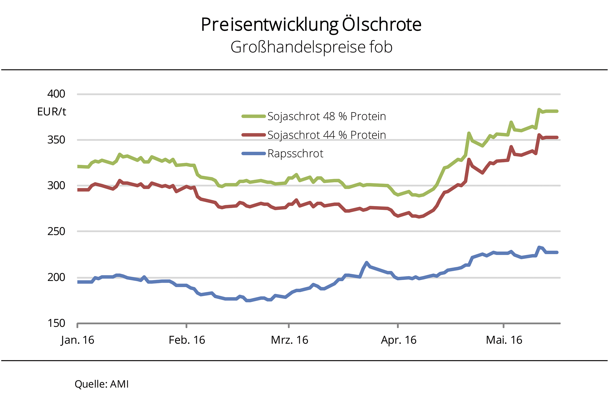 Die Ölschrotpreise legten in den vergangenen Wochen kräftig zu. Auslöser waren vor allem die stark steigenden Sojakurse, aber auch das teils knappe Angebot stützten die Forderungen. Sojaschrot kostet momentan so viel wie seit Ende Juli 2015 nicht mehr. Nach Angaben der Agrarmarkt Informations-Gesellschaft (mbH) überschritten die Großhandelspreise für 44er Sojaschrot zuletzt die Linie von 350 EUR/t, 48er Ware kostetet mehr als 380 EUR/t. Auslöser für den kräftige Preisauftrieb, der Anfang April 2016 begann, waren vor allem die steigenden Rohstoffnotierungen als Antwort auf die ungünstige Sojaernte in Argentinien. Aktuell ist es die langsame Aussaat in den USA, die die Kurse treibt. Damit wird auch Sojaschrot immer teurer. Käufer hoffen nun, dass die Hausse sich wieder beruhigt. Aber die Aussichten auf eine erneut knappe globale Versorgung mit sinkenden Endbeständen dürfte die Preise vorerst oben halten. Rapsschrot überschritt zuletzt die Linie von 225 EUR/t. Das knappe vordere Angebot verteuert die Ware, die damit so viel kostet wie vor 7 Monaten.