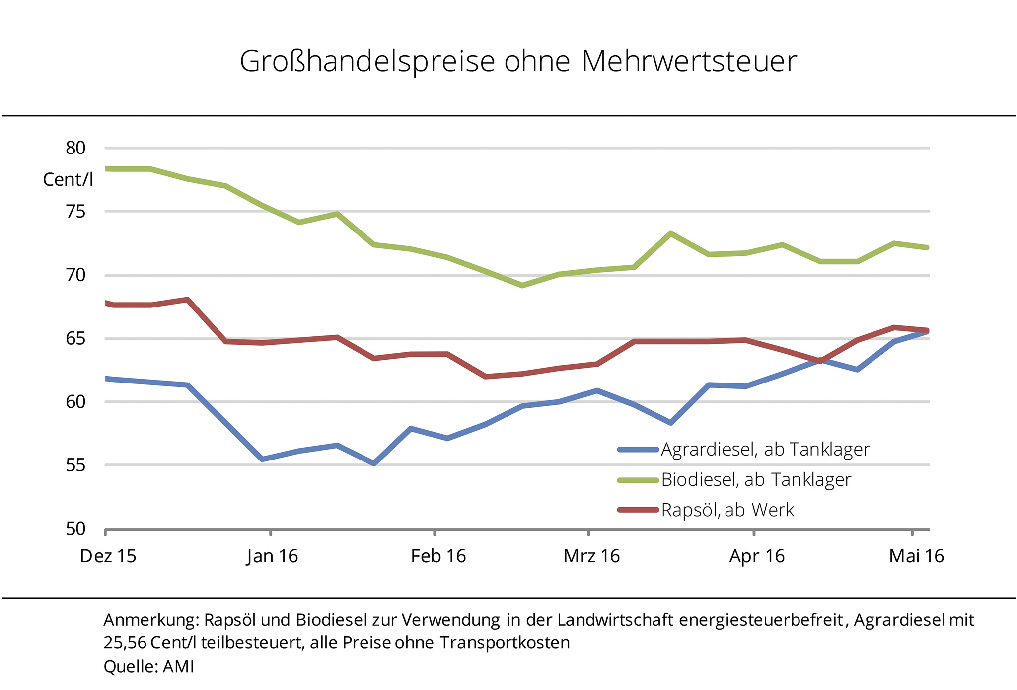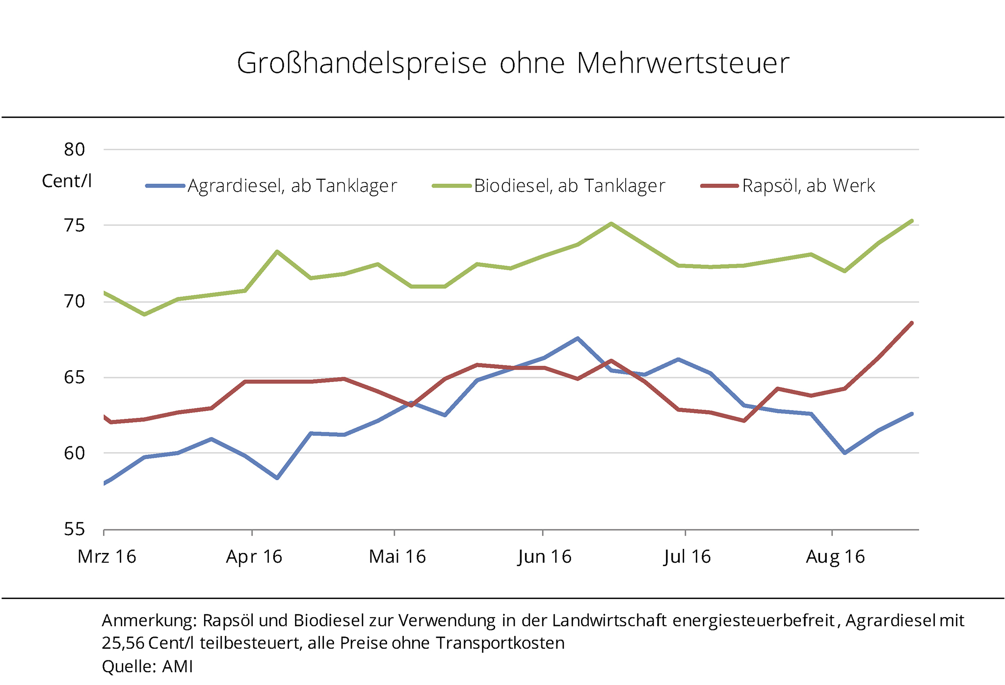 Die Großhandelspreise für Agrardiesel, Biodiesel und Rapsöl sind im August kräftig gestiegen. Rapsölkraftstoff und Biodiesel erreichten Höchststände. Agrardiesel ist trotz Preisanstieg weiterhin die preisgünstigste Alternative. Die Preise für Agrardiesel und Biodiesel wurden Mitte August 2016, bei steigenden Rohstoffkosten der Hersteller, kräftig angehoben. So legten die WTI-Rohölnotierungen innerhalb einer Woche um rund 9 % zu. Auch Pflanzenöle, die für die Herstellung von Biodiesel genutzt werden, zogen kräftig infolge der Ernteergebnisse im Preis an. Rapsöl zur vorderen Lieferung kostete zuletzt knapp 69 Ct/l und damit so viel wie seit Mitte Dezember 2015 nicht mehr. Der Preis für Standardware Biodiesel, mit einem Treibhausgas-Einsparpotenzial gegenüber fossilem Kraftstoff von rund 60 %, stieg im Zuge dessen auf 75 Cent/l. Das entspricht nach Angaben der Agrarmarkt Informations-Gesellschaft mbH (AMI) nicht nur einem 8-Monatshoch, sondern vergrößert den Preisabstand gegenüber Agrardiesel auf fast 13 Cent/l.