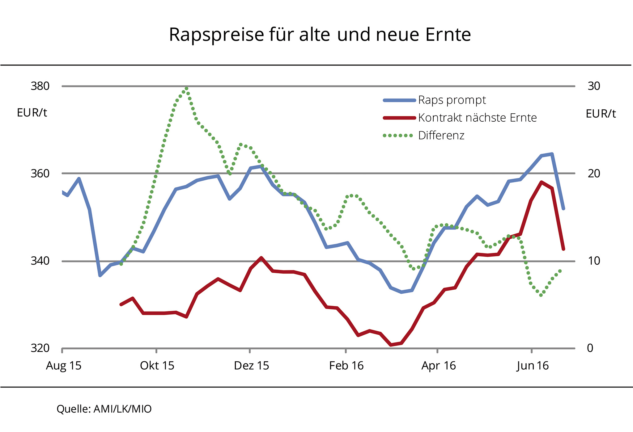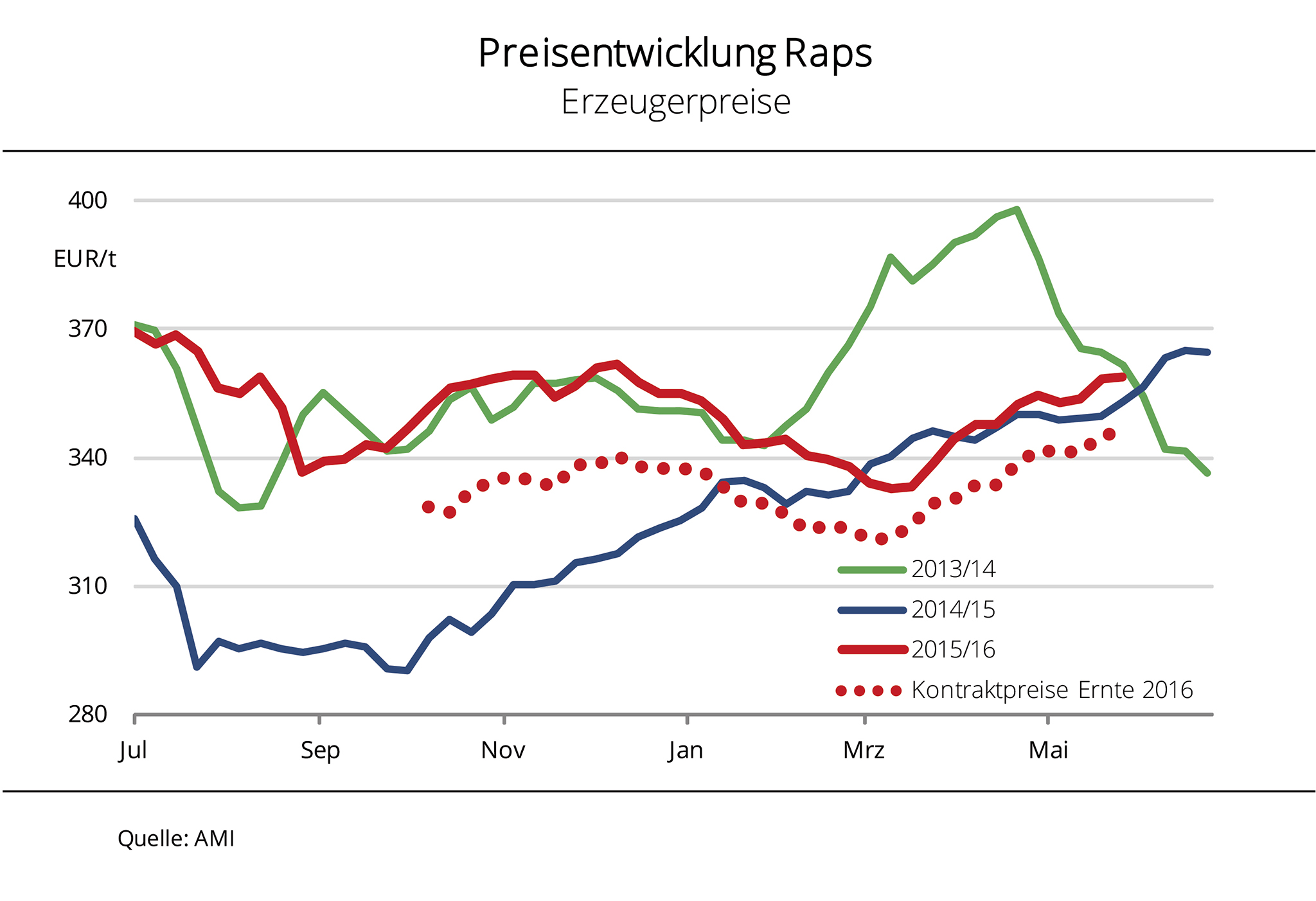 Die Rapspreise am Kassamarkt sind kräftig gestiegen und liegen seit Wochen über Vorjahresniveau. Auch für Kontrakte ex Ernte erhalten Erzeuger mehr als zuvor. Im Hinblick auf eine deutlich knappere Versorgung 2016/17 hält der Aufwärtstrend vorerst an. Raps zur prompten Lieferung erzielt aktuell durchschnittlich 359 EUR/t frei Lager und damit 6 EUR/t mehr als ein Jahr zuvor. Ex Ernte werden 346 EUR/t bewilligt. Das sind sogar 11 EUR/t mehr als zum Vorjahreszeitpunkt. Nach Angaben der Agrarmarkt Informations-Gesellschaft mbH (AMI) wird trotz steigender Preise auf den alterntigen Positionen, mit Ausnahme weniger Standorte, derzeit wenig Neugeschäft generiert. Grund dafür ist das sehr knappe Angebot. Das Interesse an Kontrakten ist auch gering, da Erzeuger auf weitere Preissteigerungen spekulieren. Diese sind aufgrund eines rückläufigen globalen Angebotes bei voraussichtlich lebhafter Nachfrage 2016/17 wahrscheinlich.