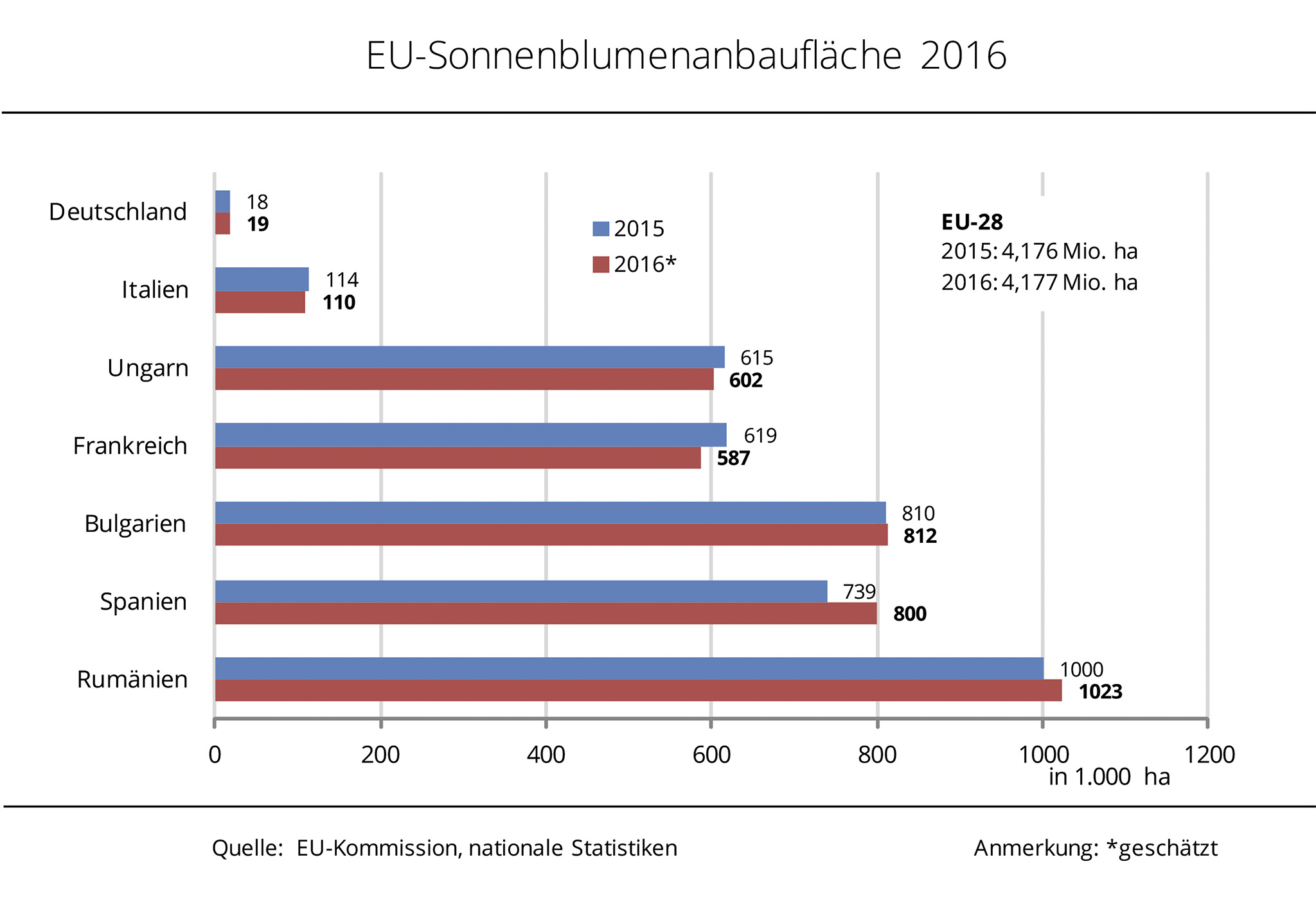 Trotz gesunkener Anbaufläche hat die Sonnenblumenerzeugung in der EU-28 hat gegenüber Vorjahr wieder zulegen können. Besonders der umfangreiche Anbau in Ungarn trägt zum Plus bei. Die Erzeugung von Sonnenblumenkernen 2016 dürfte nach aktuellen Schätzungen die eher durchschnittlichen Ergebnisse 2015 übertreffen. Zwar sank die Anbaufläche gegenüber Vorjahr leicht, dennoch übertreffen die Ernteschätzungen EU-weit das Vorjahresergebnis. Nach Angaben der Agrarmarkt Informations-Gesellschaft mbH weist die EU-Kommission für 2016 eine Anbaufläche von rund 4,16 Mio. ha aus, die sich damit um 0,7 % gegenüber Vorjahr minimal reduziert hat. Die Sonnenblumenernte der EU-28 wird hingegen derzeit auf 8,13 Mio. t geschätzt, knapp 4,4 % über Vorjahreslinie. Der Erntezuwachs trotz gesunkener Fläche ergibt sich aus der gestiegenen Produktivität. Gegenüber 2015 erhöhten sich die Durchschnittserträge um 5,4 % auf knapp 20 dt/ha. Die Ernte- und Ertragszuwächse in der EU-28 werden maßgeblich durch den ungarischen Anbau erreicht. In der laufenden Saison ist Ungarn zum größten Sonnenblumenerzeuger der EU-28 aufgestiegen.
