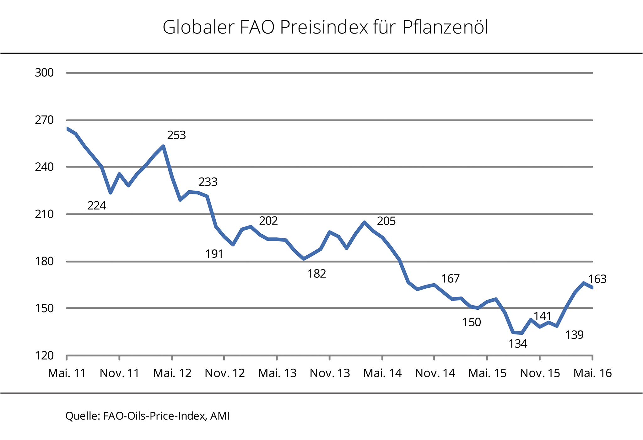 Der Pflanzenölpreisindex der Ernährungs- und Landwirtschaftsorganisation der Vereinten Nationen (FAO) gab im Mai 2016 um 3 % nach und unterbrach damit seinen seit Januar anhaltenden Aufwärtstrend. Nach einem kräftigen Anstieg von fast einem Fünftel seit Jahresbeginn wurde der Aufwärtstrend im Mai vorerst gestoppt. Die Kurse für Palmöl, dem weltweit wichtigsten Pflanzenöl, haben im Zuge schwacher globaler Nachfrage bei gleichzeitig unerwartet hoher Produktion in den Haupterzeugungsländern deutlich nachgegeben. Mit 163 Punkten lag der Index nach Angaben der Agrarmarkt Informations-Gesellschaft mbH (AMI) so zwar 3 % niedriger als im Vormonat, aber 6 % über Vorjahresniveau. Der FAO Preisindex stellt die Preisentwicklung für 10 verschiedene Pflanzenöle am Weltmarkt dar, gewichtet nach ihrem Anteil am Welthandel. Nach Auffassung der Union zur Förderung von Oel- und Proteinpflanzen (UFOP) ist die Erhöhung der gesetzlichen Beimischungsvorgaben von Biodiesel aus Palmöl der einzige sofort mengenwirksame Ausweg in den Produktionsländern. Dies zeigt das Beispiel Malaysias, das kürzlich die Beimischungsquote auf 10 % erhöht hatte. Von diesem Preisdruck profitiert neben den Raffineriestandorten in der Europäischen Union für die Produktion von Hydriertem Pflanzenöl (HVO) auch die chemische Industrie. Die UFOP weist darauf hin, dass hierzulande die gesamte Rapsernte auf gesetzlicher Basis nachhaltig zertifiziert sei. Hiervon seien die führenden Palmölexportländer nach wie vor weit entfernt. Im Gegenteil, die diesjährigen Urwaldbrände in Indonesien sollten der Politik ein Mahnfeuer sein, die nach der Erneuerbare-Energien-Richtlinie vorgegebenen Nachhaltigkeitsanforderungen für Biokraftstoff-Rohstoffe weiter zu entwickeln, statt diese mit Auslaufen der aktuellen Förderperiode im Jahr 2020 praktisch abzuschaffen.