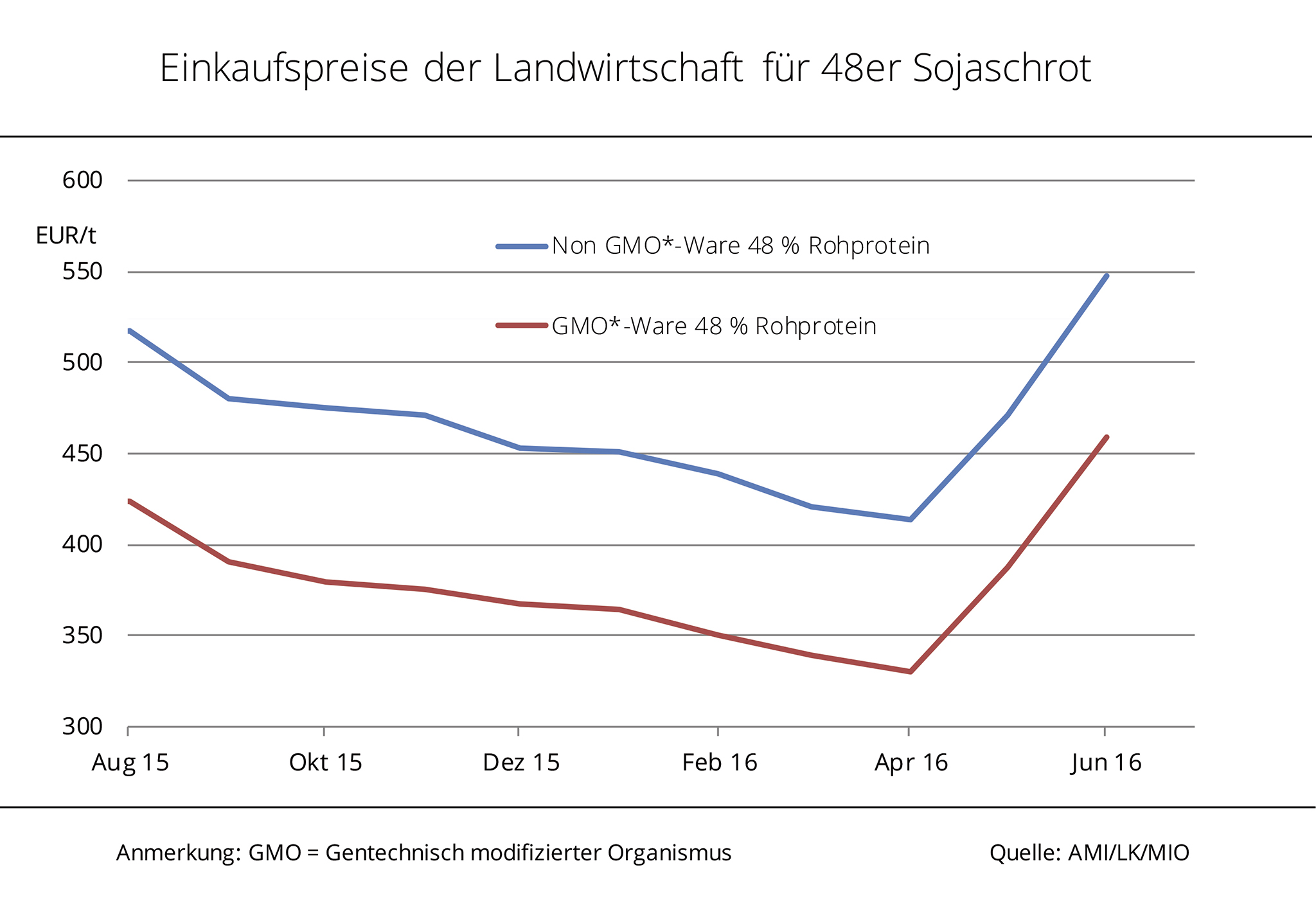 Steil steigende Sojakurse zogen zuletzt die Sojaschrotpreise in Deutschland mit nach oben. Die durch Nässe verzögerte und qualitativ beeinträchtigte Sojaernte in Argentinien hatte die Terminkurse auf ein 10-Monatshoch getrieben. Im April 2016 war die bisherige Abwärtsbewegung der Sojaschrotpreise schlagartig beendet. Bereits im Mai 2016 wurden frei Hof 14 % mehr verlangt und im Juni stieg der Preis sogar um 17 %. Dabei haben sich GMO-Ware und Non-GMO-Ware nahezu identisch nach oben bewegt. Der Preisabstand zwischen den beiden Futterkomponenten betrug zuletzt 89 EUR/t. Das ist nur wenig mehr als die 85 EUR/t im bisherigen Zeitraum 2016. Damit hat sich der Aufschlag, verglichen mit den Jahren zuvor sogar stetig verringert. In 2015 mussten für GMO-freies Sojaschrot noch durchschnittlich 99 EUR/t mehr gezahlt werden, 2013 sogar 115 EUR/t. Bislang war vor allem der süddeutsche Raum dafür bekannt, dass sich die Molkereien auf Milch fokussieren, die ohne GVO-Futter oder sogar ohne Sojaschrot produziert wurde. Nun wird auch aus Schleswig-Holstein davon berichtet, dass einige Molkereien ab Oktober 2016 kein Sojaschrot in der Fütterung mehr akzeptieren wollen.