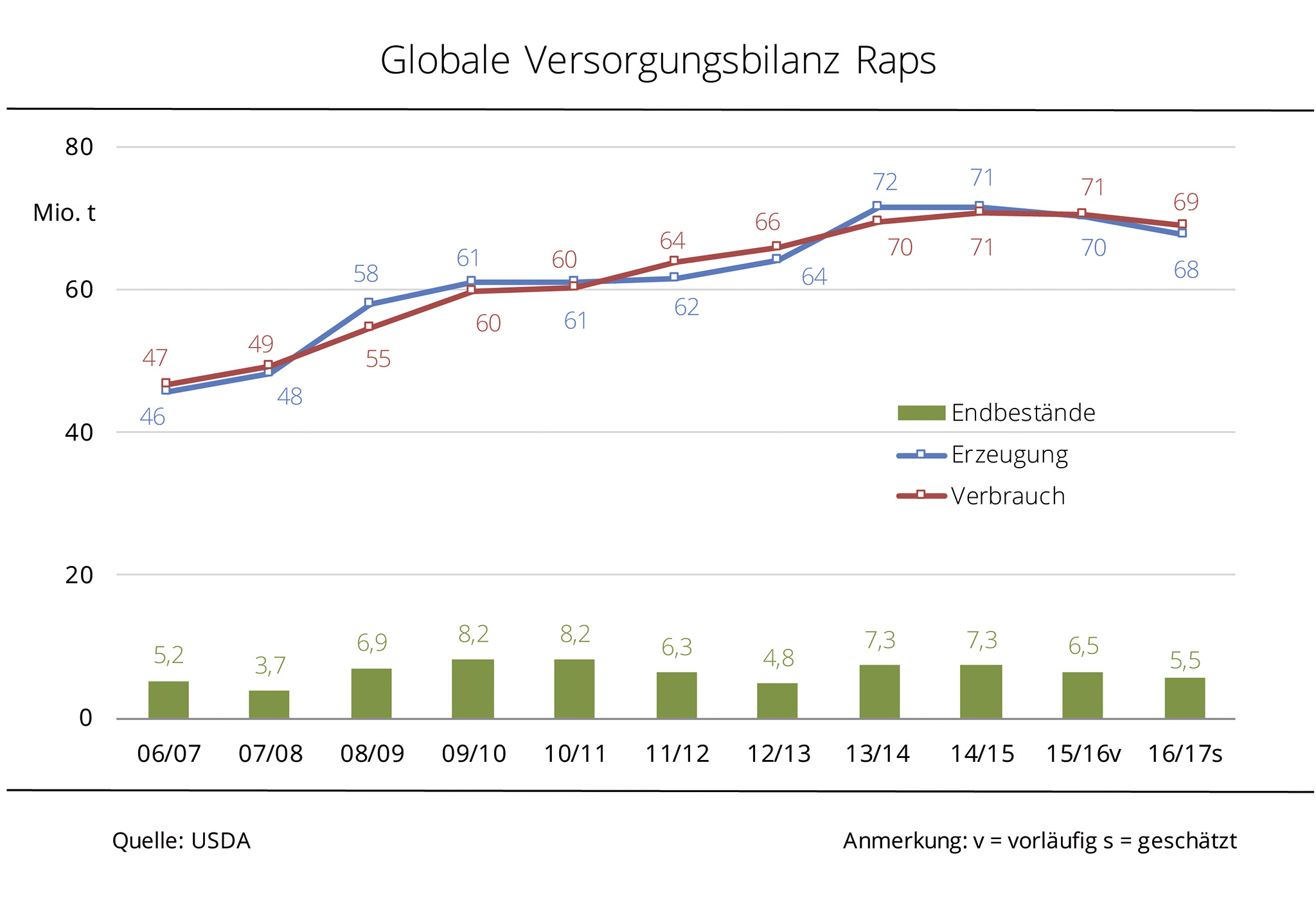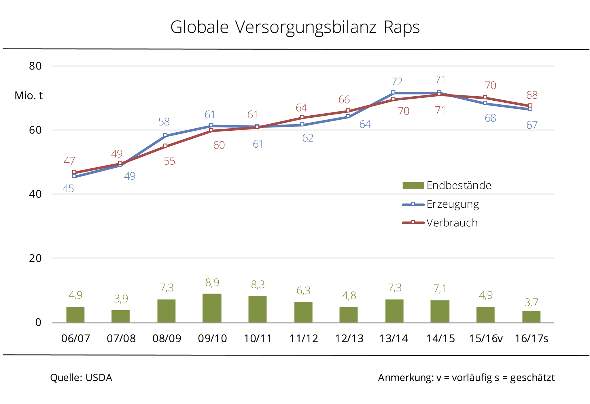 Wie schon 2015/16 überschreitet die weltweite Nachfrage nach Raps wohl auch 2016/17 das Angebot, so dass die Vorräte weiter schrumpfen könnten. Das gibt den Rapspreisen langfristig Luft nach oben. Das US-Landwirtschaftsministerium schätzt die globale Rapserzeugung 2016/17 aktuell auf 66,5 Mio. t und damit knapp 1,7 Mio. t niedriger als im Vorjahr. Dabei fallen die Ernten in den wichtigsten Produktionsländern – Kanada, China und der Europäischen Union – voraussichtlich kleiner aus. Das größte Minus verzeichnet mit rund 7 % und einer geschätzten Erzeugung von 13,3 Mio. t wohl China. Gleichzeitig wird global laut USDA mit 64,8 Mio. t zwar weniger verarbeitet als im Vorjahr, aber immer noch umfangreich. Zum Ende des Wirtschaftsjahres summieren sich die globalen Rapsvorräte auf etwa 3,7 Mio. t. Das entspräche einem 13-Jahrestief.