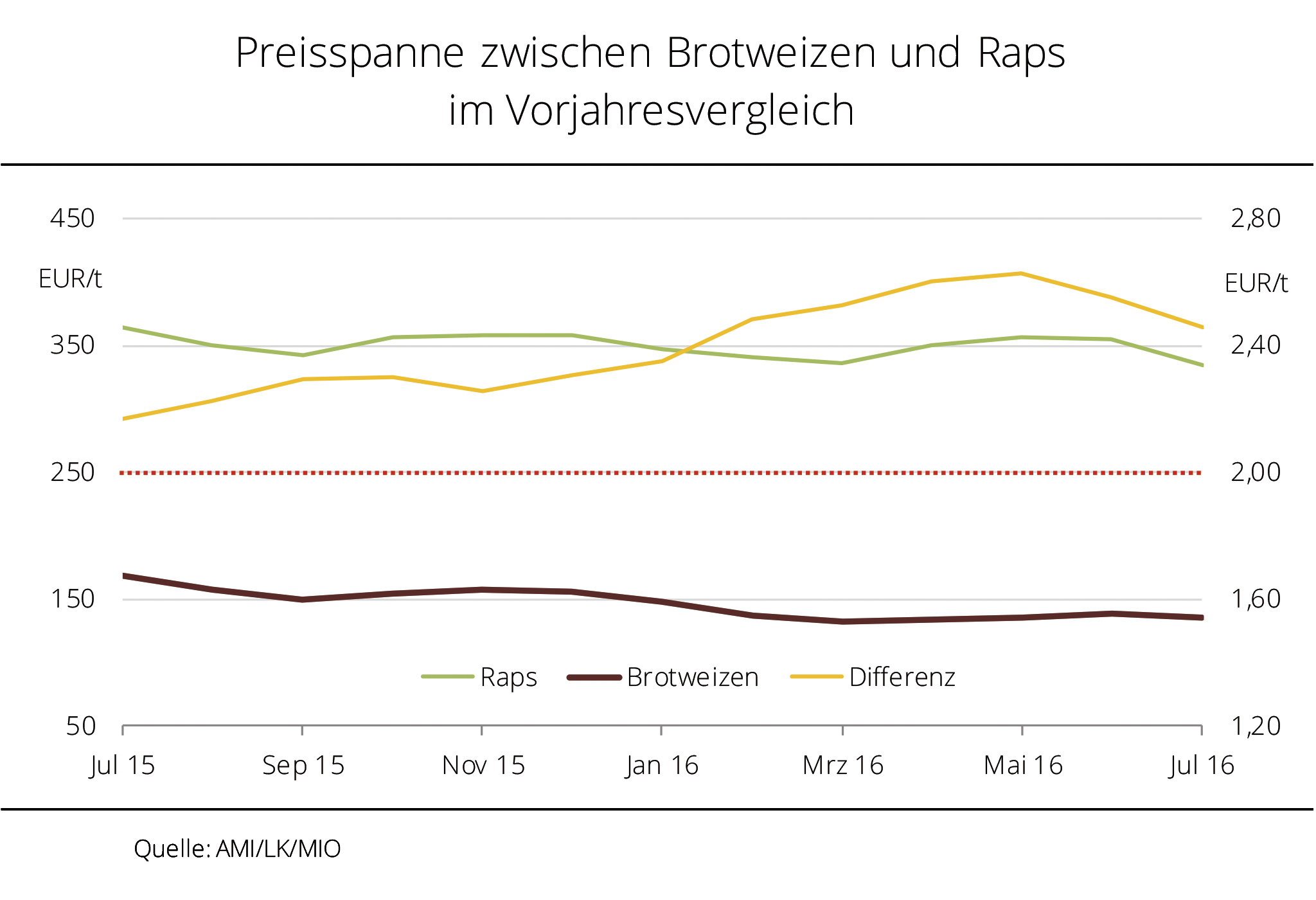 Der Preisabstand von Raps zu Weizen ist Ende 2015/16 gestiegen. Mit Nachlassen des Erntedrucks könnte diese Tendenz aufgrund einer witterungsbedingt deutlich kleineren EU-Rapsernte 2016/17 anhalten. Die Versorgung mit Raps in der EU wird 2016/17 mit einer von Coceral/Copa-Cocega geschätzten Ernte von 21,2 Mio. t wohl noch knapper ausfallen als im Wirtschaftsjahr zuvor. Verantwortlich dafür sind witterungsbedingte Ertragseinbußen. Zwar litt auch Weizen unter dem ungünstigen Wetter, vor allem im Mai und Juni 2016, die Aussichten auf die Versorgung sind bei erwarteter globaler Rekorderzeugung aber deutlich besser. Derweil ist der Preisspielraum für Raps aufgrund der rückläufigen Erzeugung, sowohl EU- als auch weltweit, langfristig nach oben geöffnet. So wird sich voraussichtlich auch in diesem Jahr die geringere Marktversorgung preislich bemerkbar machen. Schon im Juli 2016 wurden für Raps frei Erfasserlager mit rund 334 EUR/t knapp 200 EUR/t mehr als für Weizen gezahlt.