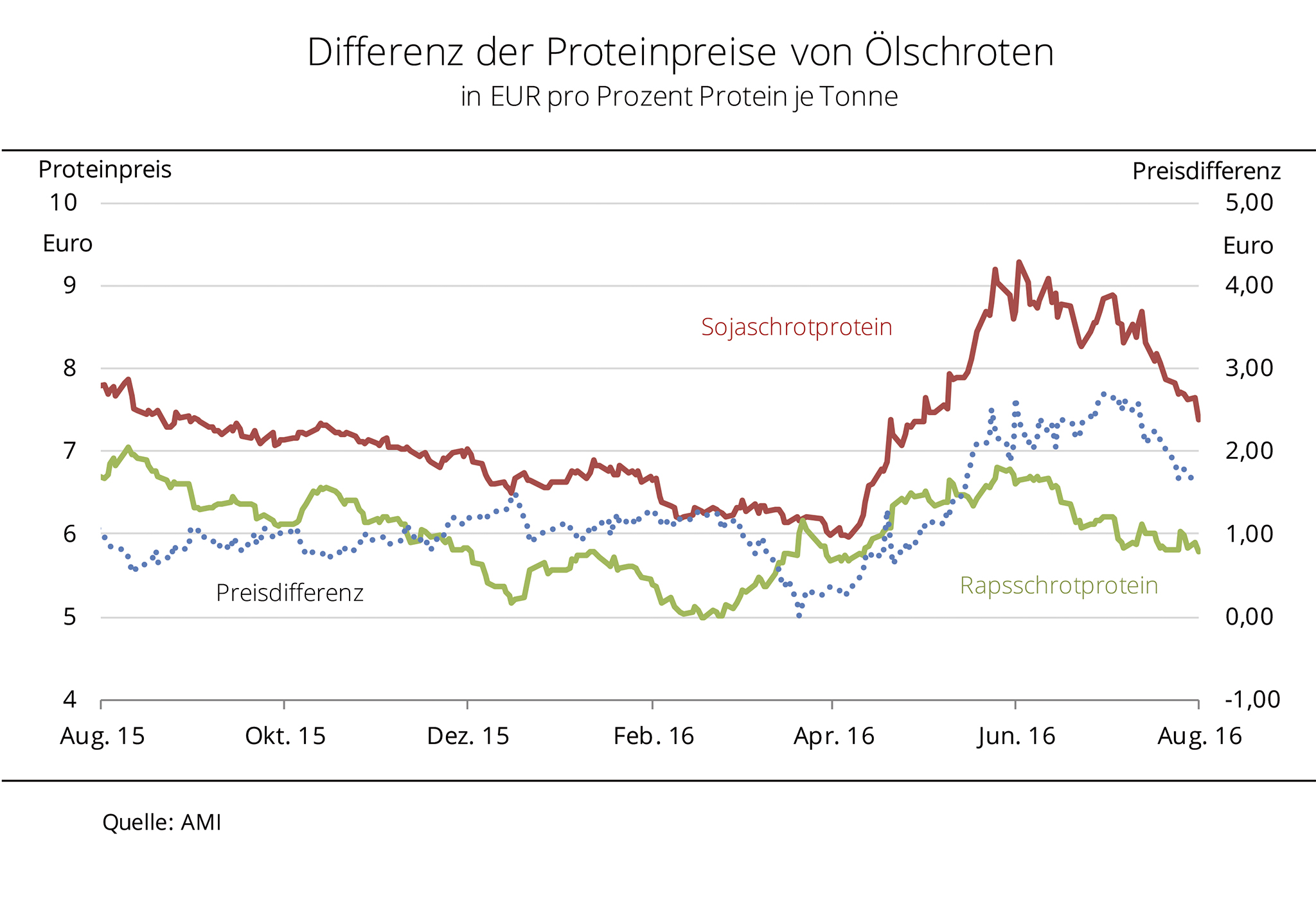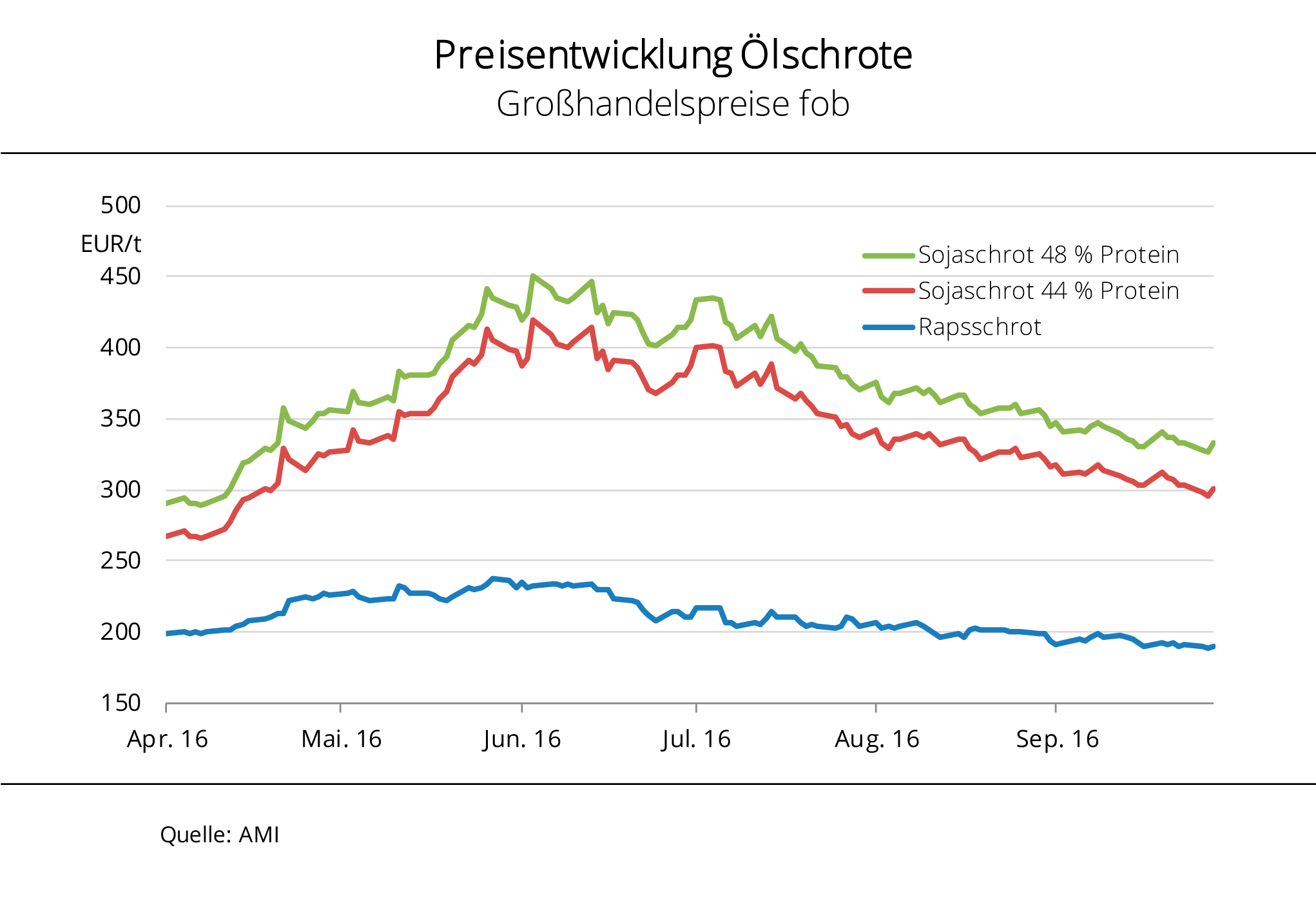 Die Preise für gentechnisch modifiziertes (GMO) Sojaschrot sind in Deutschland im Hinblick auf ein globales Rekordangebot 2016/17 deutlich gesunken. Vordere Ware kostet Ende September 2016 so wenig wie seit April 2016 nicht mehr. Neben einem umfangreichen weltweiten Angebot setzt eine schwache Nachfrage die Forderungen in Deutschland unter Druck. Dennoch richtet sich das Kaufinteresse verstärkt auf Rapsextraktionsschrot, weil in Milchviehbetrieben verstärkt RES als heimische Eiweißquelle eingesetzt wird. Die Betriebe entsprechen damit der Anforderung von zunehmend mehr Molkereien bzw. schließlich dem LEH, um die steigende Nachfrage nach „ohne Gentechnik“ gelabelten Milchprodukten bedienen zu können. Nach Angaben der Agrarmarkt Informations-Gesellschaft mbH ist auch GMO-freies Sojaschrot gefragt, so dass die Preise ihr Niveau halten. Dieses liegt aktuell 100-110 EUR/t über dem von GMO-Ware und wäre der eigentliche Referenzpreis für RES aufgrund der gegebenen Austauschbarkeit.
