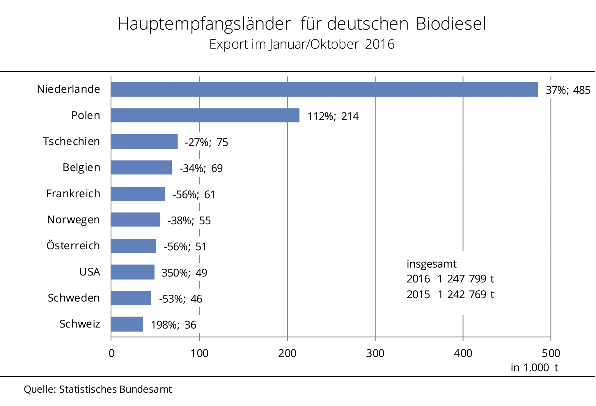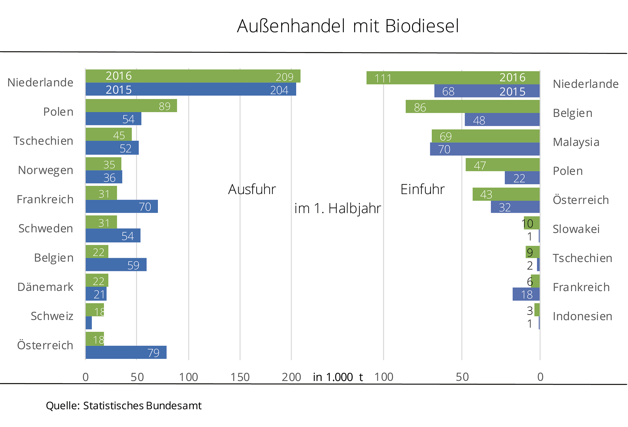 Das deutliche Minus basiert nach Angaben der Agrarmarkt Informations-Gesellschaft mbH (AMI) vor allem auf stark rückläufige Lieferungen in die Niederlande, nach Frankreich und nach Polen. Allein die Niederlande fragten rund 42 % weniger nach als im Vorjahreszeitraum. Polen orderte 38 % weniger, Frankreich konnte mit einem Minus von 26 % seinen 2. Platz gegenüber Österreich, wohin knapp ein Fünftel mehr geliefert wurde, nur noch knapp behaupten. Deutlich umfangreicher als im Vorjahreszeitraum war indes das Volumen Richtung Tschechien und Schweden. Mit einem Anstieg von fast 80 % und einer Gesamtmenge von 111.000 t ging so viel Biodiesel aus Deutschland nach Tschechien wie nie zuvor.