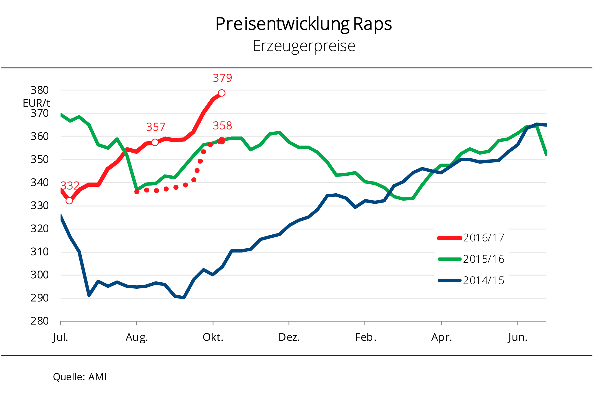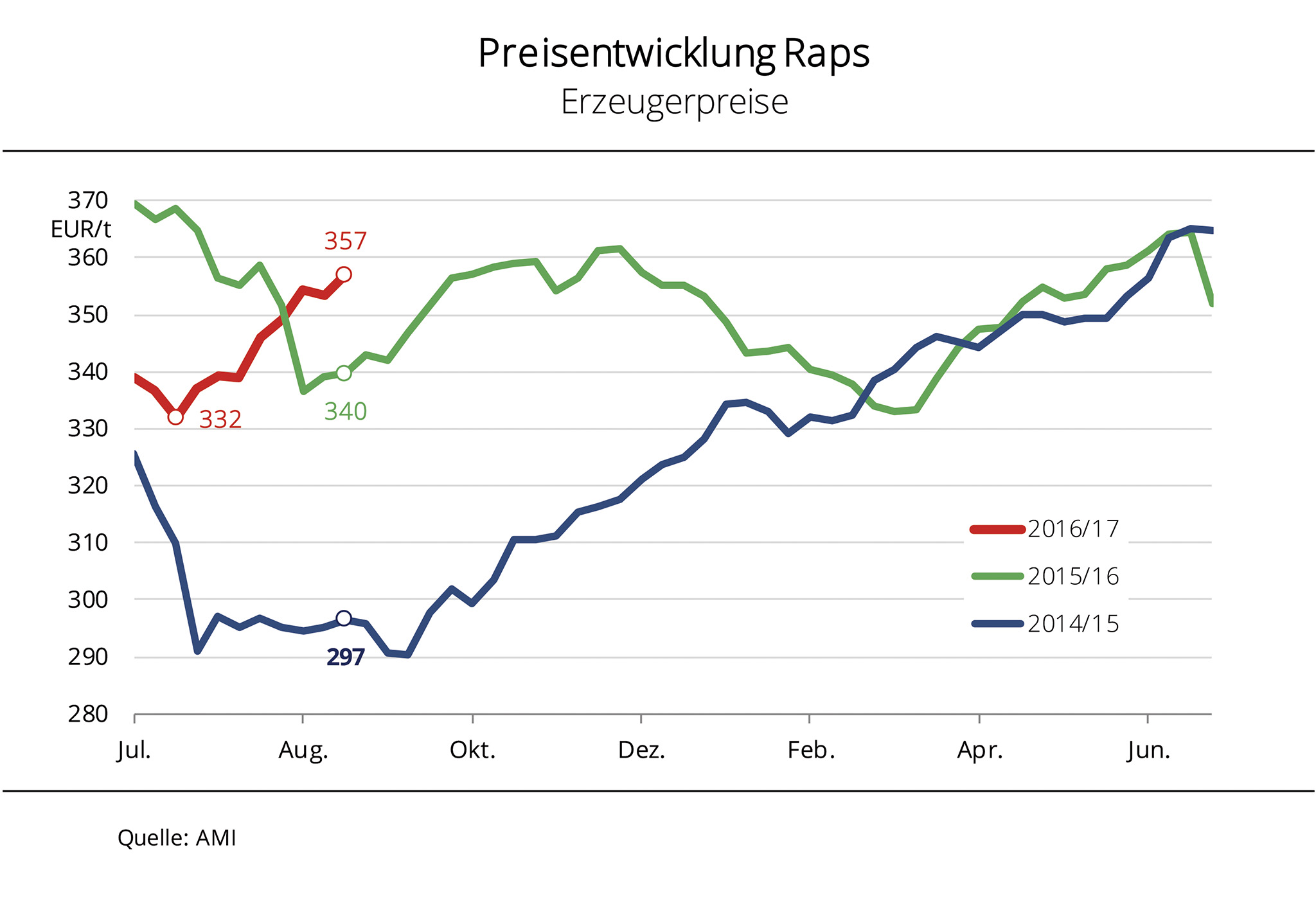 Die Erzeuger erhielten zuletzt für Raps im Schnitt knapp 380 EUR/t frei Lager und damit so viel wie seit Mai 2014 nicht mehr. Die preisstützenden Faktoren kamen vor allem aus Übersee. Die Rapspreise haben seit Beginn der Ernte in Deutschland 2016 stetig zugelegt. Allerdings war der Preisauftrieb in den vergangenen beiden Wochen nach Angaben der Agrarmarkt Informations-Gesellschaft mbH besonders groß. Unterstützung erhielten die Rapspreise vor allem aus Übersee. Zum einen legten die Sojapreise aufgrund reger Nachfrage aus China kräftig zu und überschritten die psychologische Grenze von 10 USD/bushel (340 EUR/t). Zum anderen wird die Rapsernte in Kanada von Schnee und Regen massiv behindert. An der Terminbörse in Winnipeg legten die Notierungen in nur drei Wochen um 10 % zu. Ebenfalls mit kräftigem Plus reagierten die Pflanzenölnotierungen auf die lebhafte Nachfrage nach Palmöl und dessen knappe Verfügbarkeit. Gleichzeitig zeigten die Rohölnotierungen nach oben und der schwache Euro unterstützte die EU-Exportaussichten positiv. So stiegen die Rapsterminkurse in Paris über die Linie von 400 EUR/t und damit auf ein 18-Monatshoch und ließen so auch die Erzeugerpreise in Deutschland steigen.