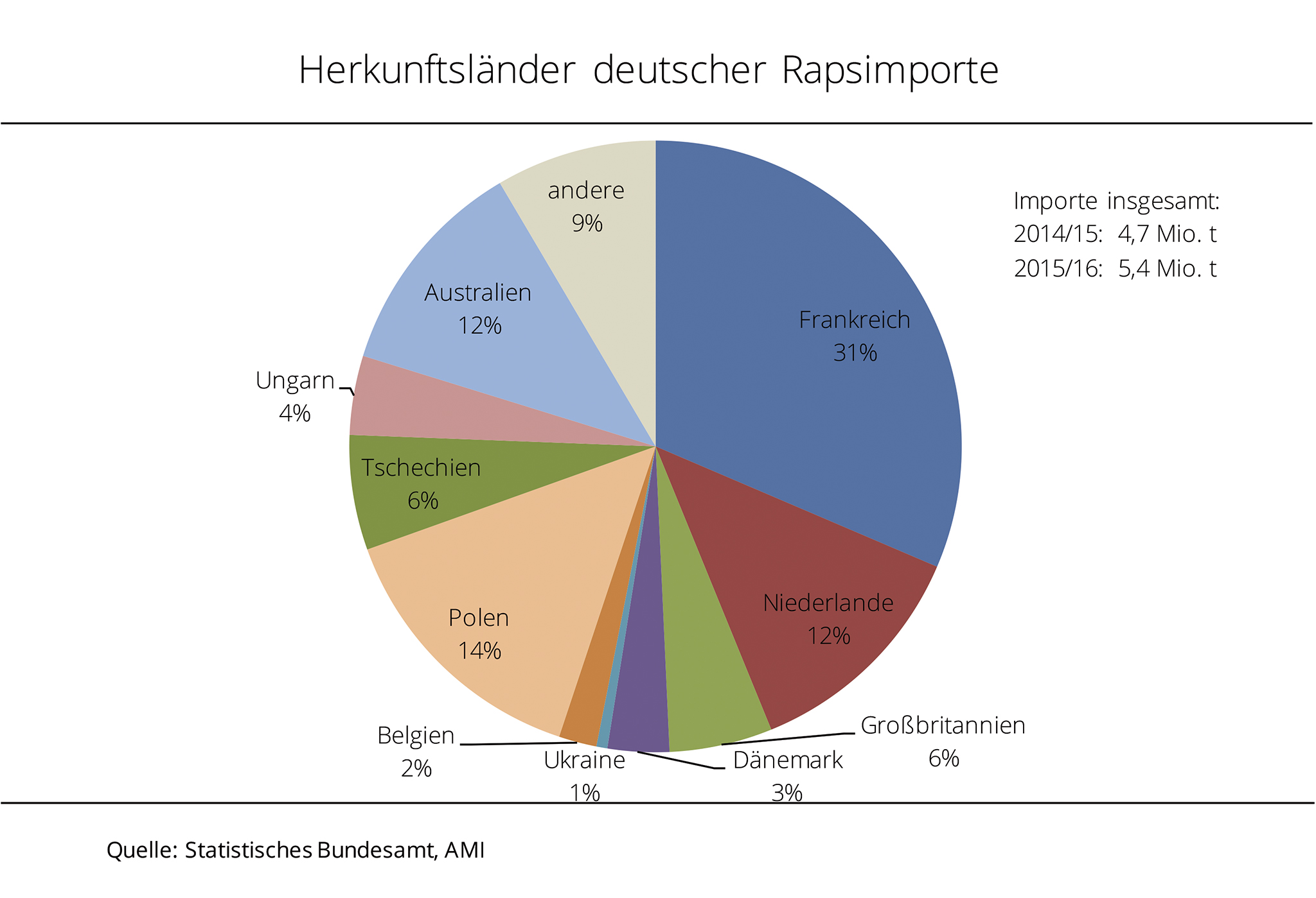 Die Rapsimporte sind nach Angaben des Statistischen Bundesamtes 2015/16 erneut deutlich gestiegen. Mit knapp 5,4 Mio. t erreichten sie ein Rekordhoch. Im Wirtschaftsjahr 2015/16 erhielt importierte die Ölmühlenwirtschaft 5,4 Mio. t Raps. Das waren gut 14 % mehr als im Vorjahr und so viel wie noch nie. Die größte Menge kam traditionell aus der EU-28, auch wenn der Anteil deutlich auf 86 % schrumpfte. Aus dem EU-Hauptlieferland Frankreich wurden mit 1,7 Mio. t etwa 12 % mehr als im Vorjahr geliefert. Zusätzlich kam mit knapp 672.500 t mehr Drittlandraps über die Niederlande nach Deutschland. Das entsprach nach Angaben der Agrarmarkt Informations-Gesellschaft mbH einem Rekordhoch und war mehr als das Doppelte von 2014/15. Wichtigster Drittlandlieferant Australien landete, trotz ebenfalls kräftig steigender Exporte, auf dem dritten Platz, erreichte aber dennoch mit 636.000 t ein Allzeithoch.