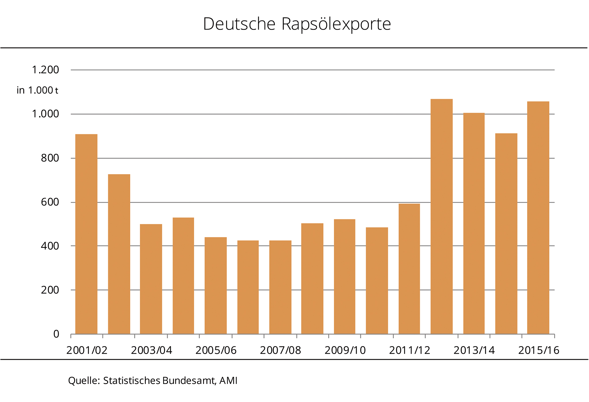Die Rapsölexporte Deutschlands erreichten im Wirtschaftsjahr 2015/16 ein 3-Jahreshoch. Sowohl EU-Mitgliedsländer als auch Drittländer orderten teils deutlich mehr. Die Rapsölexporte Deutschlands sind laut Statistischem Bundesamt 2015/16 deutlich gestiegen. Mit rund 1,1 Mio. t wurden fast 16 % mehr ins Ausland verkauft als 2014/15. Davon gingen 91 % in andere EU-Staaten und damit etwa 3 % weniger. Die Niederlande, als Drehscheibe des internationalen Handels, waren mit 484.000 t und demzufolge einem Plus von 7% erneut die Hauptabnehmer. Mit der um 53% auf 157.000 t gestiegenen Importmenge folgt Polen. Auf Platz drei der Hauptempfänger landete, trotz eines erheblichen Importrückgangs, Belgien mit 87.000 t. Nach Angaben der Agrarmarkt Informations-Gesellschaft mbH erhielten die EFTA-Staaten (Island, Norwegen, Schweiz) mit 78.000 t derweil eine Rekordmenge.