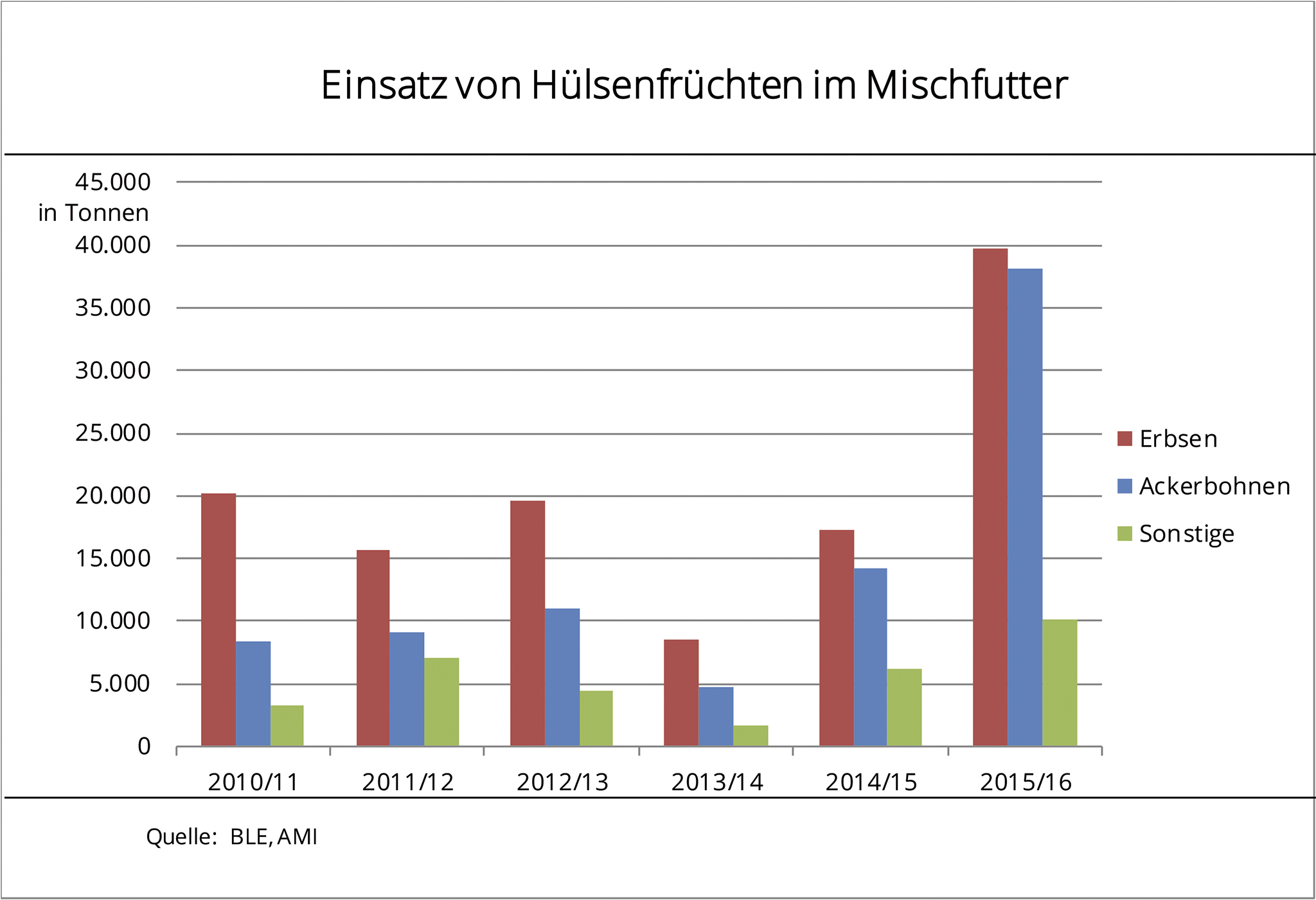 Die Änderung der Agrarförderung hat dem Anbau von Hülsenfrüchten Auftrieb gegeben. Als wichtige Proteinkomponenten im Futter finden sie hauptsächlich Verwendung in der hofeigenen Fütterung. Aber auch Mischfutterhersteller haben die heimischen Hülsenfrüchte entdeckt. Im Jahr 2015 bauten Landwirte vor dem Hintergrund der Greening-Anforderungen auf rund 160.400 ha Leguminosen an. Die Ernte an Erbsen, Ackerbohnen und Süßlupinen erreichte rund 450.000 t. Damit wurde zugleich ein Mengenniveau erreicht, für das sich auch die deutsche Mischfutterindustrie interessierte, die nach Angaben der BLE im Wirtschaftsjahr 2015/16 rund 88.000 t Hülsenfrüchte bei der Mischfutterherstellung verarbeitete. Das ist zwar im Vergleich zu Getreide vergleichsweise wenig, aber setzt nach dem Rückgang der Vorjahre ein deutliches Signal. Das waren immerhin mehr als doppelt so viel wie im Vorjahr. Keine andere Futterkomponente verzeichnete diese Steigerungsraten. Doch damit könnte bald wieder Schluss sein. Nach Angaben der Agrarmarkt Informations-Gesellschaft mbH plant die EU-Kommission verschärftere Auflagen zum Erhalt der Greening-Prämie: Der zur Ertrags- und Qualitätssicherung unerlässliche Pflanzenschutz im Leguminosenanbau würde damit verboten, der Anbau unattraktiv. Hülsenfrüchte rutschten zurück in ihre winzige Nische - die Eiweißpflanzenstrategie der Bundesregierung erhielte damit einen schweren Dämpfer.