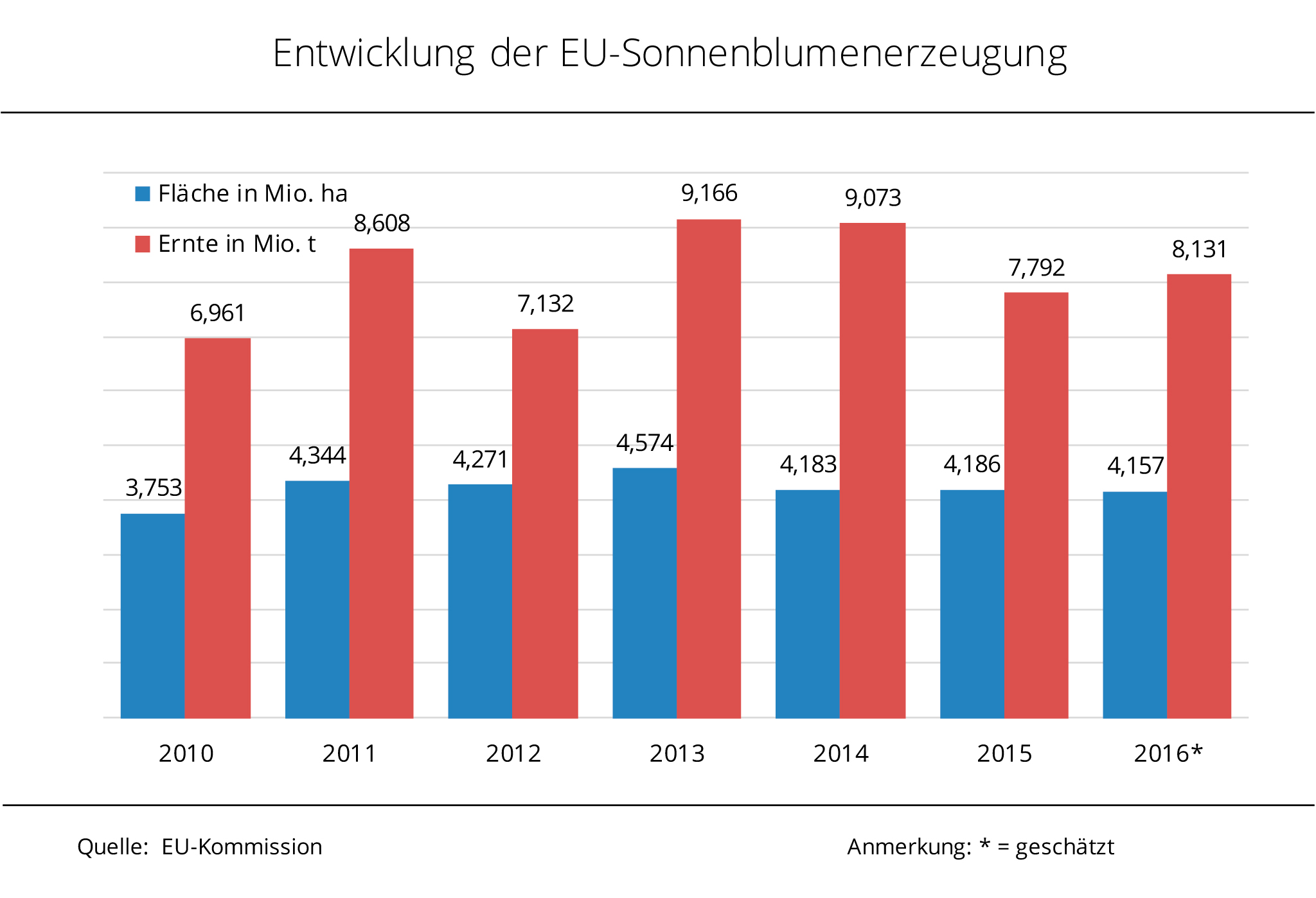 Die Sonnenblumenanbaufläche im viertgrößten EU-Erzeugungsland Frankreich fällt wohl deutlich kleiner aus als vermutet. Damit könnte sich die bis dato positive Flächenschätzung der EU-Kommission für 2016 ins Negative wenden. Überschwemmungen aufgrund kräftiger Niederschläge haben in Frankreich wohl zu deutlichen Flächenverlusten geführt. Das französische Landwirtschaftsministerium schätzt das Sonnenblumenareal aktuell auf 587.000 ha und damit 5 % kleiner als im Vorjahr. Die EU-Kommission ging für Frankreich im Mai noch von 619.000 ha aus. Nach Angaben der Agrarmarkt Informations-Gesellschaft mbH (AMI) ist die Prognose der Kommission ohnehin noch sehr vage. Bislang taxieren die Experten in Brüssel den EU-Anbau von Sonnenblumen zur Ernte 2016 etwas größer als im Vorjahr. Mit der aktuellen Entwicklung, nicht nur in Frankreich, dürfte das Vorjahresergebnis allerdings schwer erreicht werden.