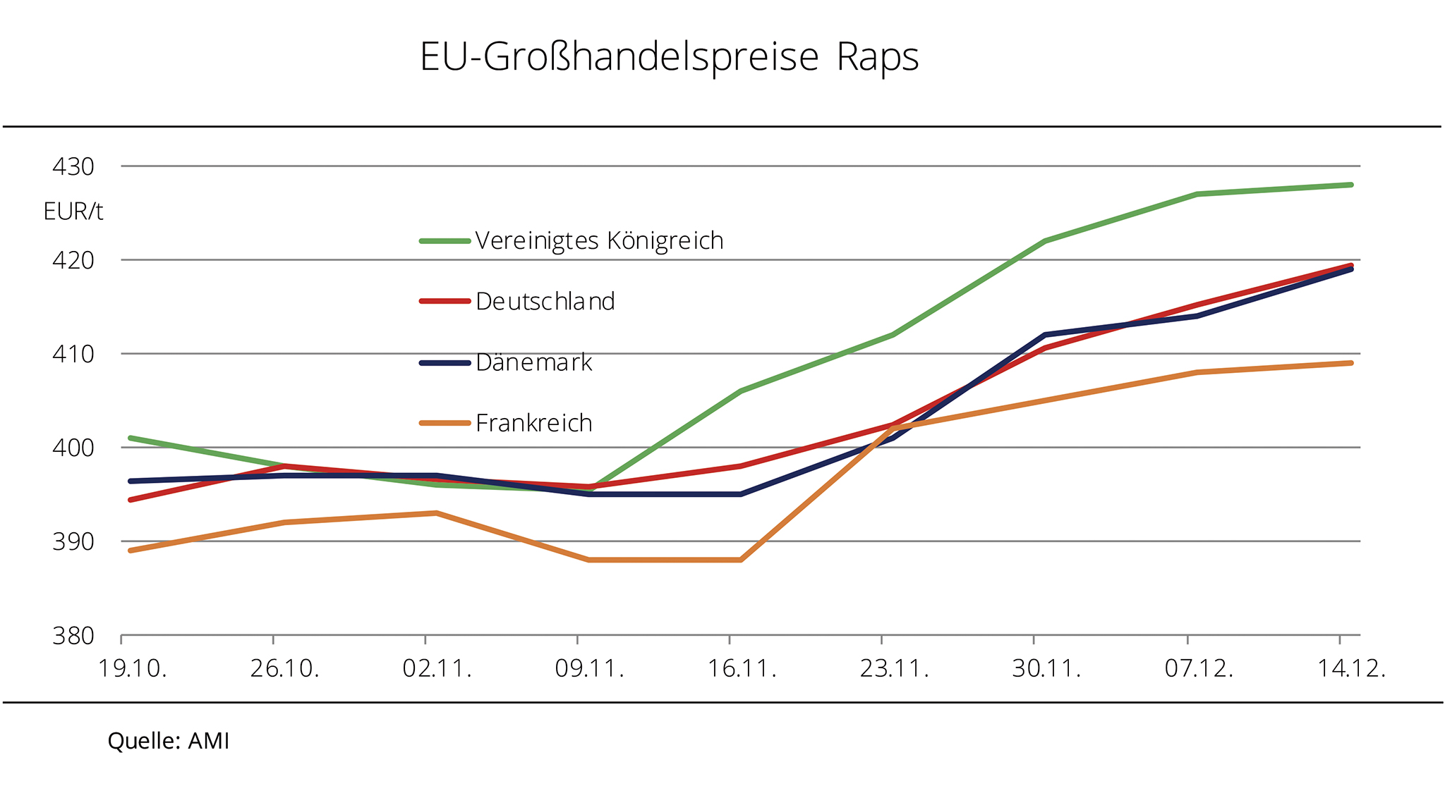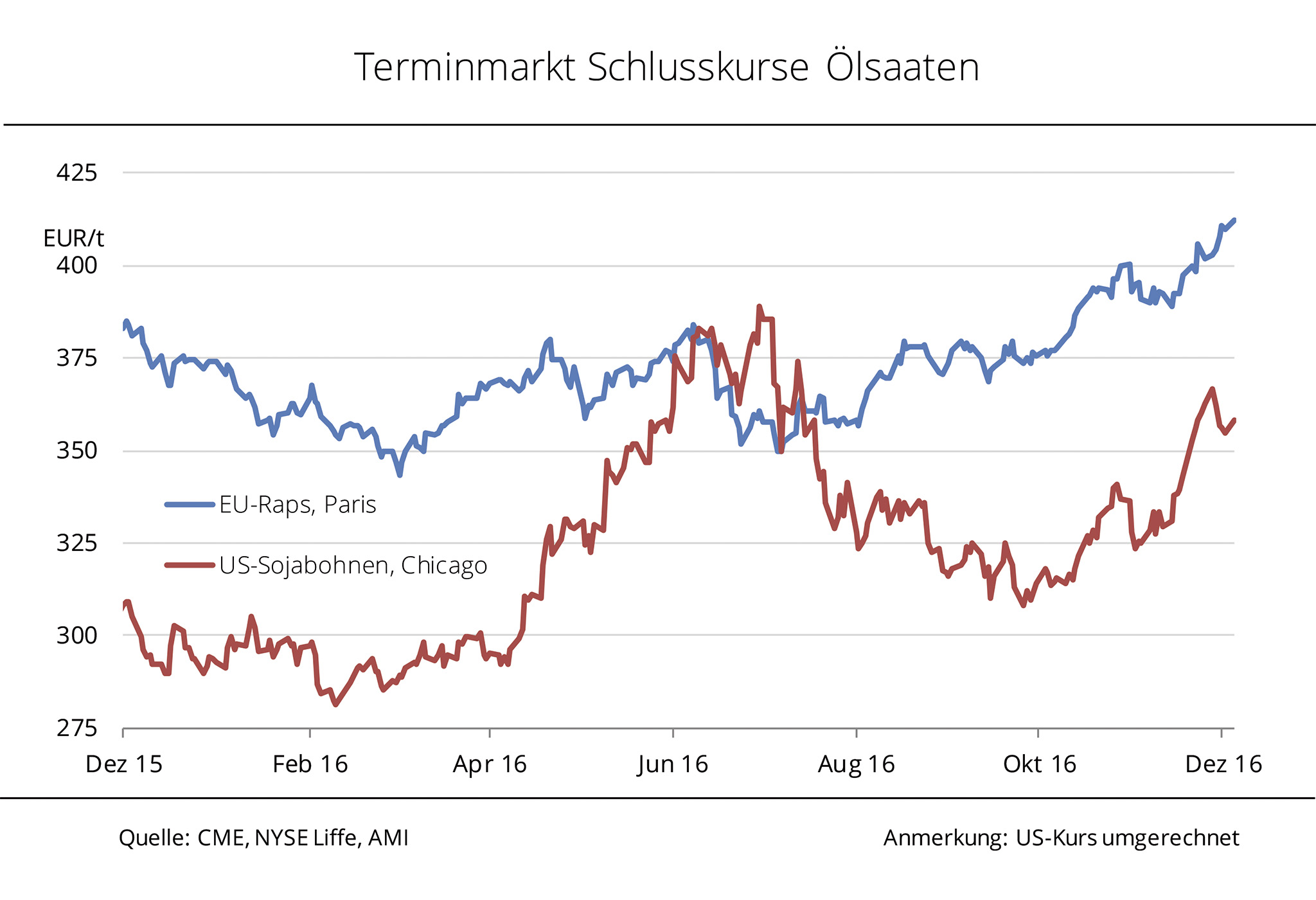 Feste Notierungen für Sojabohnen, Palmöl und Rohöl ließen die Rapsnotierungen in den vergangenen Tagen kräftig steigen. An der Terminbörse in Paris schloss der Fronttermin am 06.12.2016 bei 412,50 EUR/t und damit auf dem höchsten Niveau seit April 2014. Damit hat Raps in nur drei Wochen 6 % an Wert gewonnen. US-Sojabohnen hatten in dieser Zeit sogar um 7,5 % zugelegt. Sie profitierten zuletzt vor allem vom unerwarteten Kaufinteresse aus China und der rückläufige Dollar verbesserte zudem die Perspektiven für kommende Geschäfte. Gleichzeitig zeigen die beginnenden Wettermärkte in Südamerika Wirkung. So scheint es in Argentinien für die frisch gesäten Bohnen derzeit zu trocken zu sein und namhafte Analysten reduzierten bereits ihre Ernteschätzung. Damit könnte die Ernte sogar kleiner ausfallen als im Vorjahr. Das befestigte die Kurse und eröffnet den Fokus auf die Entwicklung in Südamerika. In Brasilien gibt es bisher allerdings keine Einschränkungen und die Ernteprognose bleibt auf der avisierten Rekordhöhe von 102 Mio. t. Die Rapspreise in Deutschland profitieren zudem von den festen Notierungen für Palmöl in Malaysia. Das absehbar knappe Angebot hatte in den vergangenen Wochen bereits für Unterstützung gesorgt. Vor dem Hintergrund einer exportfördernden, schwachen Inlandswährung könnte sich die Schere zwischen Angebot und Nachfrage noch weiter schließen, zumal die Palmölproduktion im laufenden Monat unter Vormonatsvolumen geschätzt wird. In den genannten drei Wochen verteuerte sich Palmöl um knapp 13 %. Die Rapskurse in Paris spiegeln aufgrund des knappen Inlandsangebotes in Deutschland die Großhandelspreise nur teilweise wieder. Ölmühlen bewilligen, nach Angaben der Agrarmarkt Informations-Gesellschaft mbH, teils 13 EUR/t mehr für vordere Ware. In Großbritannien sieht die Versorgungslage noch enger aus. Hier liegen die Prämien sogar bei 15 EUR/t. Demgegenüber kann die kleine Rapsernte in Frankreich keinen Bonus erzielen, die Ölmühlen bleiben mit ihren Geboten unter dem Terminkurs.