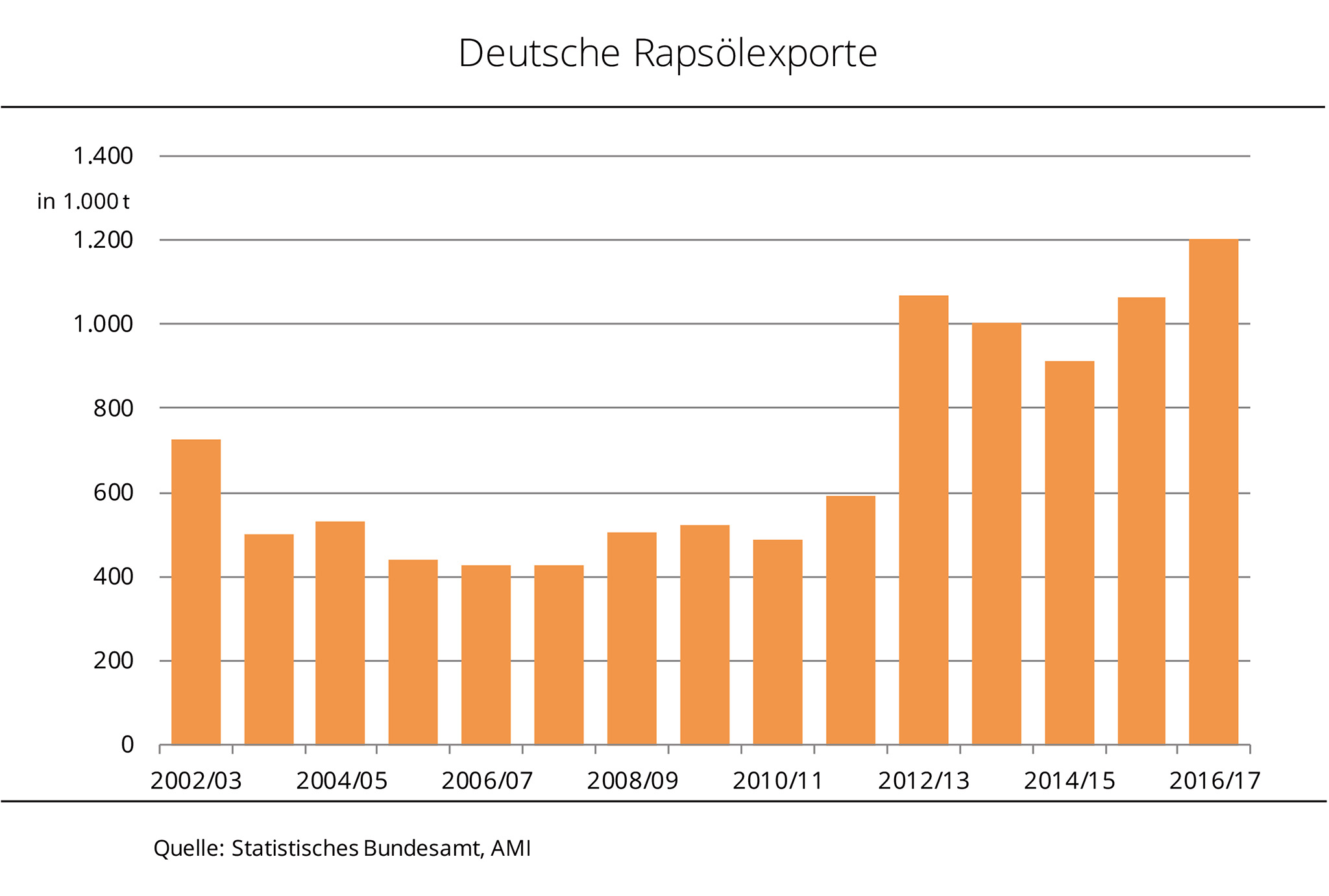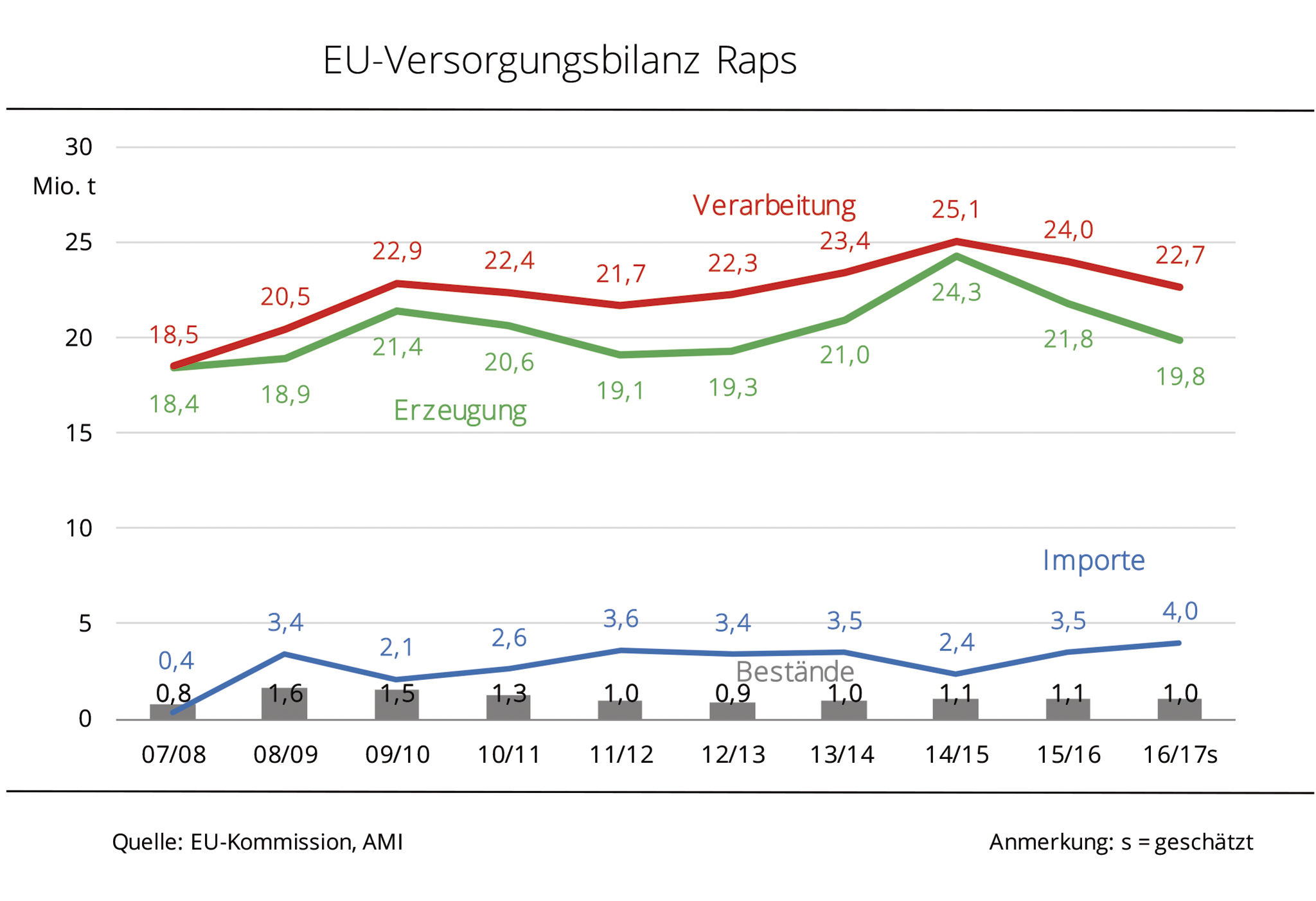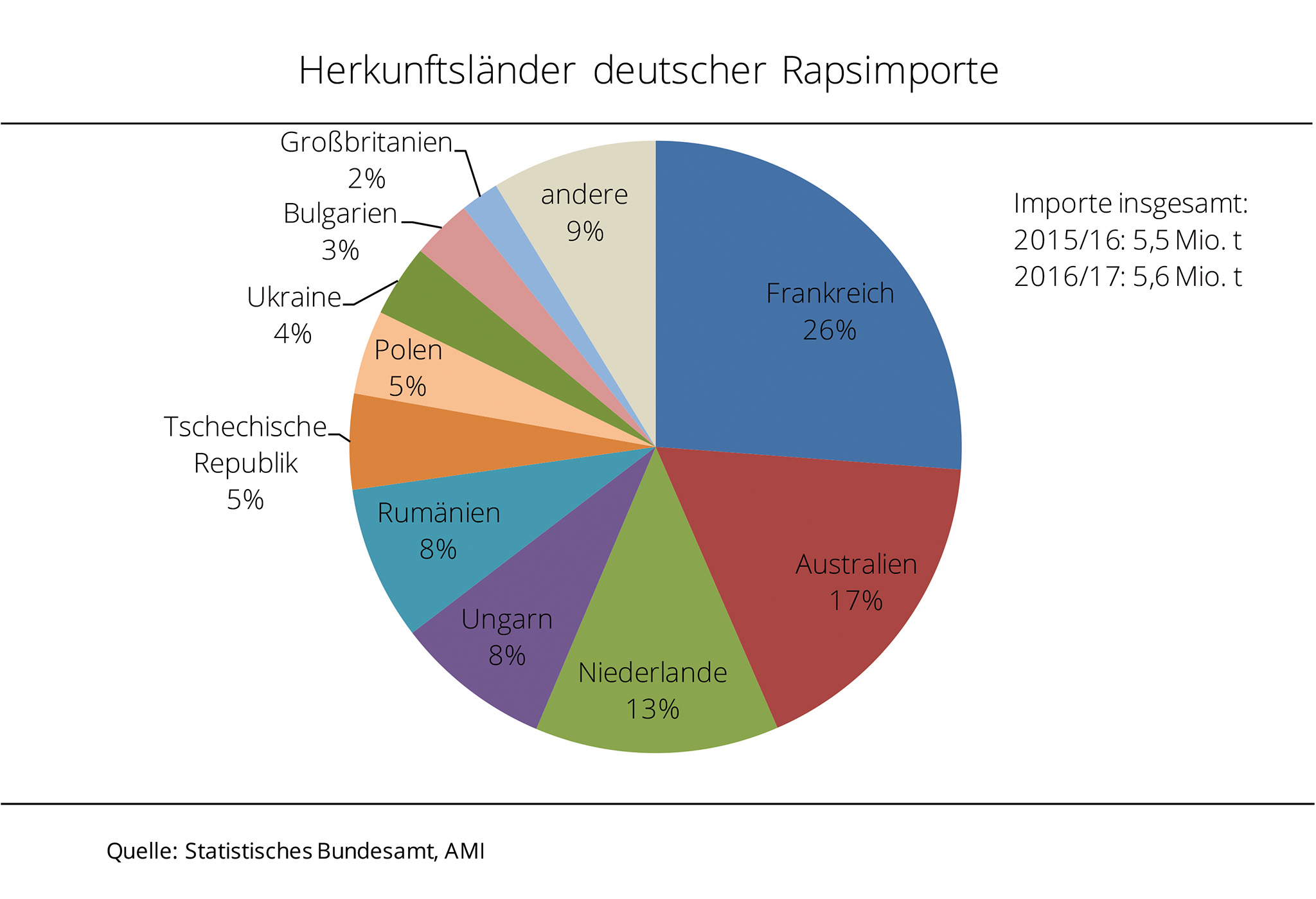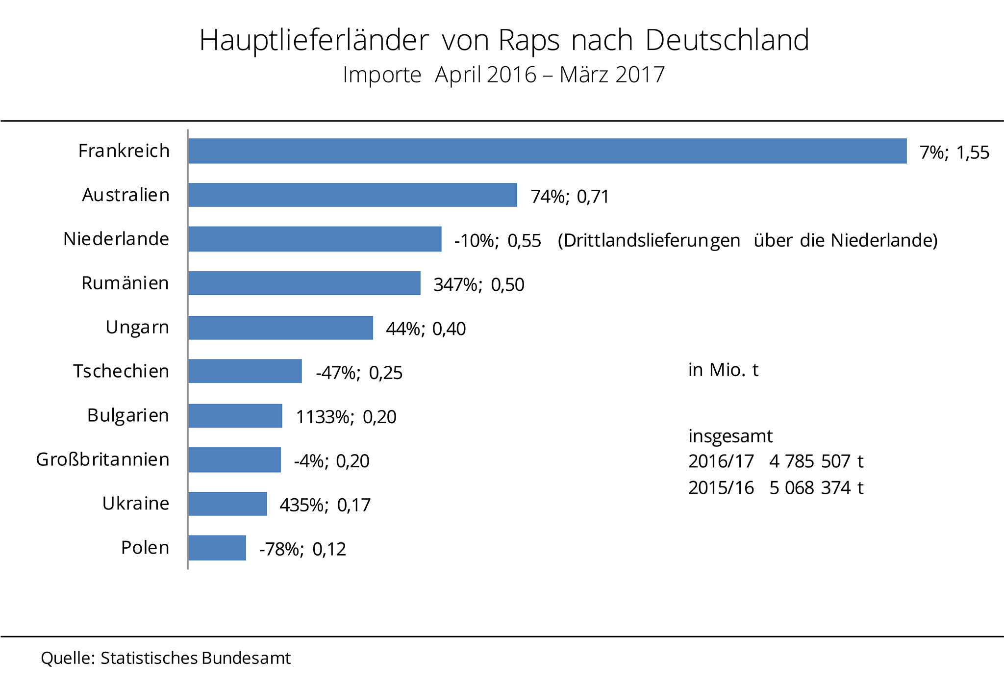 Die Rapsimporte sind nach Angaben des Statistischen Bundesamtes im Wirtschaftsjahr 2016/17 erneut gestiegen. Mit rund 5,6 Mio. t erreichten sie einen Rekordwert. Im Wirtschaftsjahr 2016/17 importierte die deutsche Ölmühlenwirtschaft 5,6 Mio. t Raps. Damit wurden rund 1 % mehr Raps eingeführt als im Vorjahr und somit so viel wie noch nie. Die größte Menge kam aus der EU-28, auch wenn der Anteil um fast 10-Prozentpunkte gegenüber dem Vorjahreszeitraum auf 77 % schrumpfte. Wichtigstes Lieferland war Frankreich mit 1,5 Mio. t; dies waren allerdings rund 17 % weniger als 2015/16. Auf Platz zwei folgte Australien. Der größte Drittlandlieferant exportierte rund 0,97 Mio. t Raps nach Deutschland. Nach Angaben der Agrarmarkt Informations-Gesellschaft mbH war dies ein Rekordwert und bedeutete eine Zunahme von fast 52 % gegenüber dem vorangegangenen Wirtschaftsjahr. Zusätzlich kam über die Niederlande mit rund 0,72 Mio. t knapp 7 % mehr Drittlandraps nach Deutschland. Den größten Zuwachs hatte allerdings die Ukraine zu verzeichnen. Das Land versechsfachte seine Rapslieferungen gegenüber dem Vorjahr auf 0,21 Mio. t und stellte als achtgrößtes Lieferland rund 4 % der Gesamteinfuhrmenge.