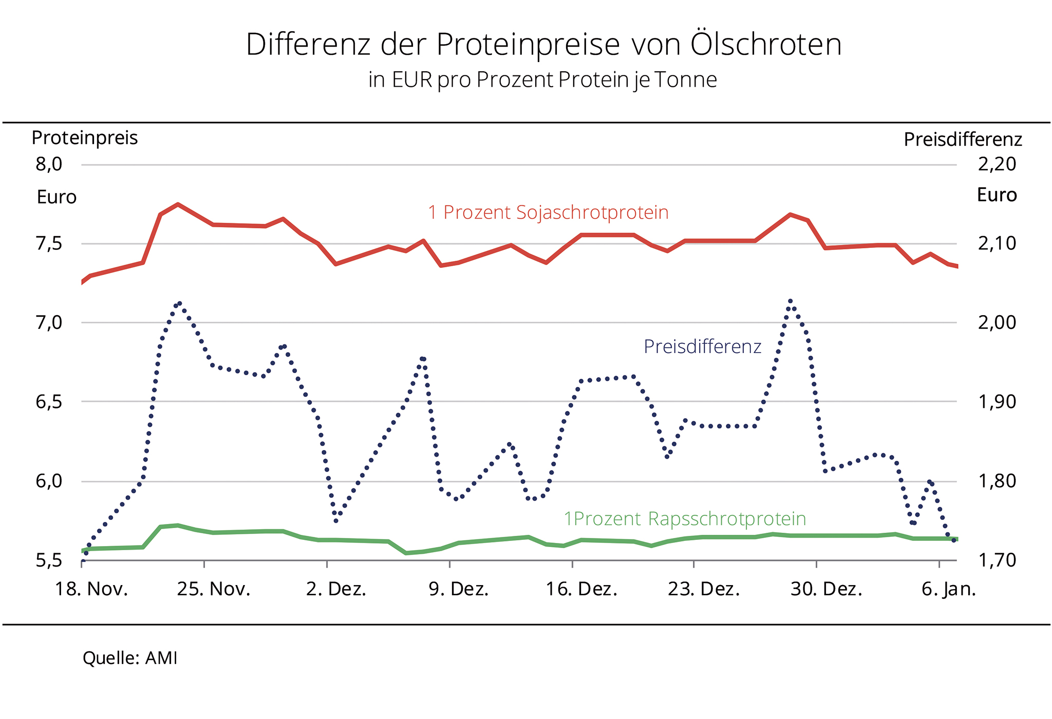 Die stabilen Preise der vergangenen Wochen sorgen weiterhin für einen Preisvorteil von Rapsschrot als Mischfutterbestandteil gegenüber Sojaschrot. GVO-freies Sojaschrot kostet trotz aktueller Preisschwäche immer noch deutlich mehr. Die Raps- und Sojaschrotpreise in Deutschland ab Ölmühle haben sich in den vergangenen Wochen wenig bewegt. Seit Anfang Dezember schwanken die Forderungen für Rapsschrot um 197 EUR/t. Damit liegt das Preisniveau gegenüber Vorjahreszeitraum mit einem Plus von 5 EUR/t nur unwesentlich höher. Sojaschrot wurde im Schnitt mit 348 EUR/t bewertet und ist damit 37 EUR/t teurer als vor einem Jahr. Diese geringen Preisschwankungen veränderten die Vorzüglichkeit von Raps gegenüber Sojaschrot kaum. Nach Angaben der Agrarmarkt Informations-Gesellschaft mbH lag der Preisvorteil in den vergangenen fünf Wochen bei durchschnittlich 1,86 Euro pro Prozent Protein. Die Nachfrage nach Rapsschrot in der Mischfutterherstellung ist aufgrund der insgesamt rückläufigen Mischfutterproduktion leicht zurückgegangen, im Gegensatz zum Sojaschrot, das rund 15 % weniger eingesetzt wurde.