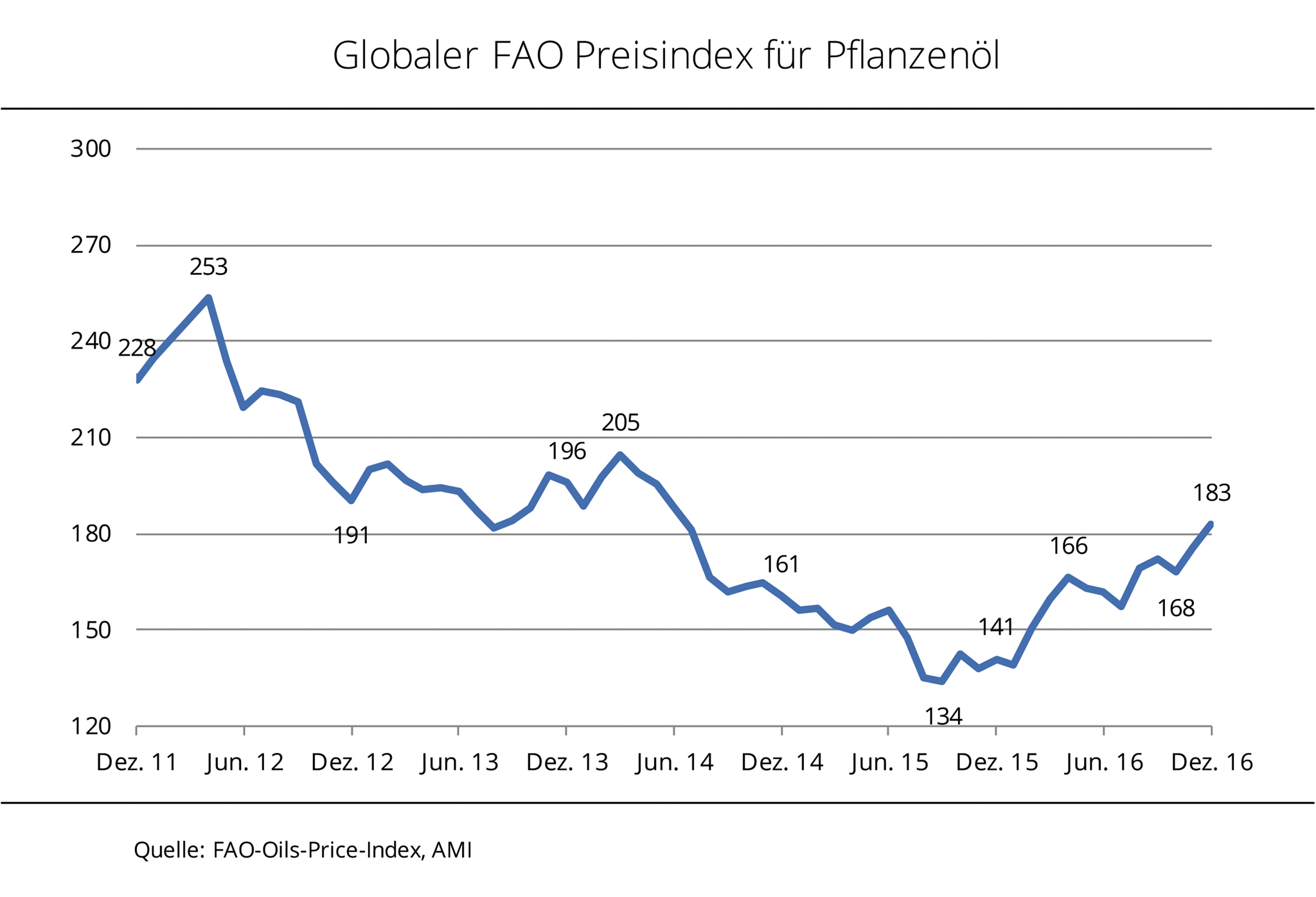 Der Pflanzenölindex der Ernährungs- und Landwirtschaftsorganisation der vereinten Nationen (FAO) hat im Dezember 2016 um über 4 % zugelegt und ein 3 Jahreshoch erreicht. Dennoch liegt er noch deutlich unter der Rekordmarke vom Januar 2011. Die Preise für Pflanzenöle sind in den vergangenen Monaten deutlich gestiegen. Im Dezember 2016 erreichte der Pflanzenölindex den höchsten Stand seit Juli 2014. Besonders die anziehenden Kurse für Palm- und Sojaöl sorgten im Verlaufe des vergangenen Jahres für Auftrieb. Die Palmölkurse profitierten von den geringen globalen Lagerbeständen und dem anhaltend knappen Angebot. Nach Angaben der Agrarmarkt Informationsgesellschaft mbH (AMI) hat sich die Sojaölnotierung auf Grund der zuletzt ungünstigen Witterungsbedingungen im wichtigen Exportland Argentinien und anziehender Nachfrage der Biodieselindustrie in den USA, Brasilien und Argentinien deutlich befestigt. Seit den Tiefstständen 2015 ist der FAO Preisindex, der die Preisentwicklung der 10 für den Welthandel bedeutendsten Pflanzenöle abbildet, um über 36 % gestiegen. Mit 183 Punkten lag der Index im Vergleich zum Vormonat rund 4 % und im Vorjahresvergleich knapp 30 % höher.