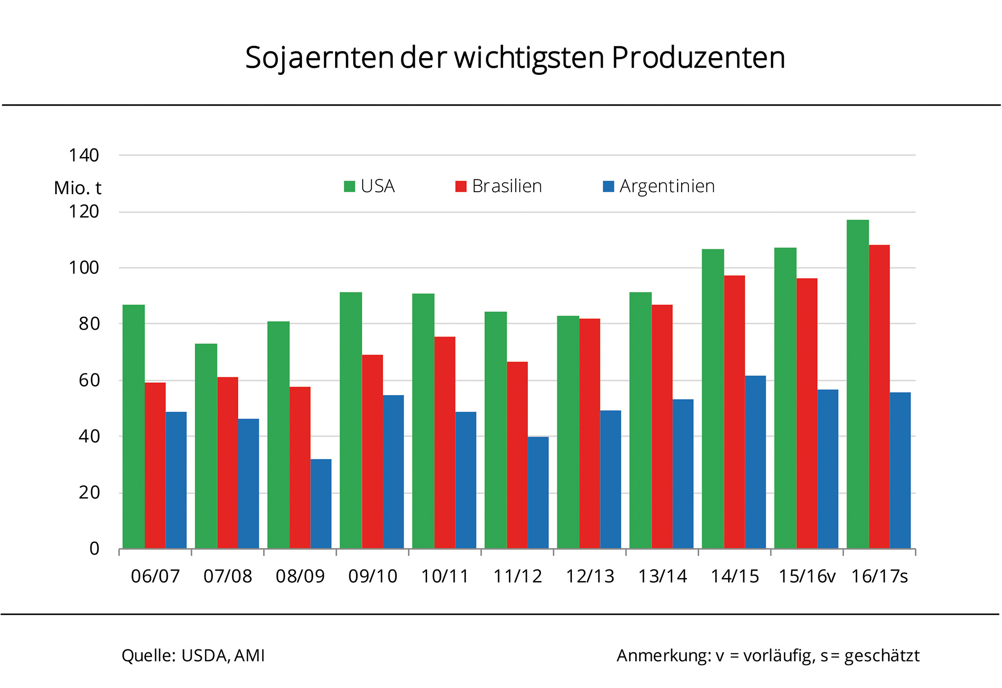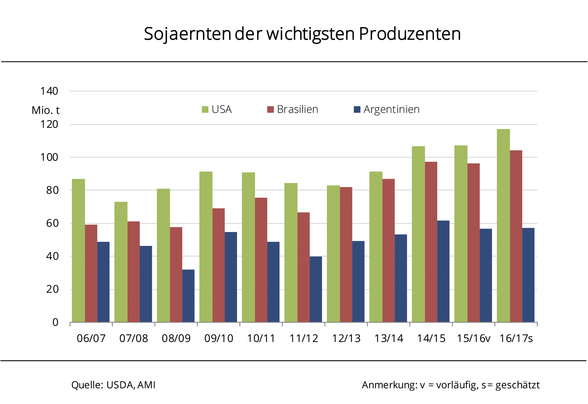 Das USDA prognostiziert für 2017/18 eine rückläufige globale Sojabohnenerzeugung. In Brasilien könnte der Rückgang deutlich ausfallen, während das Defizit in den USA und Argentinien nur gering ausfallen soll. Trotz seiner rückläufigen Schätzung der globalen Erntemenge blickt das US-Landwirtschaftsministerium weiterhin optimistisch auf die globale Sojaerzeugung 2017/18. Demnach erwarten die Agrarbehörden einen Rückgang der weltweiten Erntemenge von 7 auf 345 Mio. t. Grund hierfür ist nach Angaben der Agrarmarkt Informationsgesellschaft mbH (AMI) eine geringere Erzeugung in Brasilien. Mit 107 Mio. t schätzt das USDA die Ernte 2017/18 dort rund 7 Mio. t kleiner als im Vorjahr. Allerdings werden brasilianischen Sojabohnen erst Anfang 2018 geerntet. Somit handelt es sich um eine sehr frühe Schätzung, die im Jahresverlauf erheblich angepasst werden wird. Kaum weniger als im Rekordjahr 2016, gerade mal 1 Mio. t, werden mit 116 Mio. t in den USA erwartet, die damit weltweit größter Sojaerzeuger bleiben. Auf Platz 3 folgt Argentinien. Das USDA prognostiziert dort eine Ernte von 57 Mio. t, nur 0,8 Mio. t weniger als im Vorjahr.