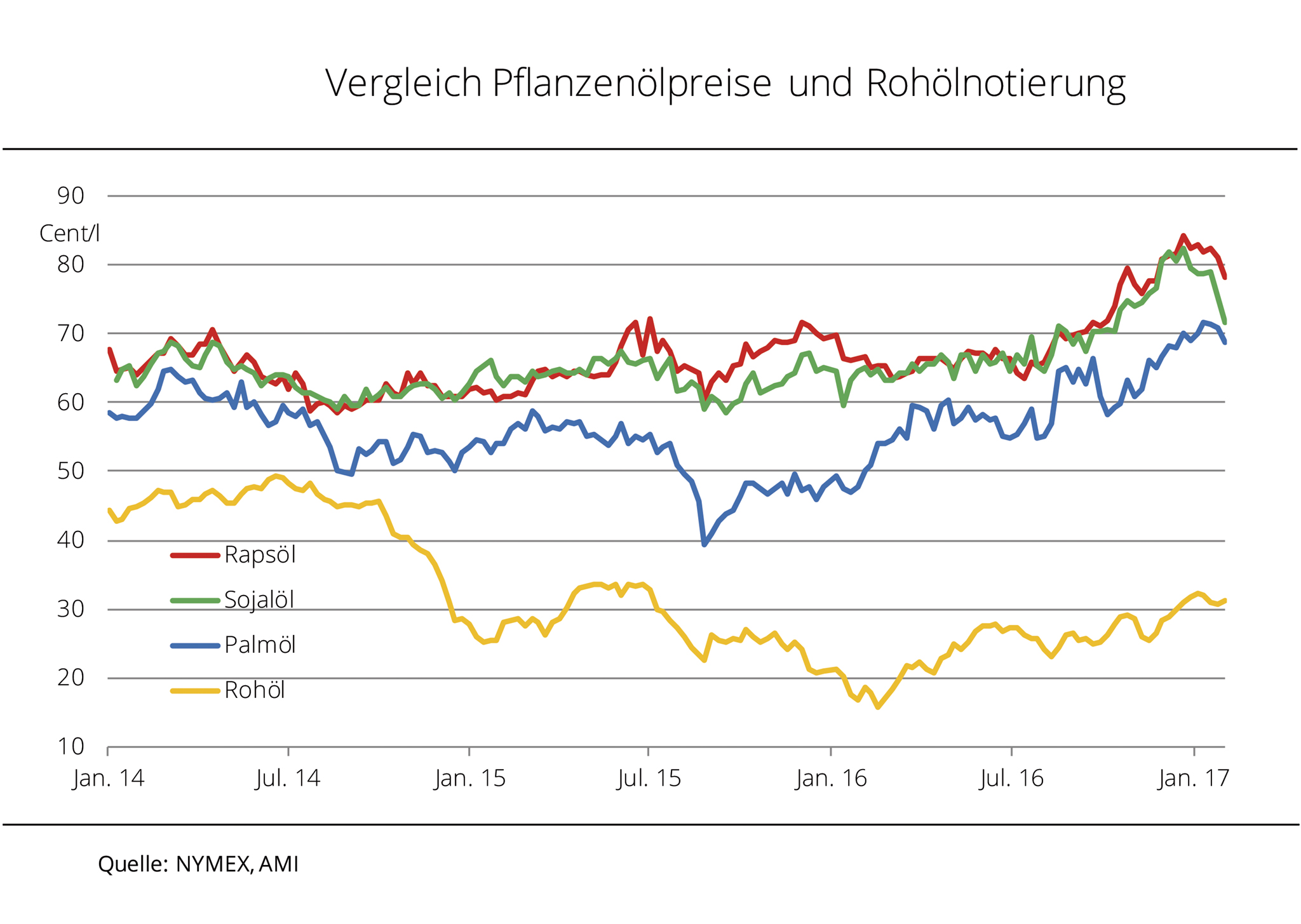 Preise für Pflanzenöle können hohes Niveau nicht halten. Üppige Versorgung, sinkende Nachfrage und fester Eurokurs sorgen für fallende Forderungen. Auf Grund des knappen Angebotes stieg der Palmölpreis seit Oktober 2016 um 18 %. Sojaöl profitierte in den vergangenen Monaten noch deutlich von der Unsicherheit über die Höhe der argentinischen Sojaerzeugung. Mit den günstigeren Witterungsbedingungen und der sich abzeichnenden Rekordernte in Brasilien konnten sich die hohen Preise nicht halten. Zudem ist durch die US-Umweltpolitik Trumps der künftige Einsatz von Sojaöl für die Biodieselherstellung ungewiss. Rapsöl, das im Zuge fester Rohstoffforderungen ebenfalls zulegte, kann sich nun auch nicht mehr halten. Nach Angaben der Agrarmarkt Informationsgesellschaft mbH (AMI) hat die Nachfrage in den vergangenen Wochen nach Pflanzenöl spürbar nachgelassen. Obwohl der feste Euro Importe in den Euroraum verbilligt, ist das Kaufinteresse gebremst. Damit hatten die fundamentalen Marktfaktoren mehr Einfluss auf die Pflanzenölpreise als die Rohölnotierung. Der WTI-Kurs ist seit Februar 2016 bis dato um über 70 % gestiegen.