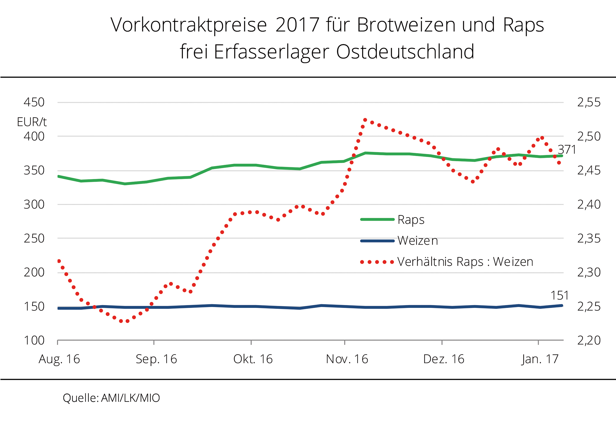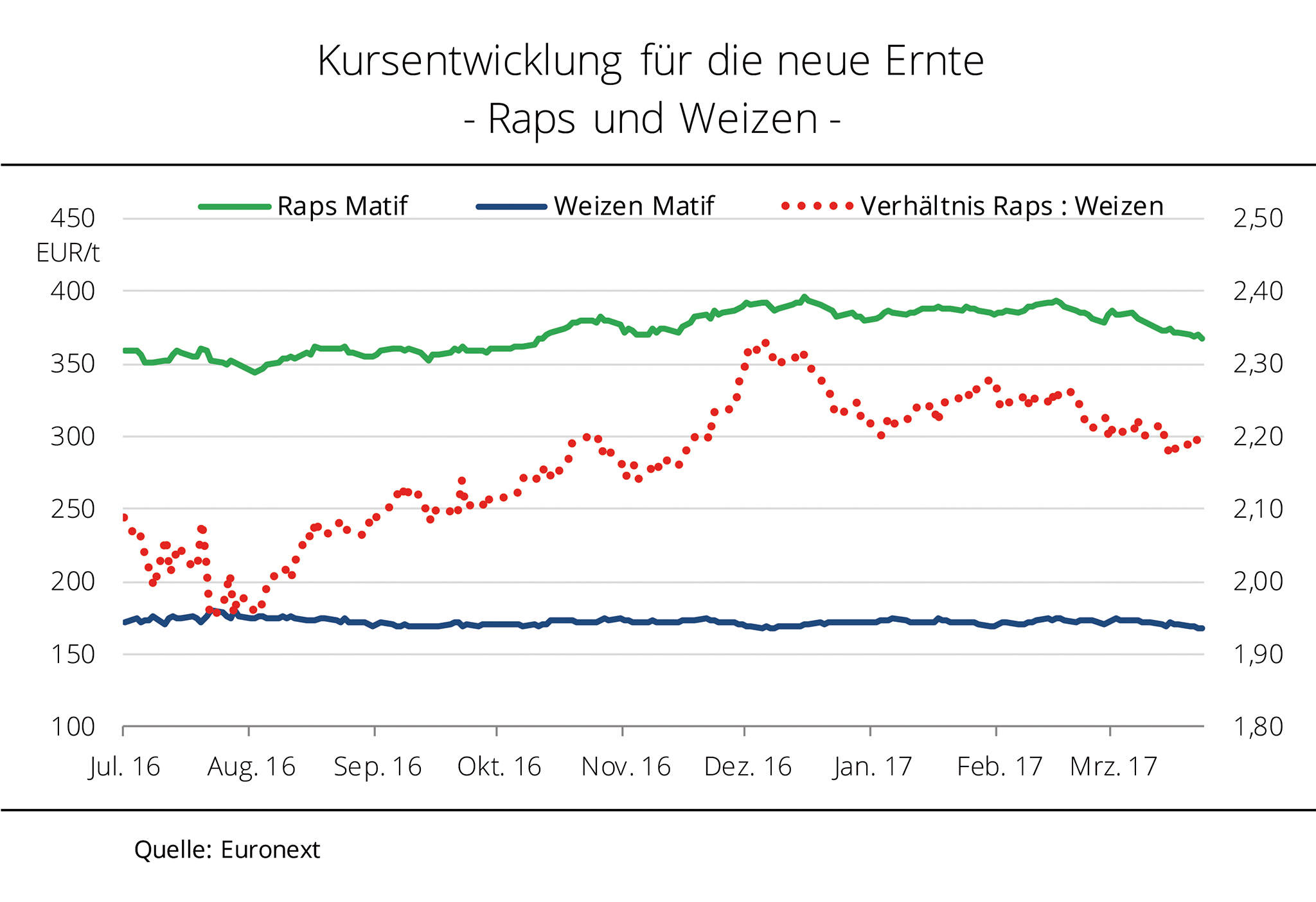 Das Verhältnis der Terminmarktnotierungen von Raps und Weizen ist im Verlauf des Wirtschaftsjahres 2016/17 kontinuierlich gewachsen. Zwischenzeitlich stiegen die Rapskurse auf das 2,3-Fache an. Die Terminmarktnotierungen von Weizen und Raps in Paris weisen für die neue Ernte 2017 einen sehr unterschiedlichen Verlauf auf. Während die Weizennotierungen unter dem Eindruck der üppigen globalen Versorgung einen sehr stabilen Verlauf auf relativ geringem Niveau gezeigt haben, sind die Rapskurse volatiler, allerdings auf deutlich höherem Kursniveau. So wurde Weizen ex Ernte 2017 zum Beginn des Wirtschaftsjahres 2016/17 mit rund 181 EUR/t bewertet. In der Zwischenzeit sind die Notierungen sukzessive auf aktuell 168 EUR/t gefallen. Das entspricht einem Abschlag von 7,3 %. Raps zur Ernte 2017 hatte seinen Tiefststand Anfang August 2016 mit 344 EUR/t erreicht und hat sich bis Mitte Dezember auf 397 EUR/t befestigt. Damit liegt die Differenz zwischen Höchst- und Tiefstkursen bei 53 EUR/t. Allerdings haben sich die Rapskurse auch in den vergangenen Monaten über der Marke von 380 EUR/t gehalten und sind nach Angaben der Agrarmarkt Informationsgesellschaft mbH (AMI) erst in den zurückliegenden Wochen durch die Rekordsojaernte in Südamerika und schwächere Rapsölpreise unter Druck geraten. Das Verhältnis zwischen den Raps- und Weizenkursen lag bis auf wenige Wochen im Juli 2016 immer über dem Faktor 2. Ende 2016 wurde die Tonne Raps sogar mit dem 2,3-Fachen des Kurses von Weizen bewertet.