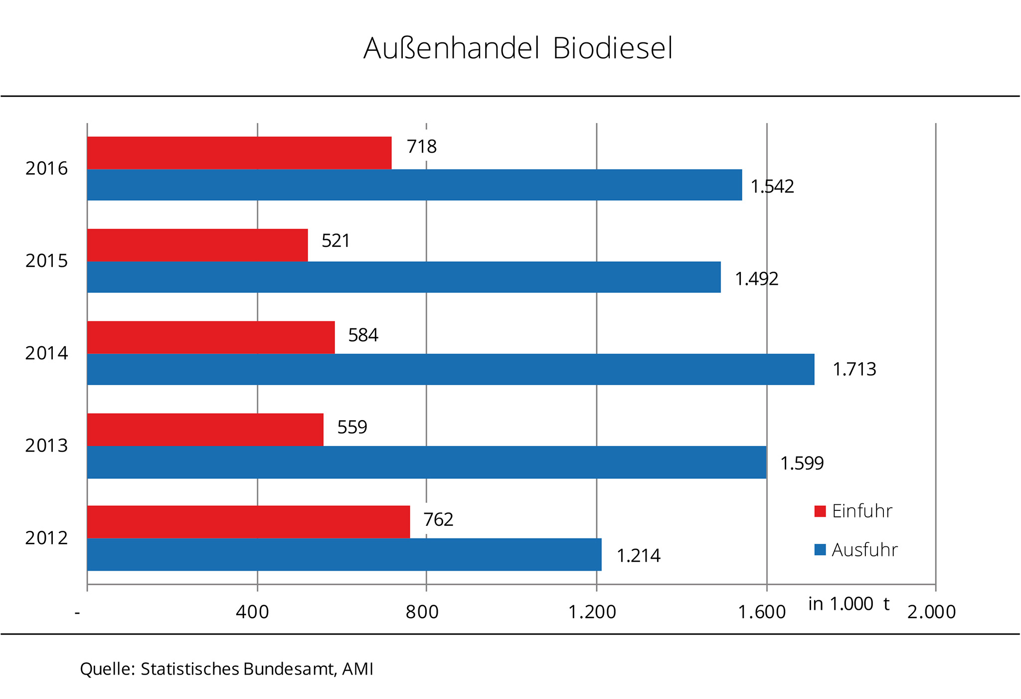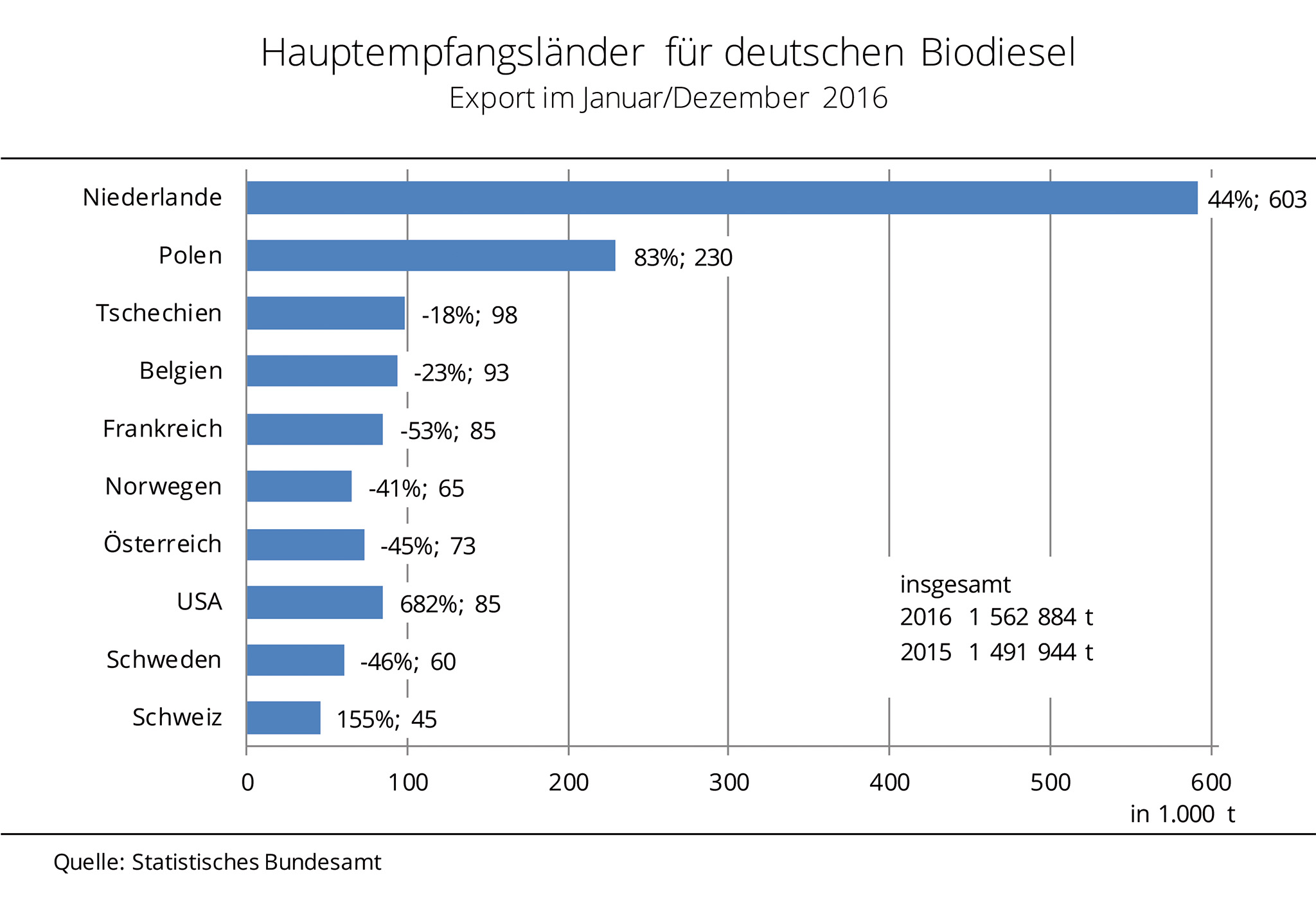 Im abgelaufenen Kalenderjahr 2016 stiegen die Biodieselausfuhren um 4,8 % von 1,49 Mio. t auf 1,56 Mio. t. Dabei gingen 87 % der Ausfuhren in die Länder der EU-28. Wichtigster Abnehmer für deutschen Biodiesel sind nach wie vor die Niederlande mit einem Zuwachs gegenüber Vorjahr von 44 % auf 0,6 Mio. t. Polen steigerte als zweitgrößter Nachfrager den Biodieselimport sogar um 83 % auf 0,23 Mio. t. Nach Angaben der Agrarmarkt Informations-Gesellschaft (mbH) reduzierten hingegen viele andere Länder der EU-28 den Import aus Deutschland. Mit 53 % fiel der Rückgang nach Frankreich am deutlichsten aus, aber auch Norwegen, Österreich und Schweden importierten über 40 % weniger gegenüber 2015. Deutlich dynamischer entwickelte sich der Handel von deutschem Biodiesel mit den USA. Hier verachtfachten sich die Exporte gegenüber dem Vorjahr, bewegen sich mit 85.000 t aber auf einem vergleichsweise niedrigen Niveau. Auch die Lieferungen in die Schweiz legten mit einem Plus von 155 % auf 45.000 t ebenfalls kräftig zu.