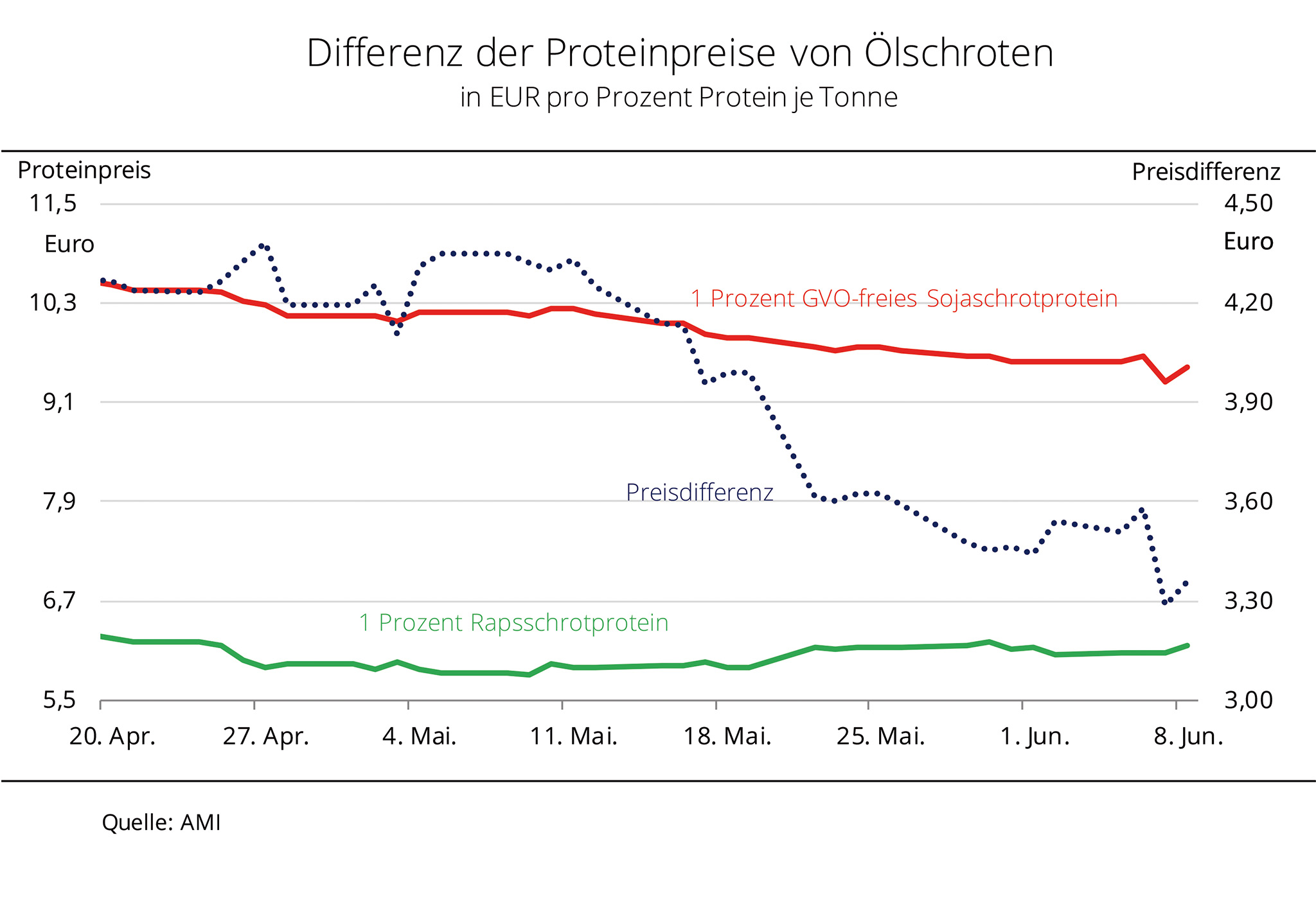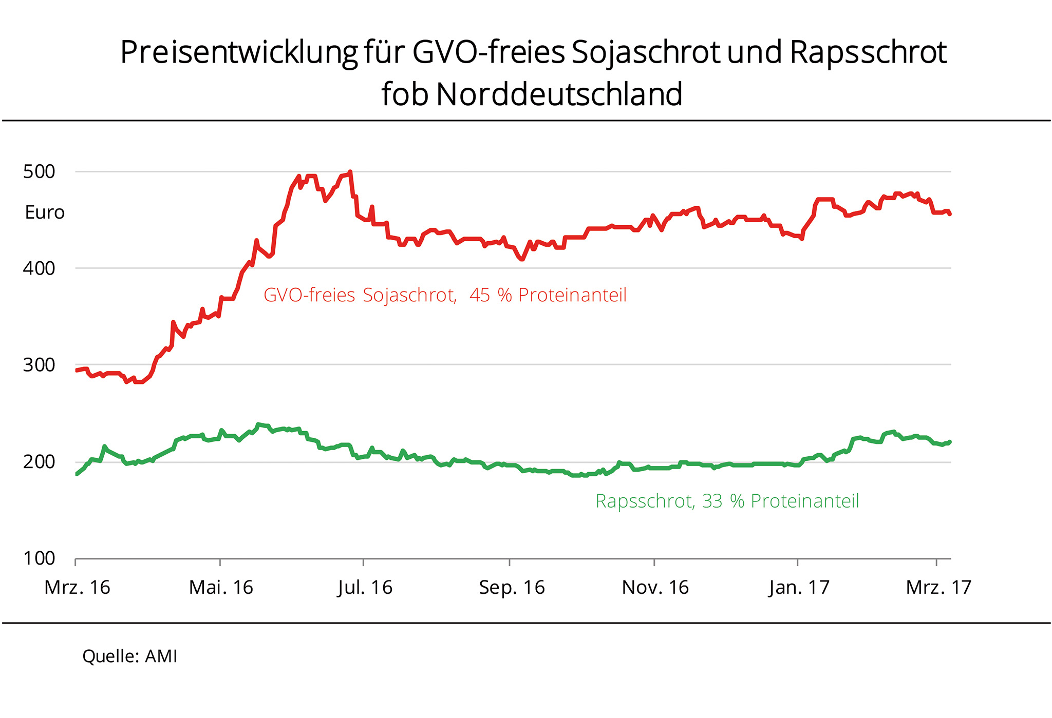 Die schwächeren Preise für GVO-freies Sojaschrot der vergangenen Wochen reduzieren den Preisvorteil von Rapsschrot als Mischfutterbestandteil gegenüber Sojaschrot. In den vergangenen Wochen sind die Preise für GVO-freies Sojaschrot in Deutschland kräftig gesunken. Das erhöhte Angebot an GVO-freiem Soja in Südamerika vermindert nach Angaben der Agrarmarkt Informations-Gesellschaft mbH (AMI) den Preisvorteil für Rapsschrot. So haben die Preise für GVO-freies Soja seit Ende April um rund 9 % nachgegeben und schwankten um 466 EUR/t. Die Preise für Rapsschrot sind hingegen in den vergangenen Wochen relativ stabil geblieben, sie lagen im Schnitt bei 211 EUR/t. Damit hat sich das Preisverhältnis zuungunsten von Rapsschrot verändert. Seit Mitte Mai sackte die Preisdifferenz kräftig ab und erreichte zuletzt sogar die Linie von 3,30 EUR/t. Das ist knapp 1 EUR/t weniger als noch vor einem Monat und so niedrig wie seit dem 25.05.2016 nicht mehr.