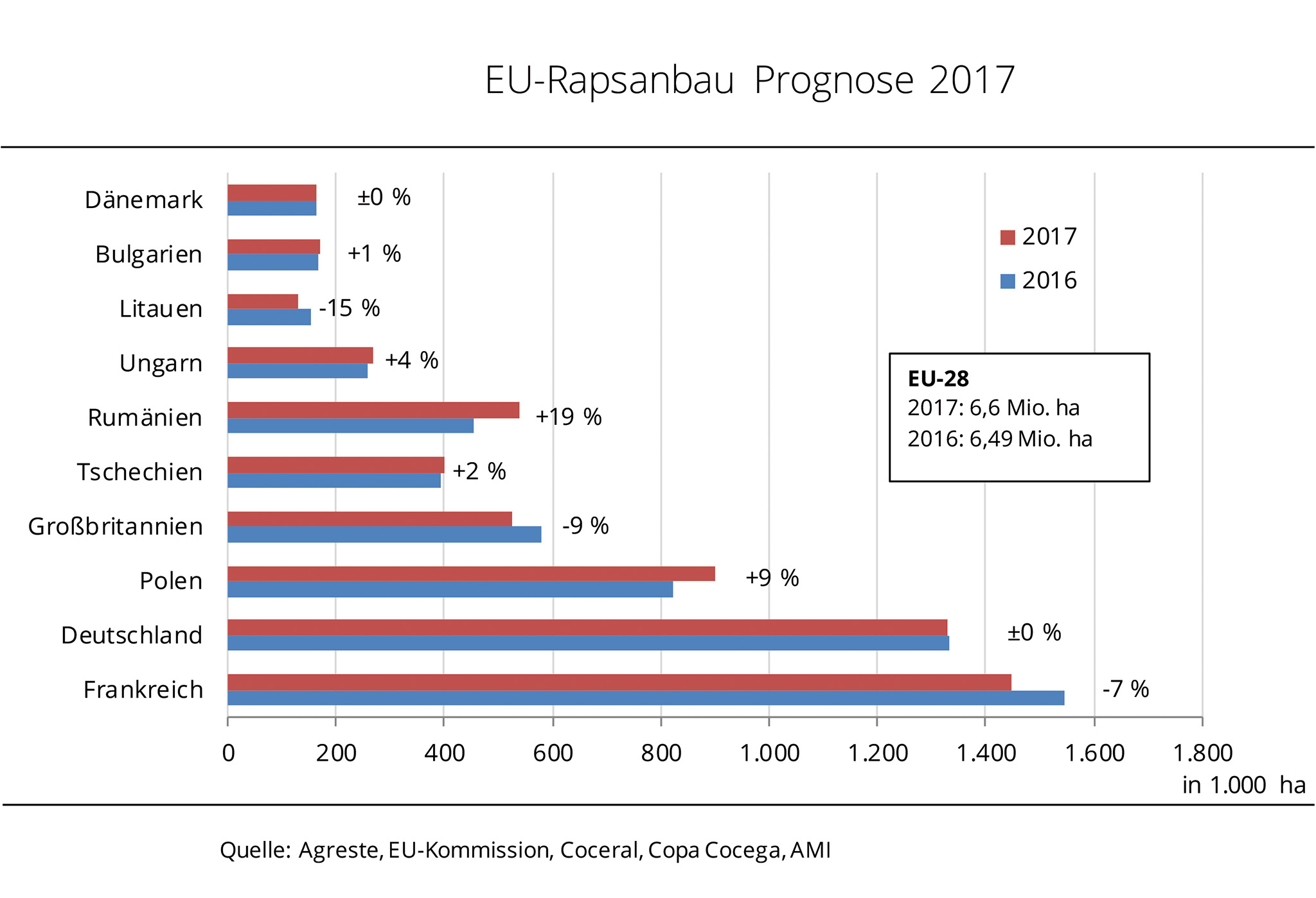 In der EU-28 stehen zur Ernte 2017 auf schätzungsweise 6,6 Mio. ha Winterraps. Das sind gut 100.000 ha mehr als im Vorjahr.